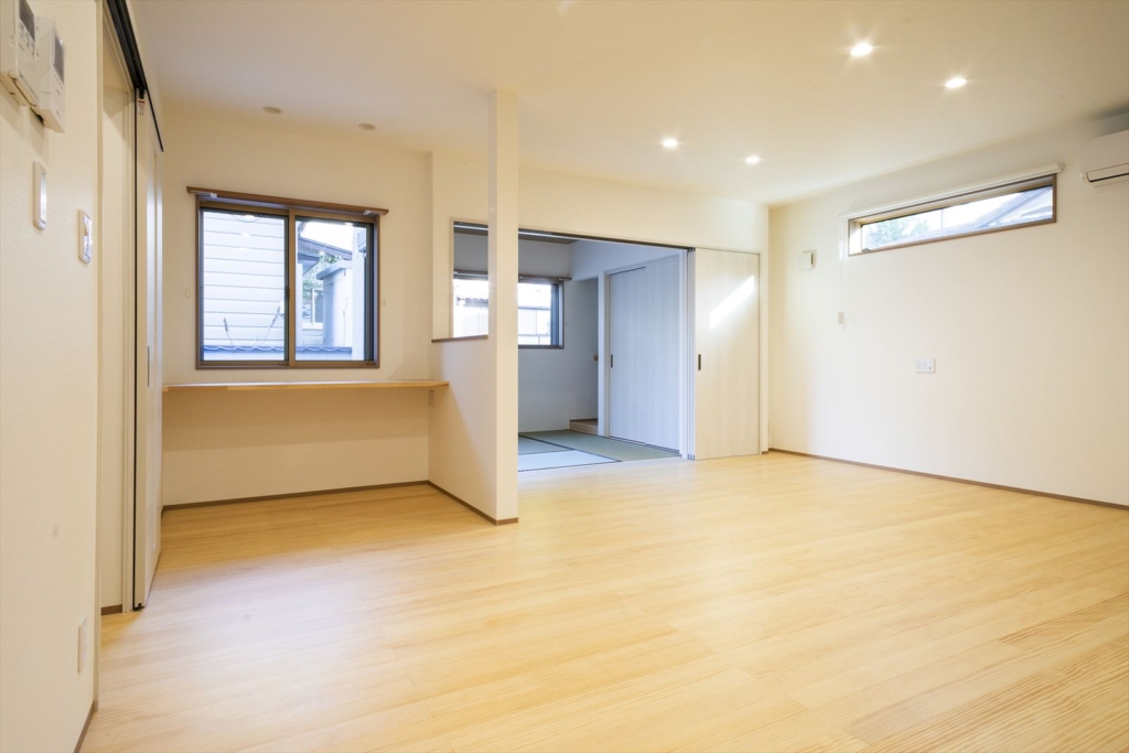 白い外壁にオレンジ色の屋根瓦が、印象的な南欧風住宅。白を基調とした壁紙とナチュラル色の無垢フローリング「ピノアース」が癒しの空間を演出しています。