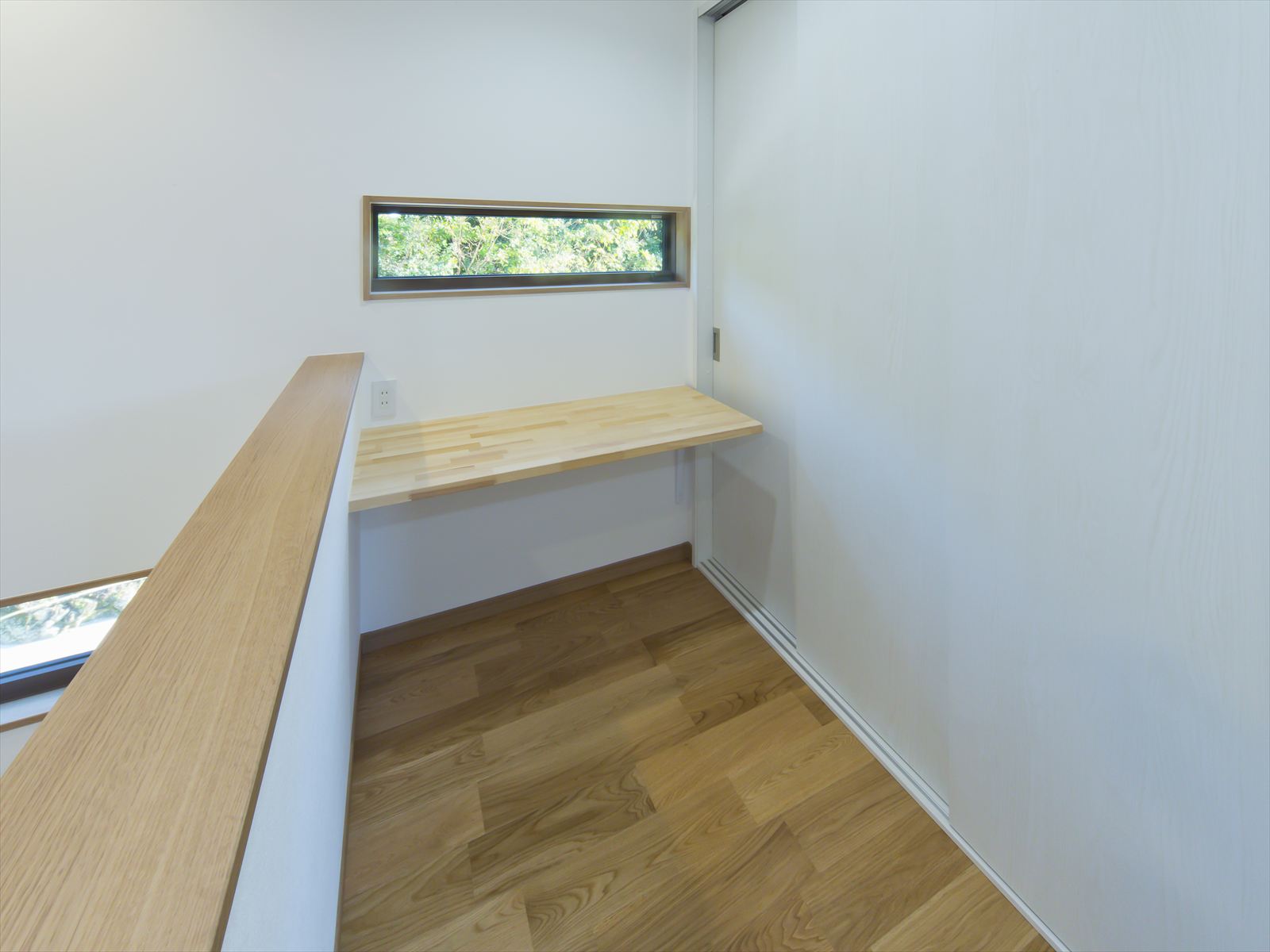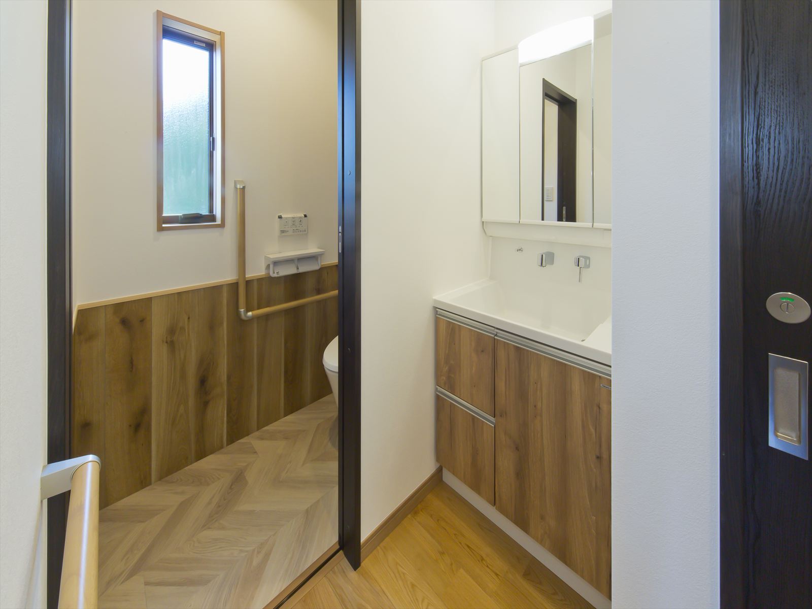 親子3世代で暮らすK様邸は、家じゅうに家族の思いがこめられています。まず、玄関には靴の脱ぎ履き時に腰かけられるベンチと手摺があります。中へ入るとLDKには、間仕切りのない3畳の畳コーナーが設けて、家族の集合場所として十分な広さを確保しました。また、1階にある祖父母世帯の個室までの廊下やトイレ・脱衣室など手摺を取り付けています。2階では、スライド引戸で間仕切ることができる子供部屋やたくさんの本を収納し、すぐに取り出して読むことができるライブラリースペースなどがあります。