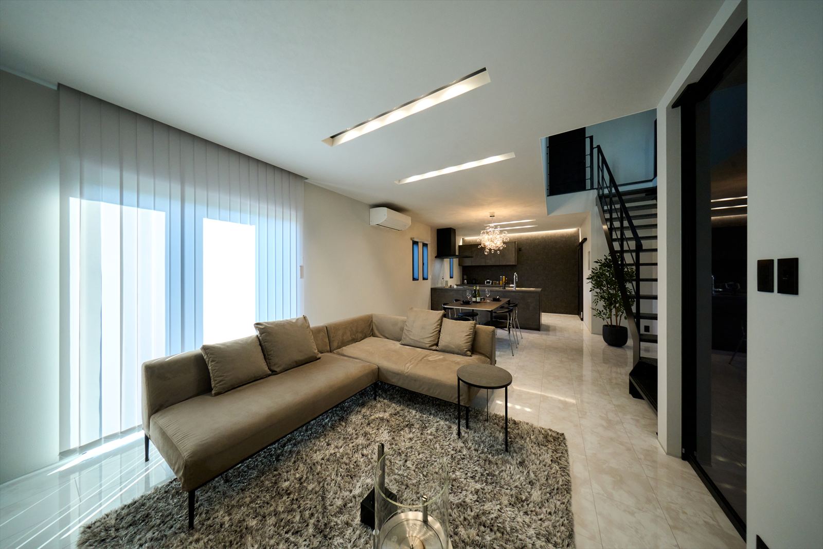 大村湾のすぐそばに建つ美容室併用住宅。外観・内観ともに洗練されたモノトーンでまとめ上げられギャラリーのような美しさ。大理石を敷き詰めたかのようなリビングの床材は、ダイケンのハピアフロア(ホワイトオニキス柄)を採用しており、システムキッチンやフレーム階段とのバランスは、大人の上質な印象を与えてくれています。さらに店舗・リビング・トイレなどの間接照明から放たれる柔らかな明かりは、リラックス空間を演出しており、居心地の良さを感じるデザインです。