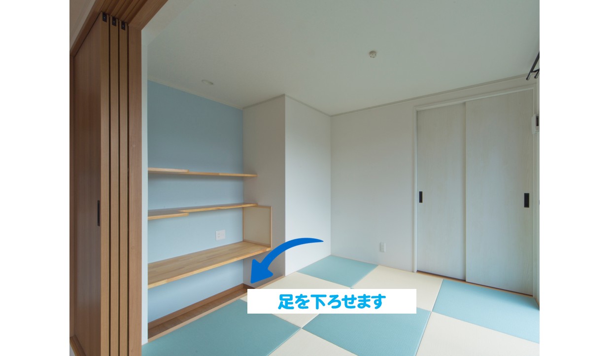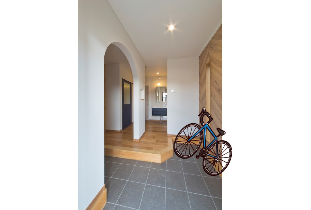 スライド式の玄関ドアを開けて中へ入ると広いシューズクロークを備えた玄関土間があり、ご主人様の趣味の自転車やベビーカー・アウトドア用品などを収納することができます。玄関ホールの奥には、洗面台が配置されているので、帰宅後すぐに手洗いができ、その奥のランドリースペースへの直行も可能な間取りになっております。リビングへ入ると壁掛けテレビの設置スペースに作られた造作家具やキッチンカウンターの収納棚・小上がり和室の下の引き出し式収納など工夫が、いっぱいです。小上がりの和室には、その高さを利用して足をおろして座れるワークスペースを確保し、壁にはマグネットクロスで作った掲示板もあります。キッチンに立つと左側には、三角屋根のような開口があり、開口の向こう側にはパントリー、その向こう側にはランドリースペースがあり無駄のない家事動線は、家族の負担を軽減してくれることでしょう。