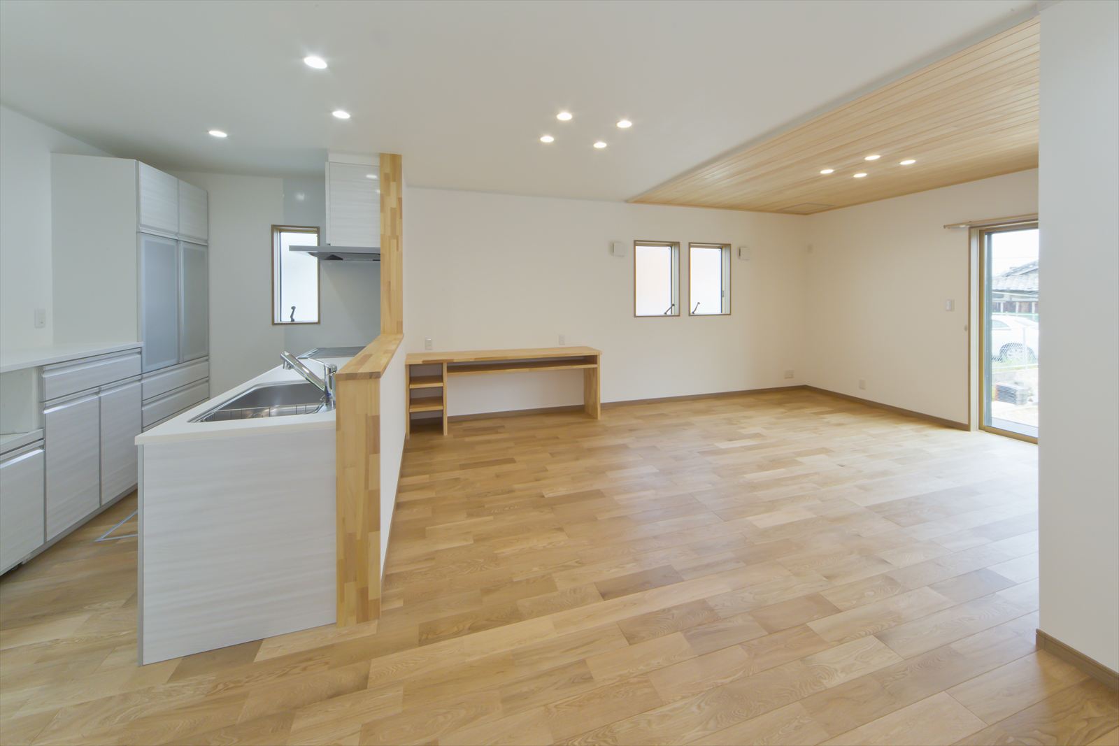 玄関ドアを開くと、まっすぐに奥へと延びる廊下が、この家の広さを感じさせます。玄関に入り右側にあるヒノキの引戸は和室へとつながり、左側には、廊下からも出入りができるシューズクロークを配置しています。廊下の突き当りにあるドアを開くと、そこは「ナラ」フローリングが眩しい19帖のLDKが広がっておりリビングはヒノキの天井。そのリビングにあるヒノキ材で作った建具をスライドさせると和室とフラットにつながることができます。和室は、リビングの一部として、また個室としても利用できるのでライフスタイルの変化に対応してくれる空間となってくれることでしょう。