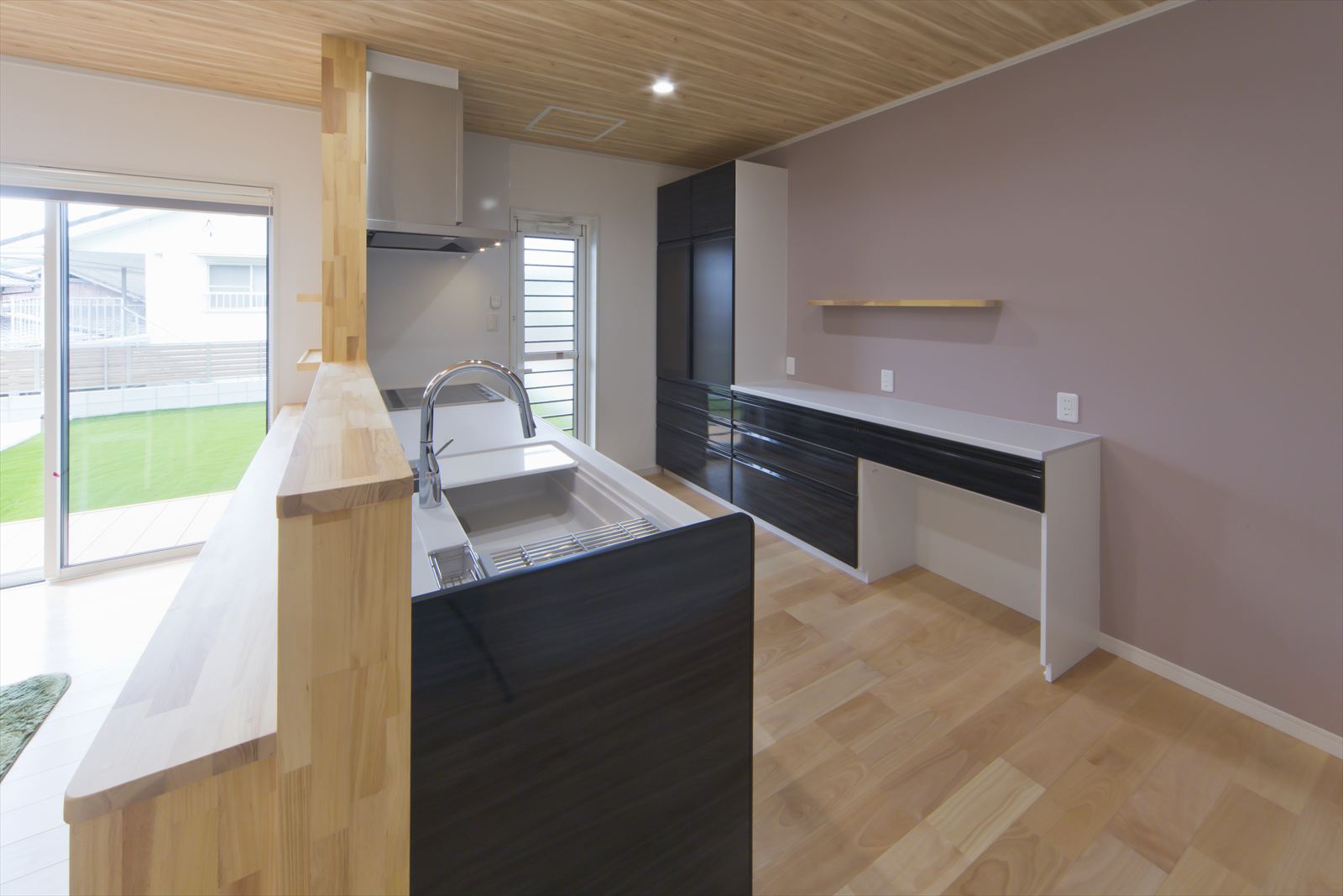 どのスペースを見ても造作棚があるH様邸。何度もお打ち合わせを繰り返してライフスタイルに合わせた収納棚を設計いたしました。玄関土間続きのシューズクロークには、可動棚だけではなく傘立てやコート掛けスペースが確保されています。リビングに入ると正面には、長いカウンターのスタディーコーナーがあり、その壁にはマグネットクロスで作った掲示板が取り付けられていて、学校からのお知らせやお絵描き作品などが賑やかに掲載されていくことでしょう。そして、洗面室には天井まである可動棚と作業台のある収納。洗濯脱衣室にはカウンター付き収納棚など、どこを見ても物をしまうためだけの収納ではなく、動線やライフスタイルを考えた造作棚がいっぱい。また、階段下スペースを使って作られたコンクリート打ち放しの柄のアクセントクロスが素敵な趣味のお部屋の長いカウンターも、これからの楽しい時間を想像してしますよね。
