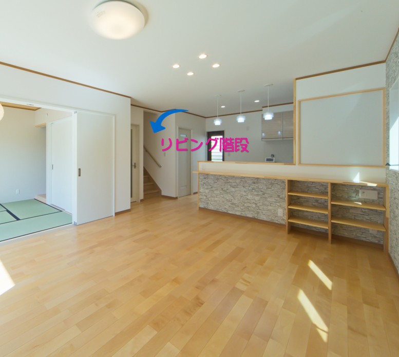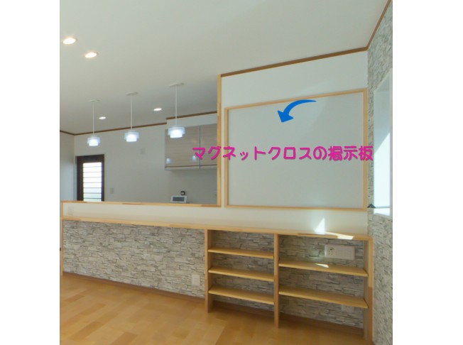 クリーム色とテラコッタ色の外壁が、どこかプロバンスを感じさせる外観。玄関ドアを開くと左側には、シューズクロークへとつながる片引き戸があり、その中は最小限の奥行で最大限の収納力を確保しました。シューズクロークの奥には、玄関ホールへつながる扉があるので動線もスムーズ。南向きで明るいリビングは、自然石のタイルを積み上げたような壁紙が印象的ですが、キッチンカウンターに造作された可動棚とその上部にあるマグネットクロスの掲示板は、家族のコミュニケーションアイテムとして大切な役割を持つことでしょう。リビングとフラットにつながる和室は、3枚のスライドドアにより個室としても利用することが可能です。プライベートルームのクローゼットは、可動棚とハンガーパイプを備え、ウォークインクローゼットには、作業用カウンターを備えた造りとなっています。