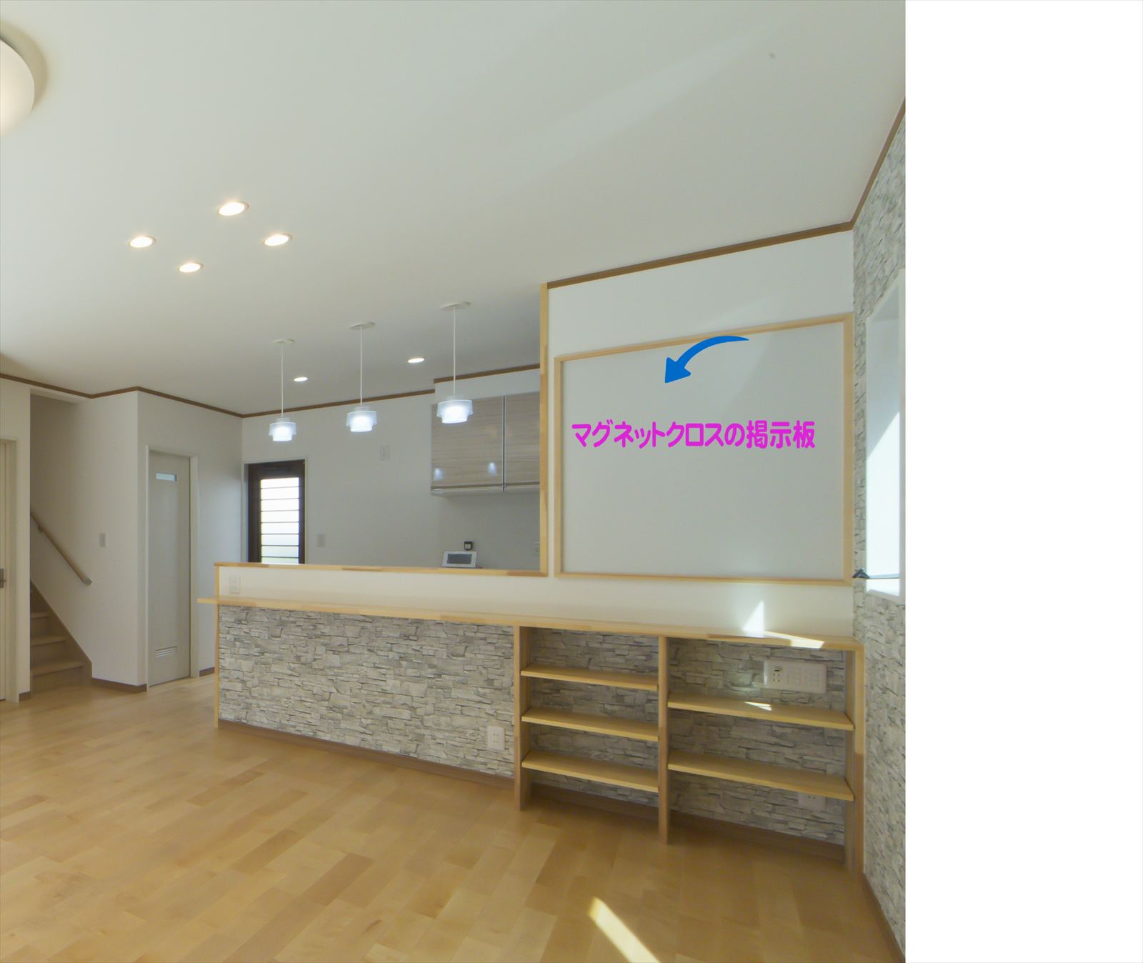 クリーム色とテラコッタ色の外壁が、どこかプロバンスを感じさせる外観。玄関ドアを開くと左側には、シューズクロークへとつながる片引き戸があり、その中は最小限の奥行で最大限の収納力を確保しました。シューズクロークの奥には、玄関ホールへつながる扉があるので動線もスムーズ。南向きで明るいリビングは、自然石のタイルを積み上げたような壁紙が印象的ですが、キッチンカウンターに造作された可動棚とその上部にあるマグネットクロスの掲示板は、家族のコミュニケーションアイテムとして大切な役割を持つことでしょう。リビングとフラットにつながる和室は、3枚のスライドドアにより個室としても利用することが可能です。プライベートルームのクローゼットは、可動棚とハンガーパイプを備え、ウォークインクローゼットには、作業用カウンターを備えた造りとなっています。