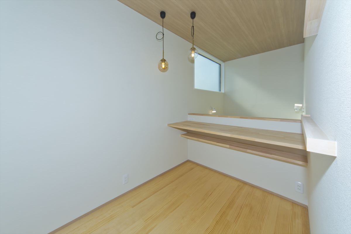 1階の畳スペースの天井高を通常より低く設計し、その上階にフリースペースを設けたスキップフロア。スキップフロアは限られた敷地面積の中で床面積を広げることができる人気の間取りです。リビングには、大きな吹き抜けがあるので、中二階であるフリースペースが孤立することなく、リビングの家族とコミュニケーションをとることができます。また、キッチンの奥にはパントリー、玄関奥にはシューズクロークなど、収納も充実しております。