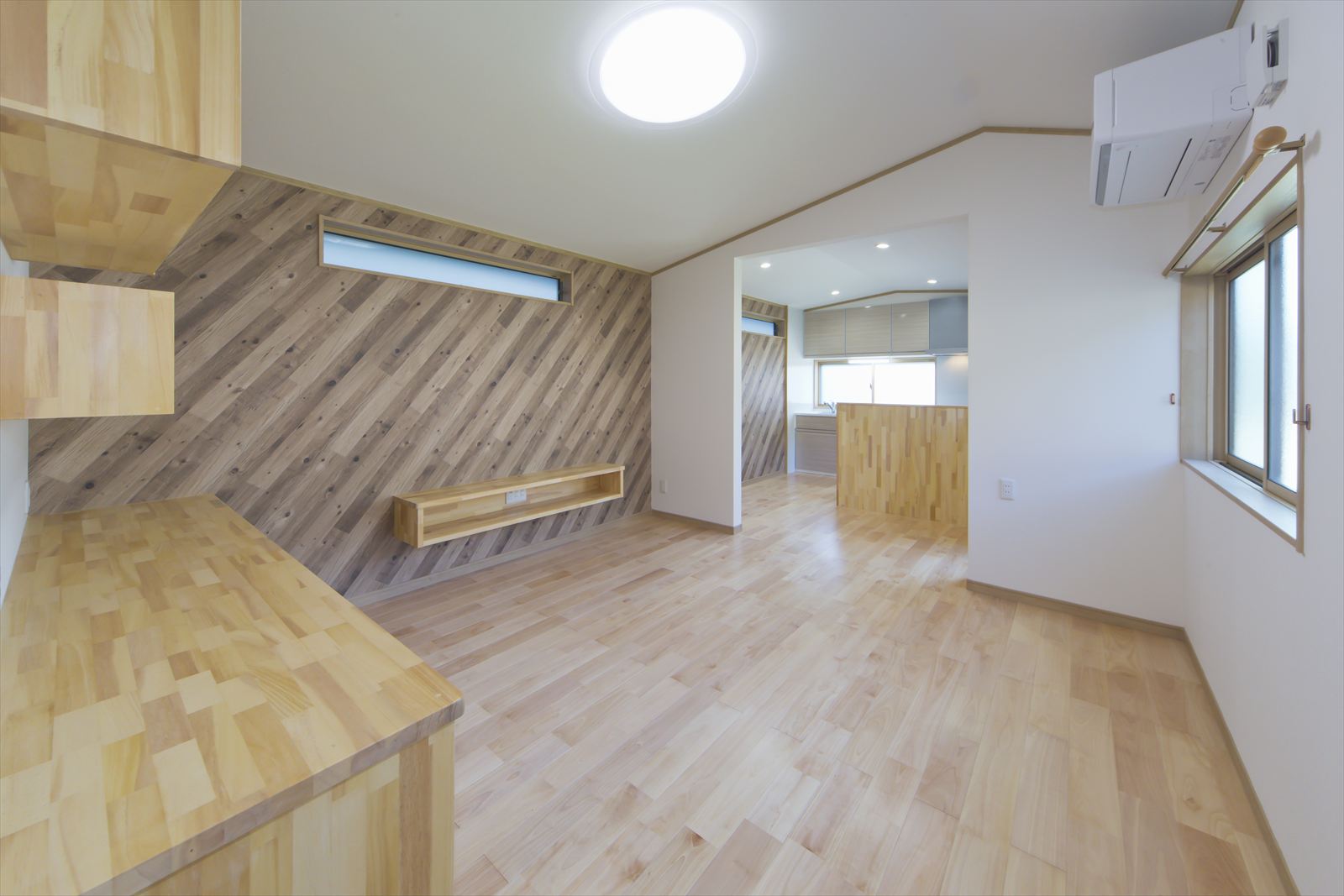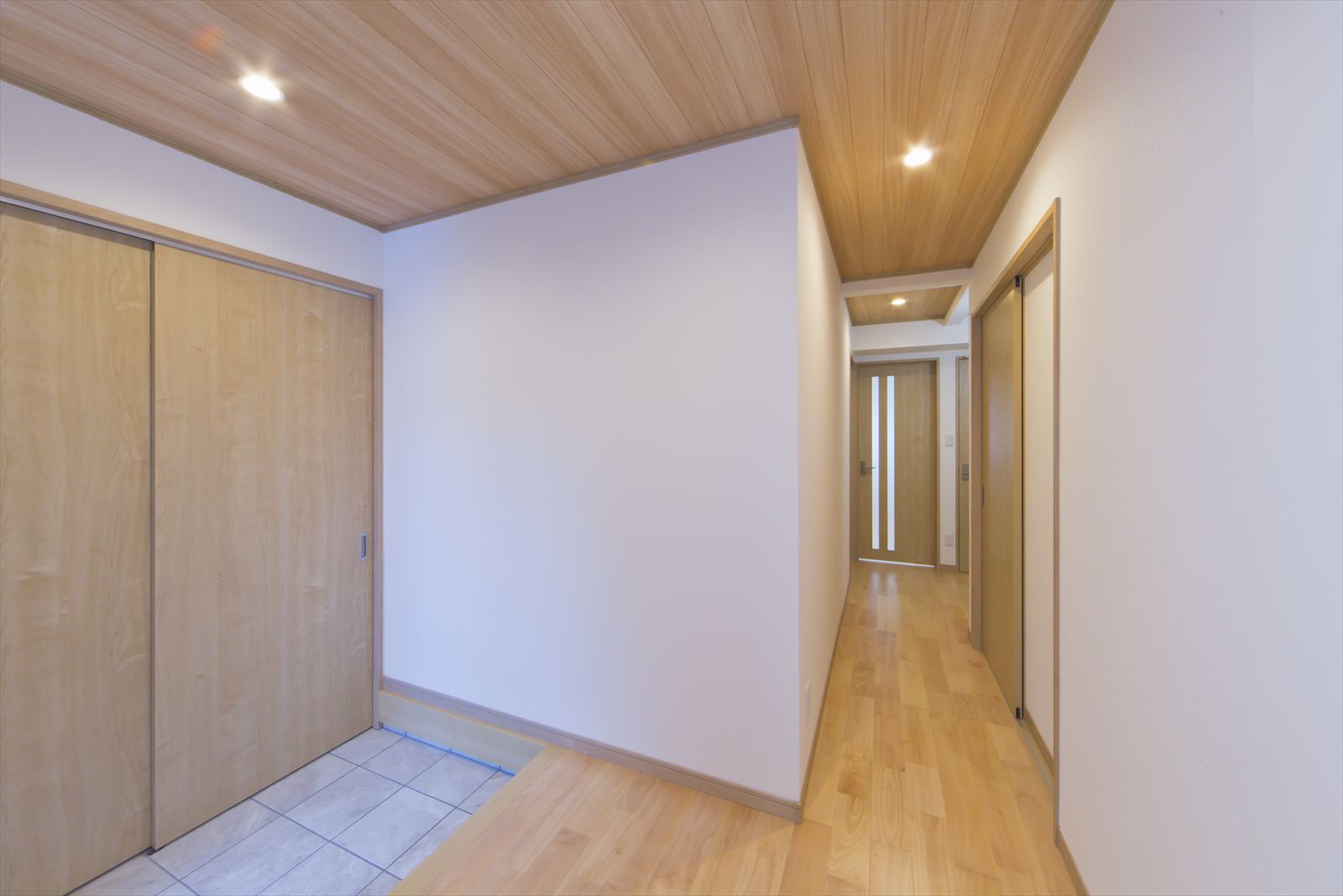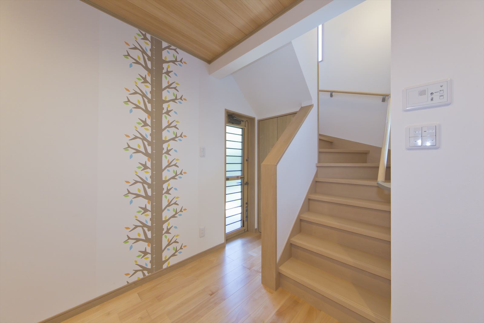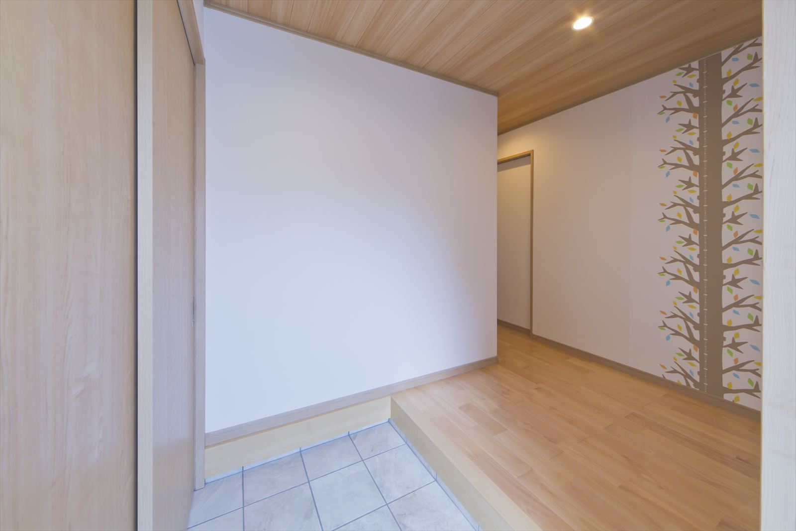 リフォーム工事により外観・内観ともに新しくなったこちらのお宅は、新築住宅そのもの。玄関ドアを開くと奥へ長い土間スペースがあり、そこにあるスライドドアの中はシューズクロークとなっています。正面には、木の枝をモチーフにした身長計付き壁紙が貼られており、これからのお子様の成長を見守ってくれることでしょう。室内に入り長い廊下の先は、LDKスペース。キッチンは、窓側に据え付けているので手元が明るく調理も快適。使い勝手を重視した、キッチンカウンターやリビング・洋室のオリジナル造作家具も見どころです。