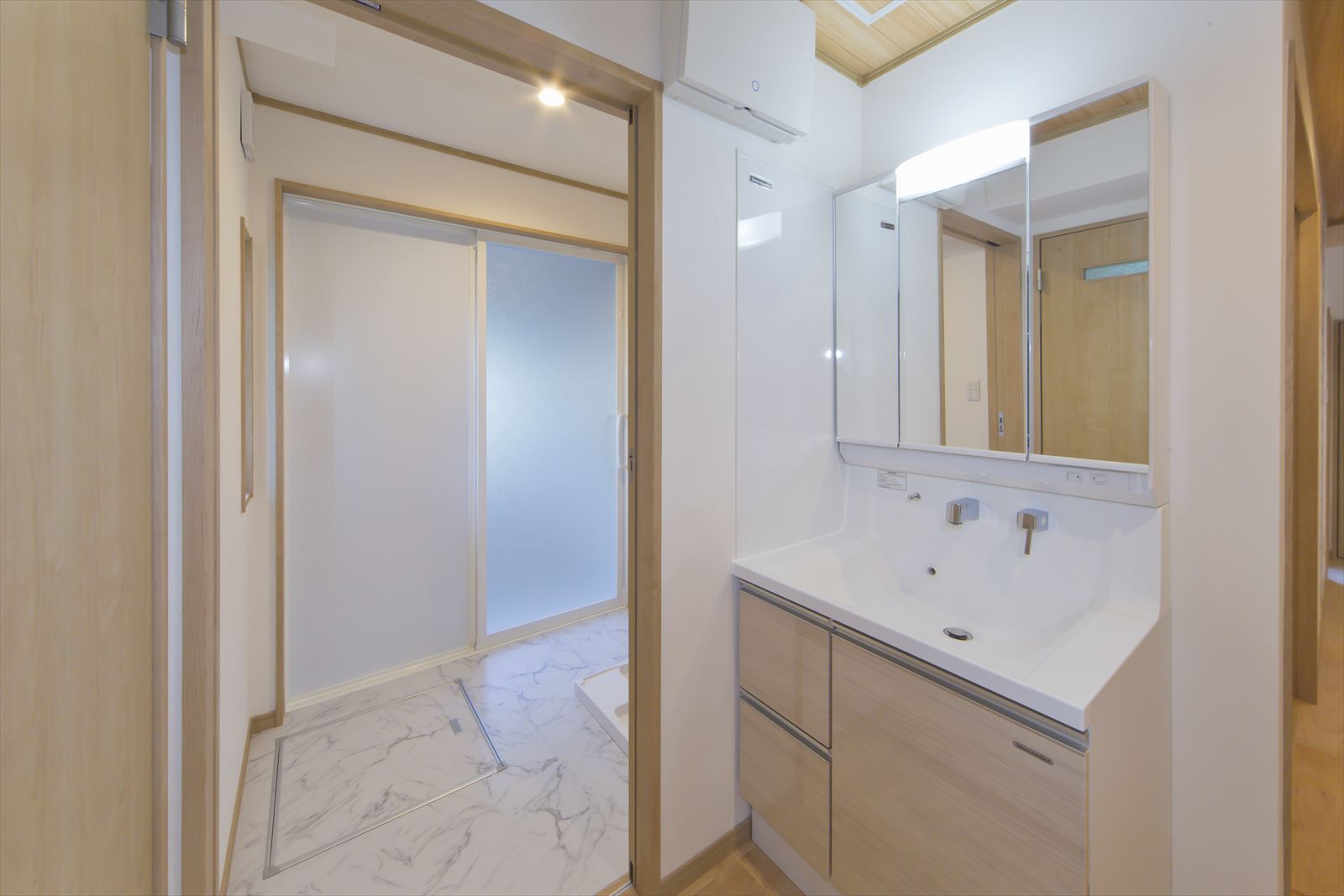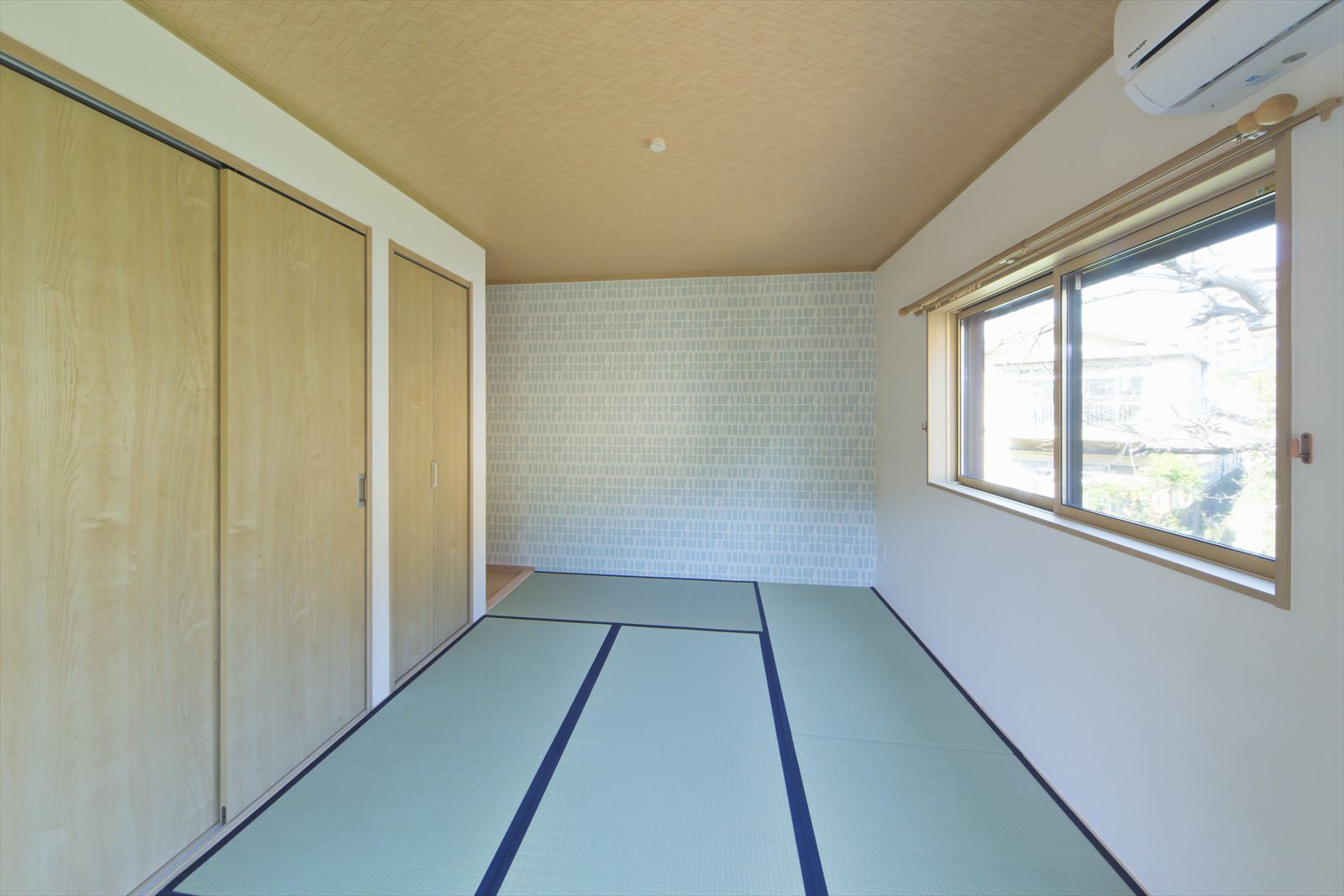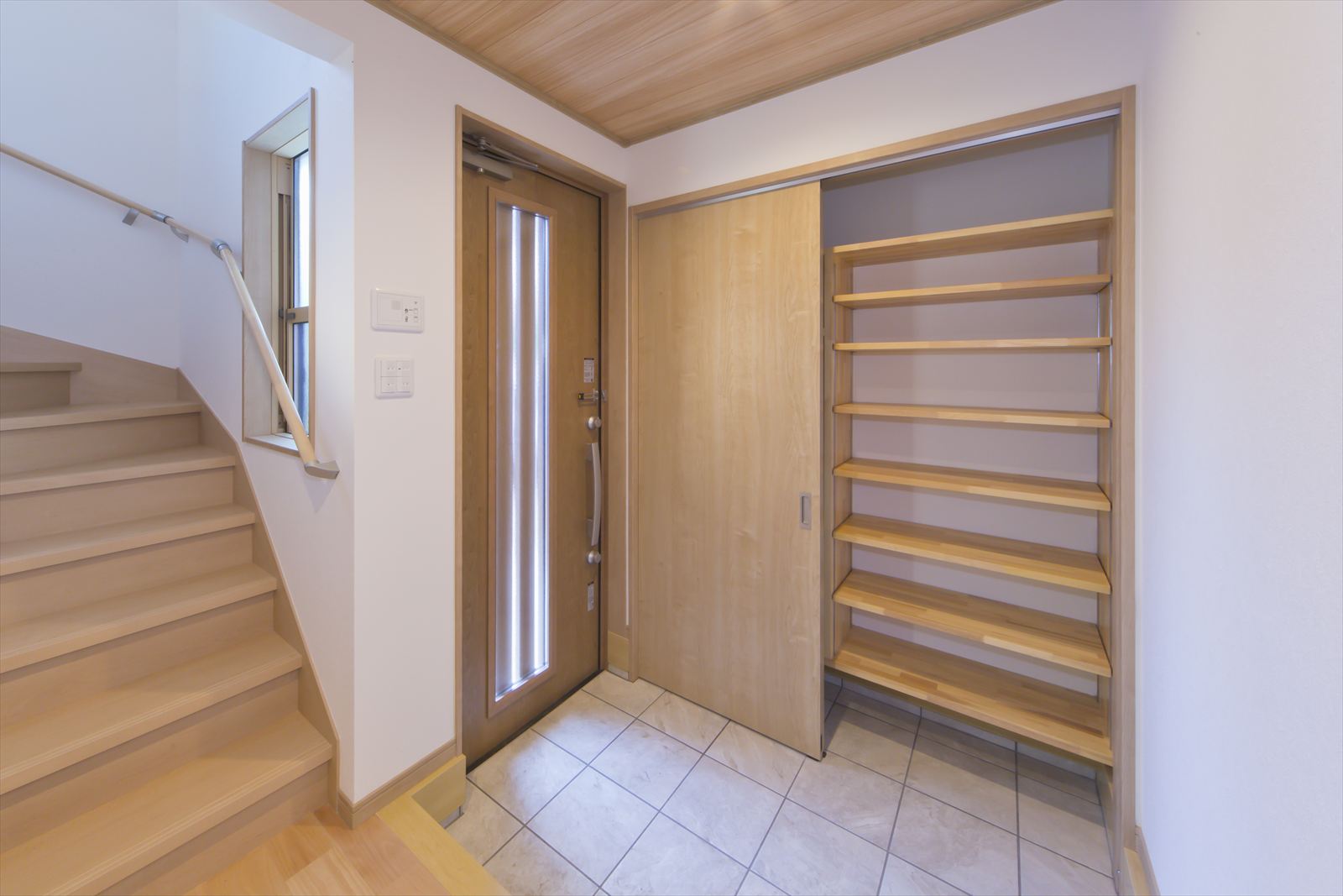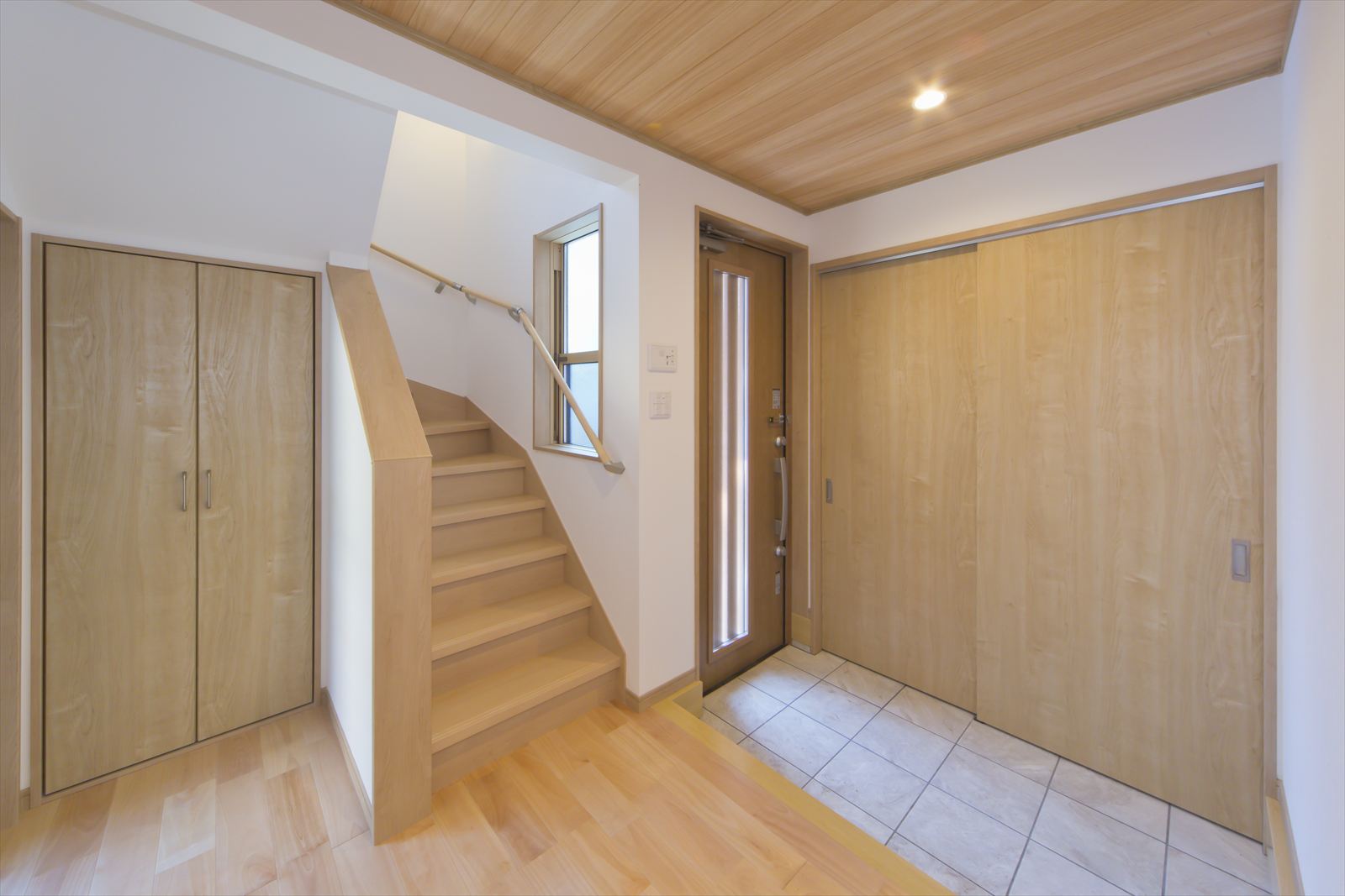 リフォーム工事により外観・内観ともに新しくなったこちらのお宅は、新築住宅そのもの。玄関ドアを開くと奥へ長い土間スペースがあり、そこにあるスライドドアの中はシューズクロークとなっています。正面には、木の枝をモチーフにした身長計付き壁紙が貼られており、これからのお子様の成長を見守ってくれることでしょう。室内に入り長い廊下の先は、LDKスペース。キッチンは、窓側に据え付けているので手元が明るく調理も快適。使い勝手を重視した、キッチンカウンターやリビング・洋室のオリジナル造作家具も見どころです。