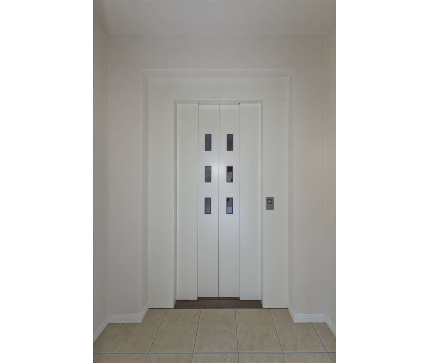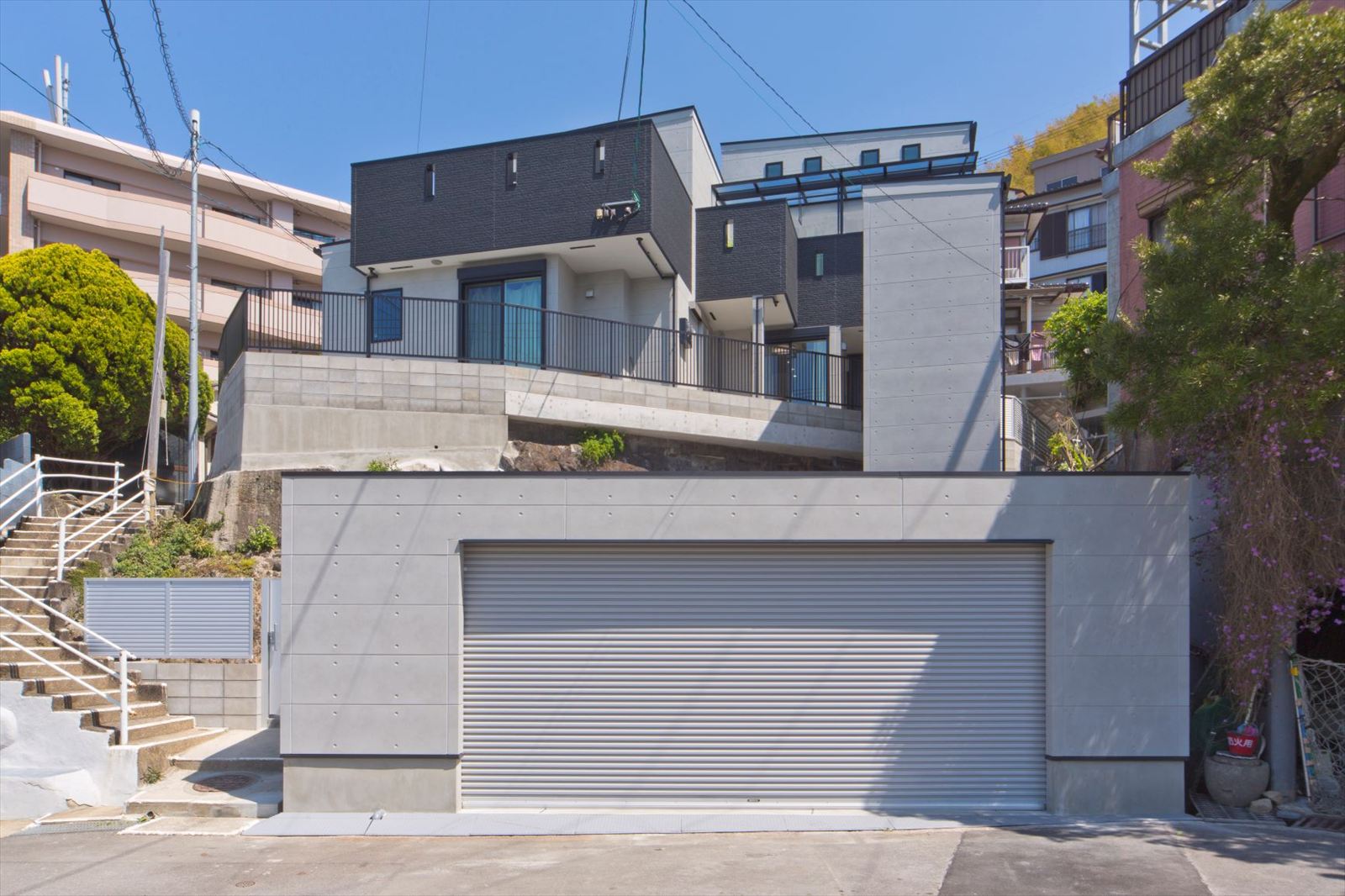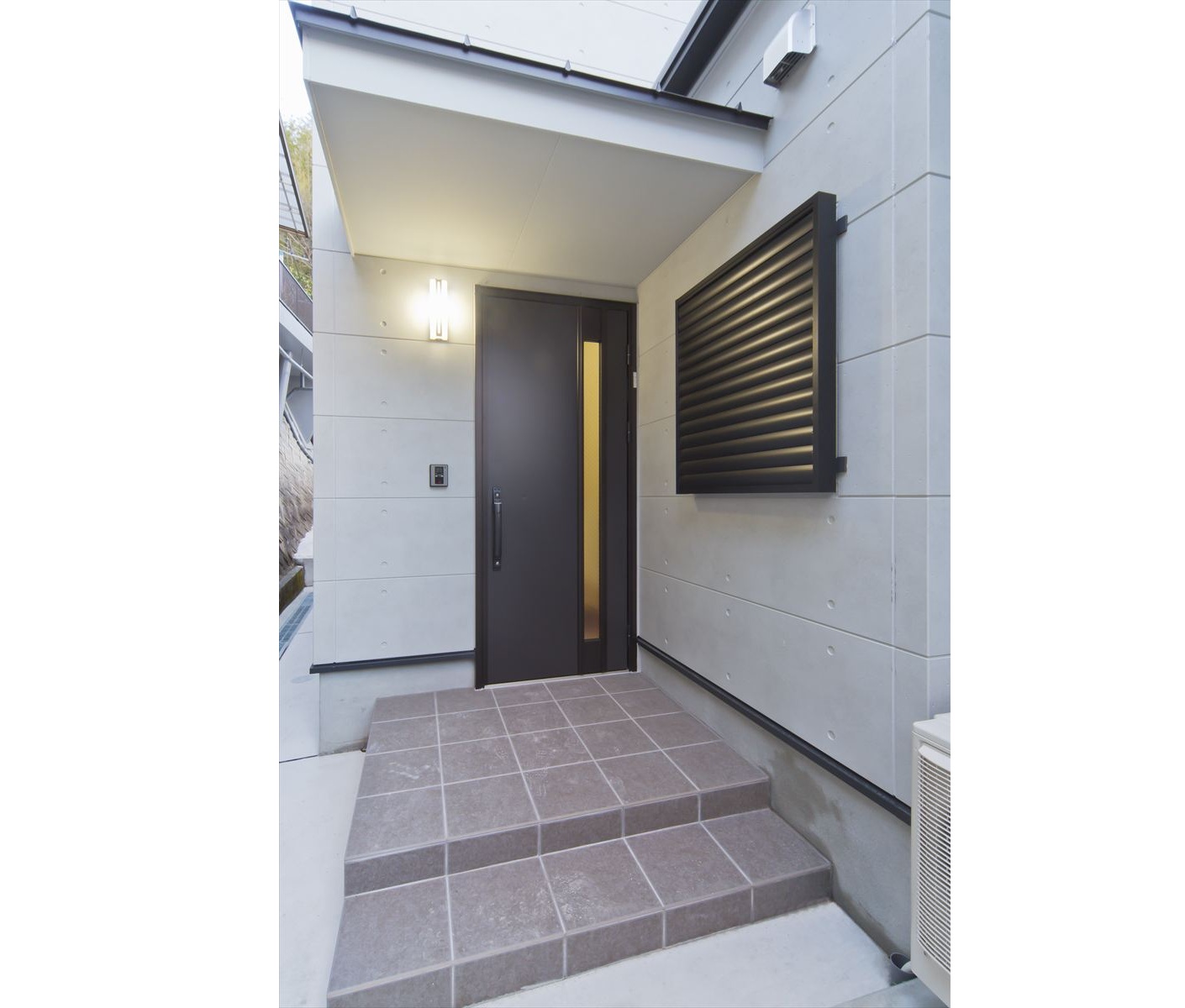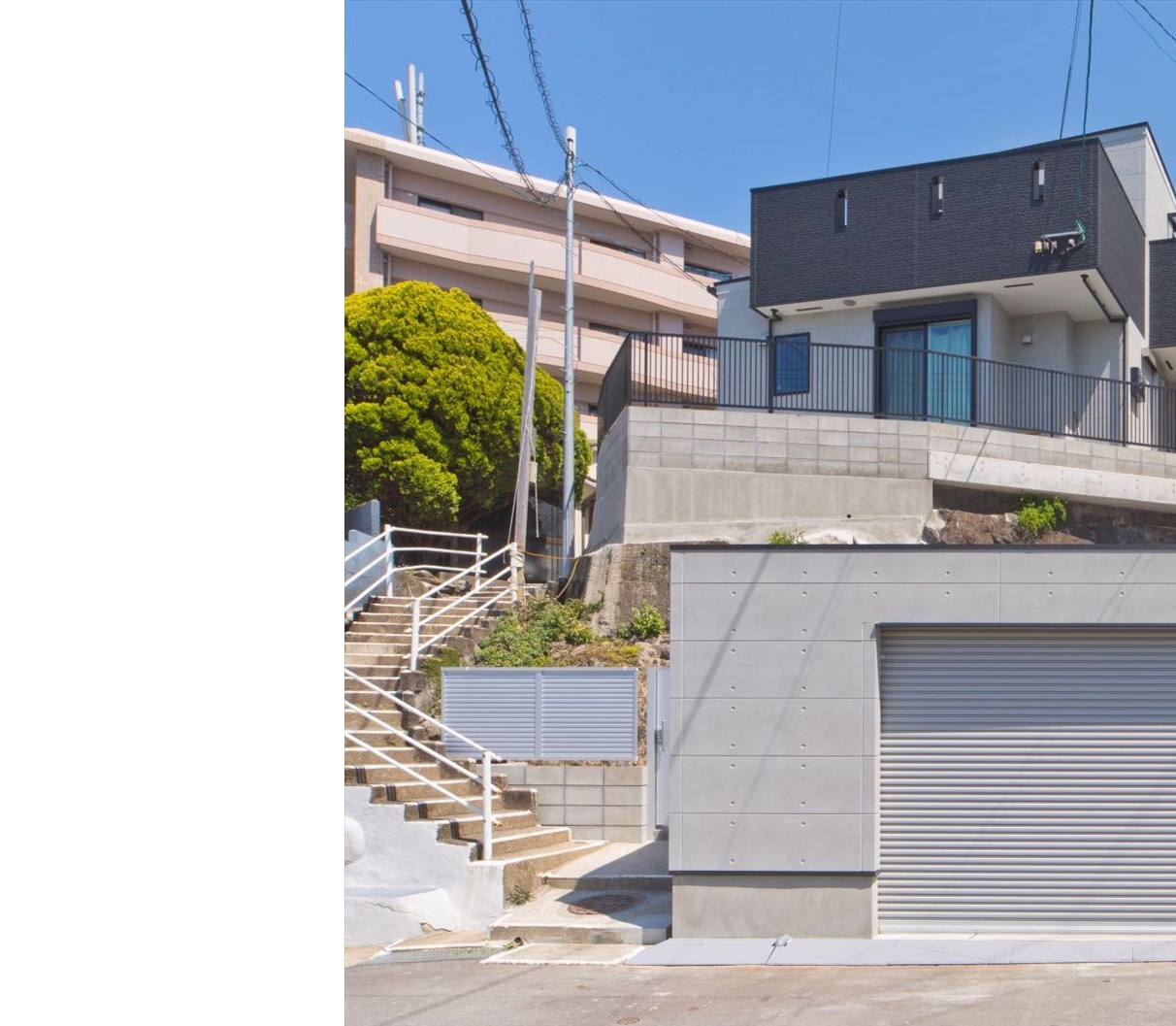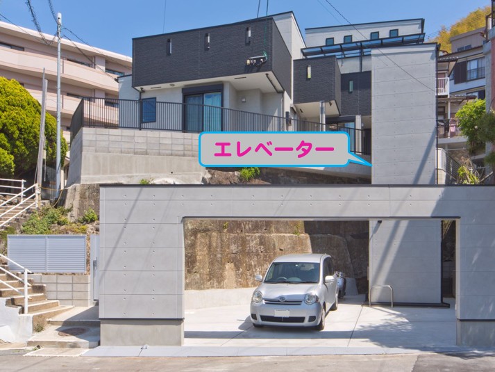 建物と駐車場に高低差のある自宅敷地を持つT様が、建て替えを期にエレベーターのある家づくりを選択なされました。それは、階段の上り下りのストレスをなくすためだけでなく、将来の事を考えてのご決断でした。駐車場に車を止め駐車場内のエレベーターで、上階へ上れば2世帯それぞれの玄関があり、ほとんど雨に濡れることもなく自宅へ帰ることができます。また、車を利用せず斜面側の階段から出入りするときのために、別の玄関も配置しました。内部は完全分離型二世帯住宅なので、リビング・水廻り設備・バルコニなどすべての生活空間が分かれています。
