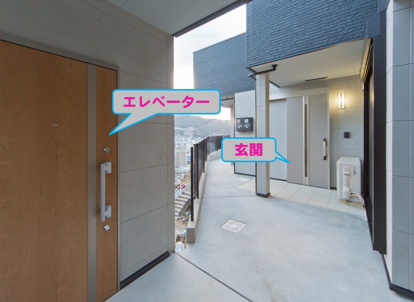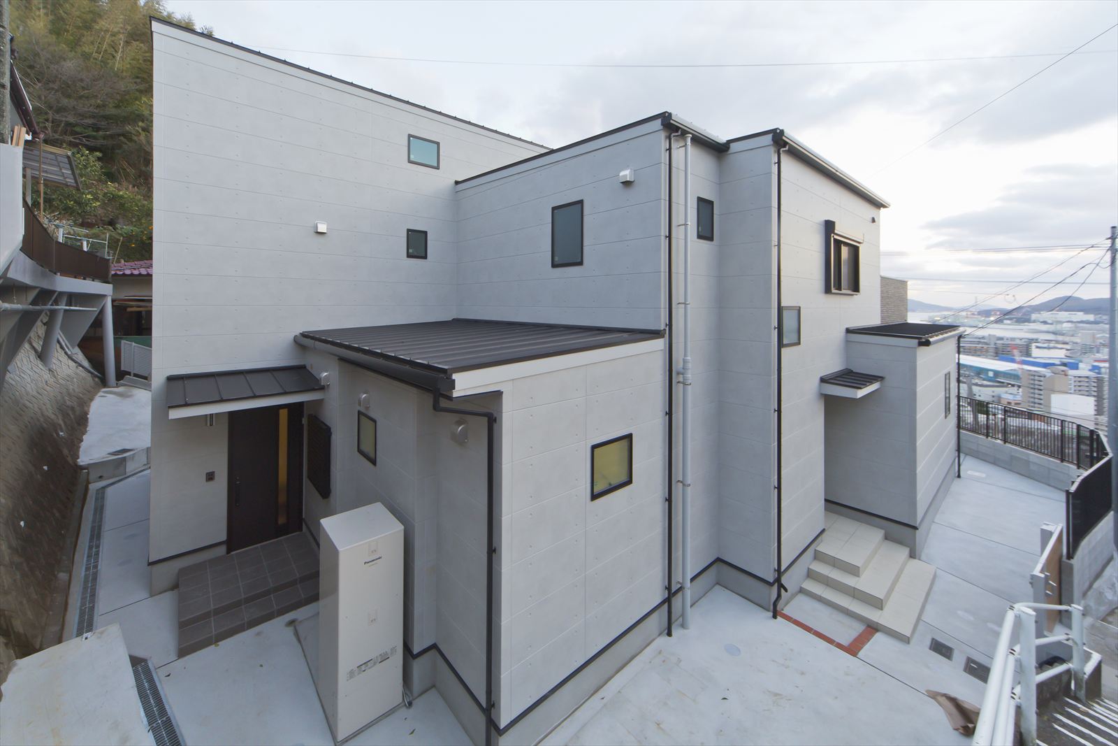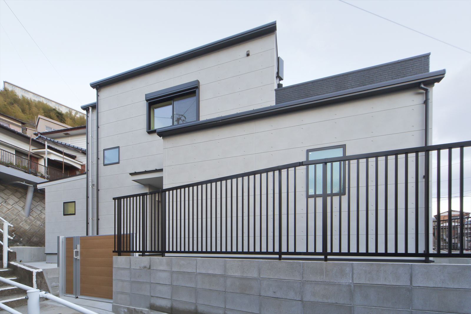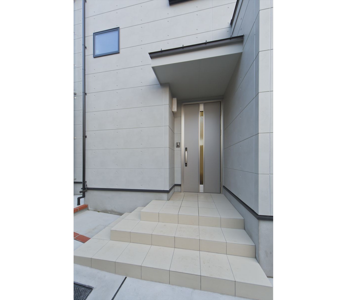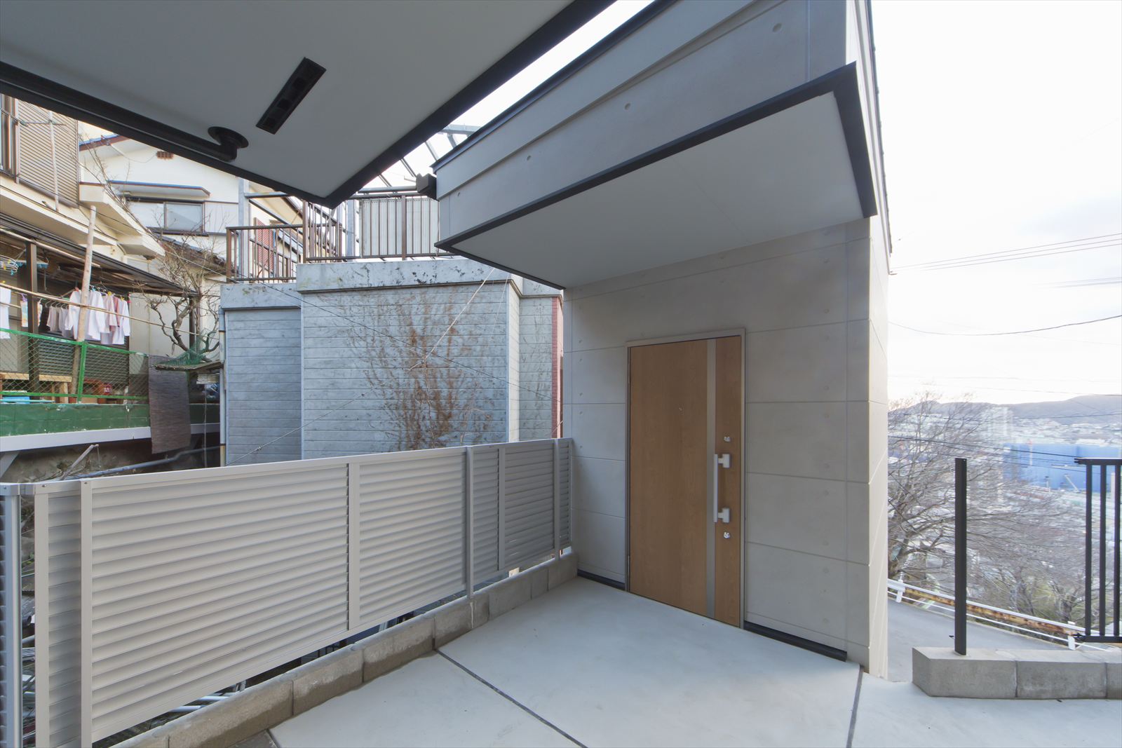 建物と駐車場に高低差のある自宅敷地を持つT様が、建て替えを期にエレベーターのある家づくりを選択なされました。それは、階段の上り下りのストレスをなくすためだけでなく、将来の事を考えてのご決断でした。駐車場に車を止め駐車場内のエレベーターで、上階へ上れば2世帯それぞれの玄関があり、ほとんど雨に濡れることもなく自宅へ帰ることができます。また、車を利用せず斜面側の階段から出入りするときのために、別の玄関も配置しました。内部は完全分離型二世帯住宅なので、リビング・水廻り設備・バルコニなどすべての生活空間が分かれています。