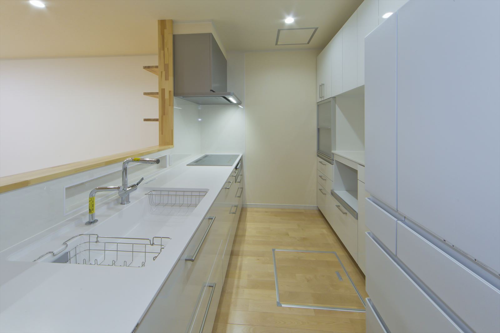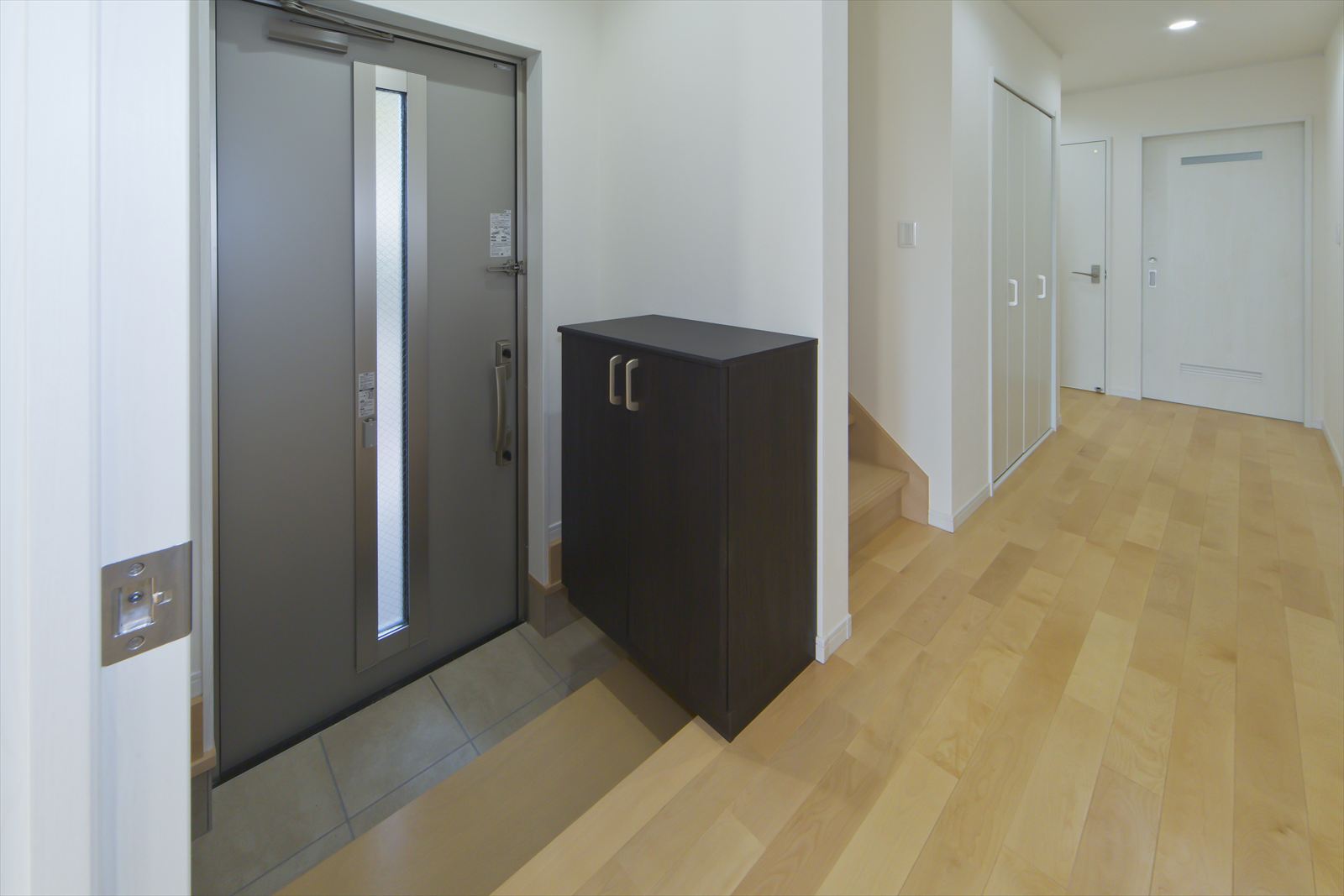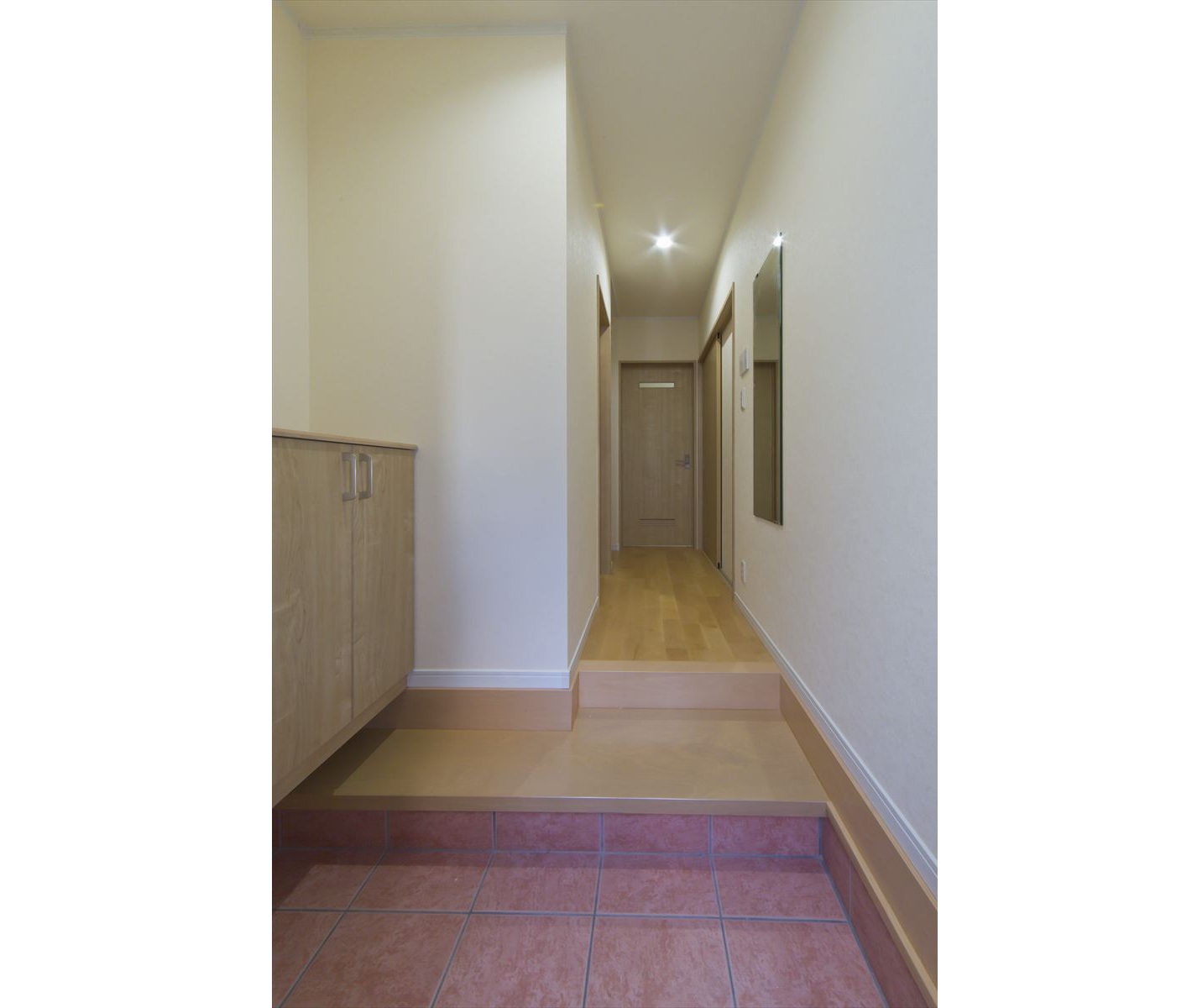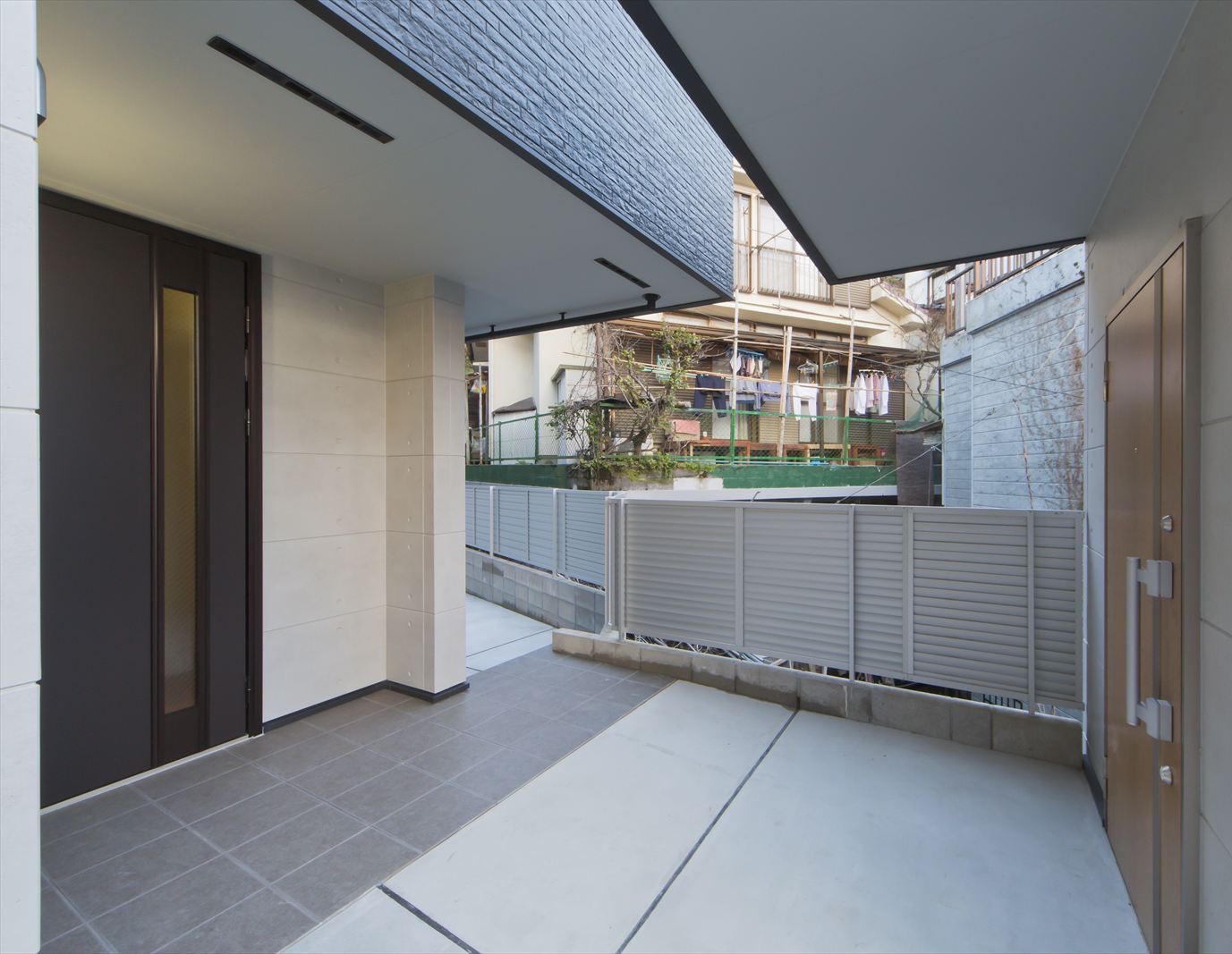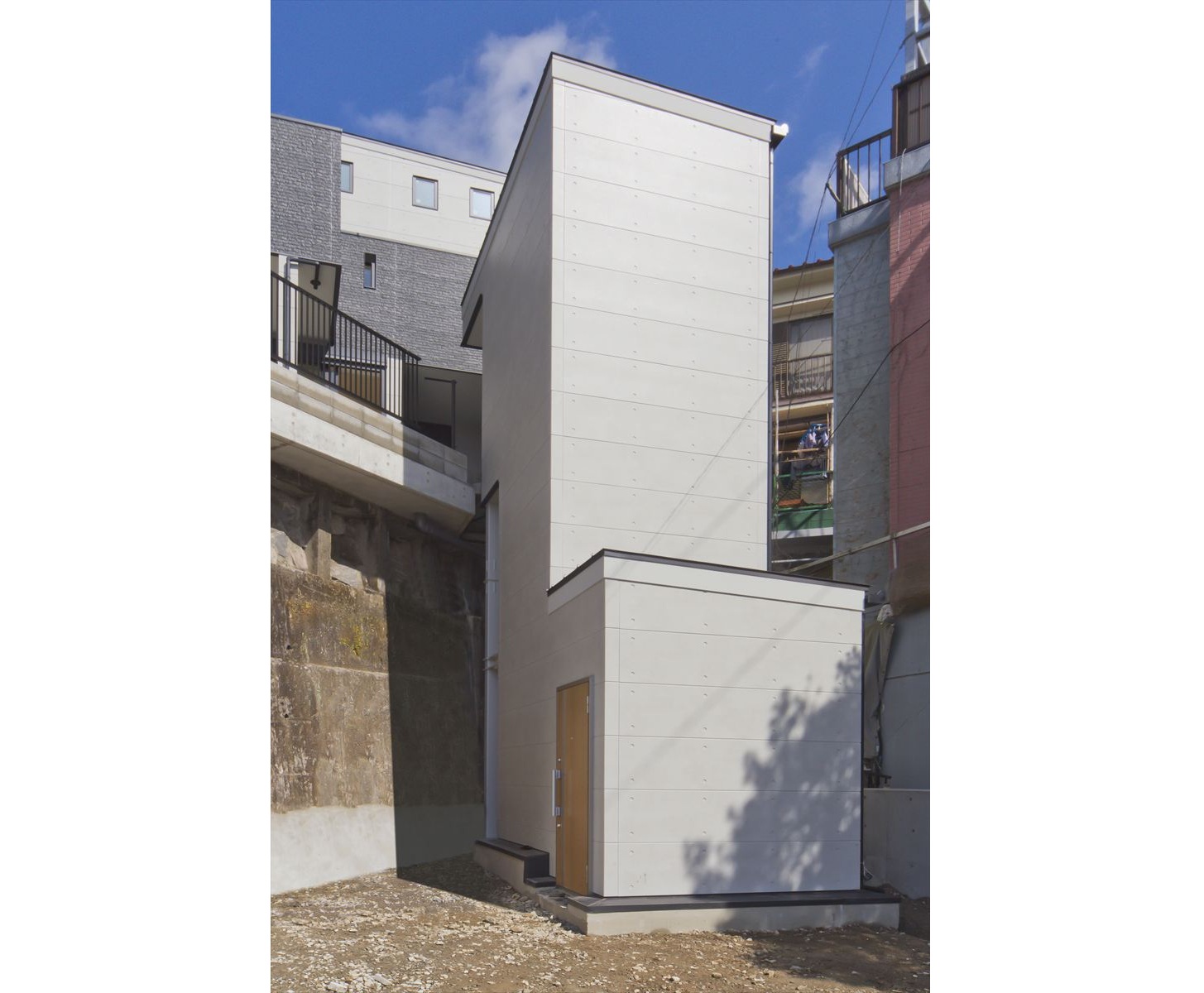 建物と駐車場に高低差のある自宅敷地を持つT様が、建て替えを期にエレベーターのある家づくりを選択なされました。それは、階段の上り下りのストレスをなくすためだけでなく、将来の事を考えてのご決断でした。駐車場に車を止め駐車場内のエレベーターで、上階へ上れば2世帯それぞれの玄関があり、ほとんど雨に濡れることもなく自宅へ帰ることができます。また、車を利用せず斜面側の階段から出入りするときのために、別の玄関も配置しました。内部は完全分離型二世帯住宅なので、リビング・水廻り設備・バルコニなどすべての生活空間が分かれています。