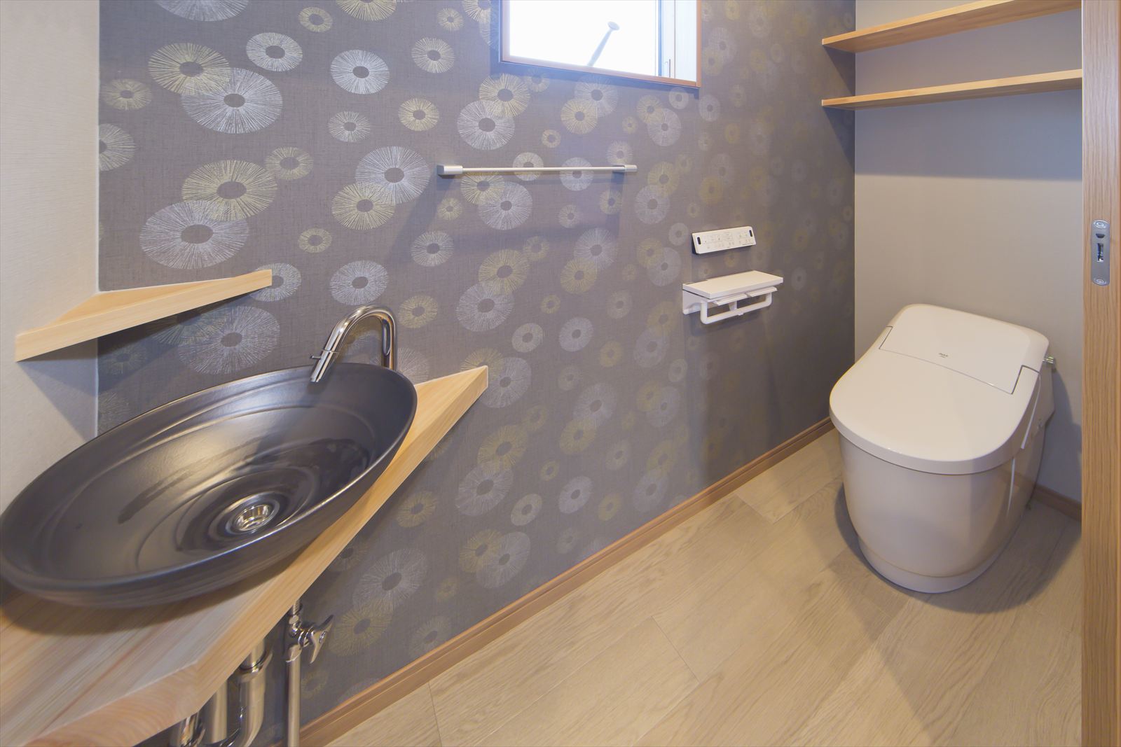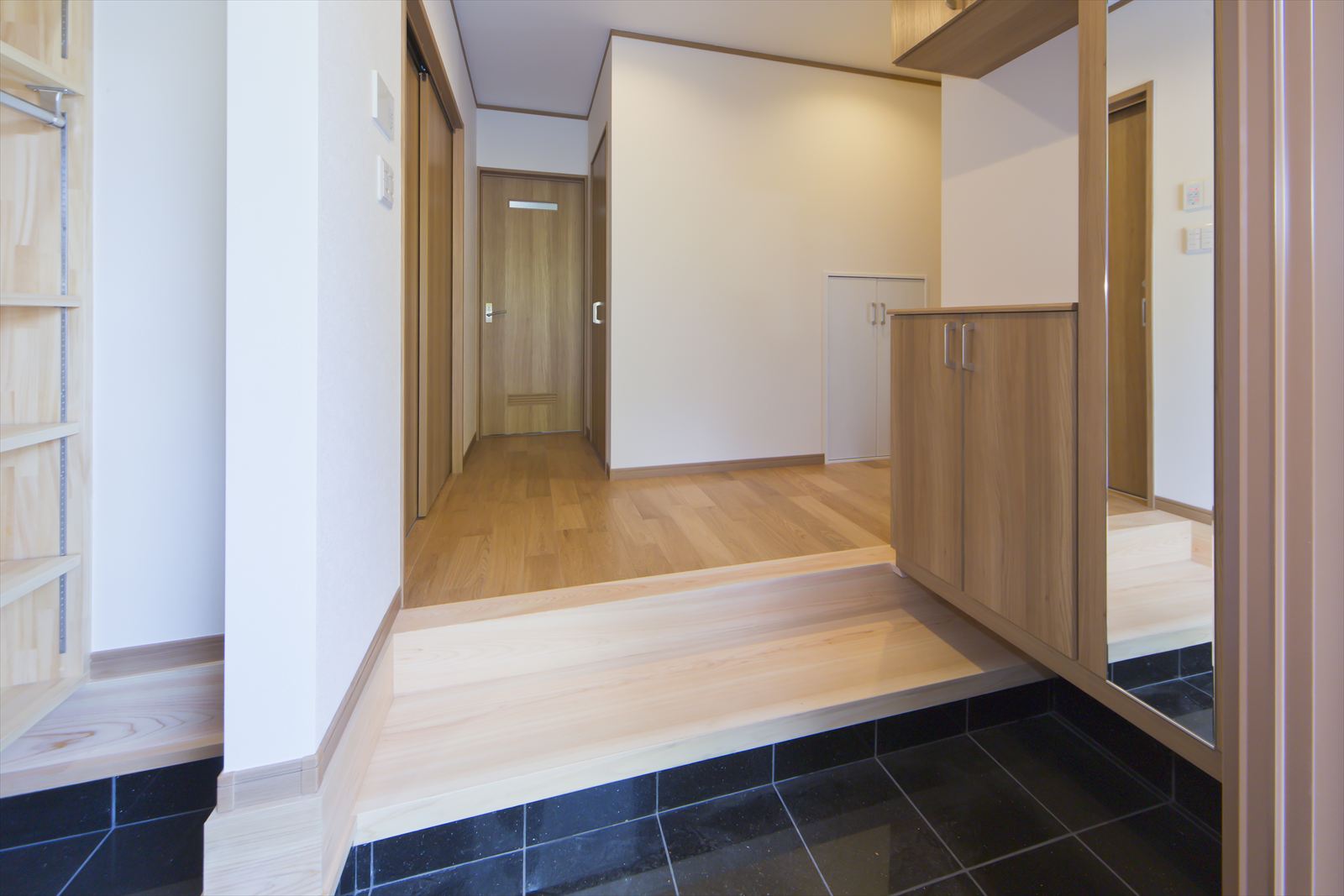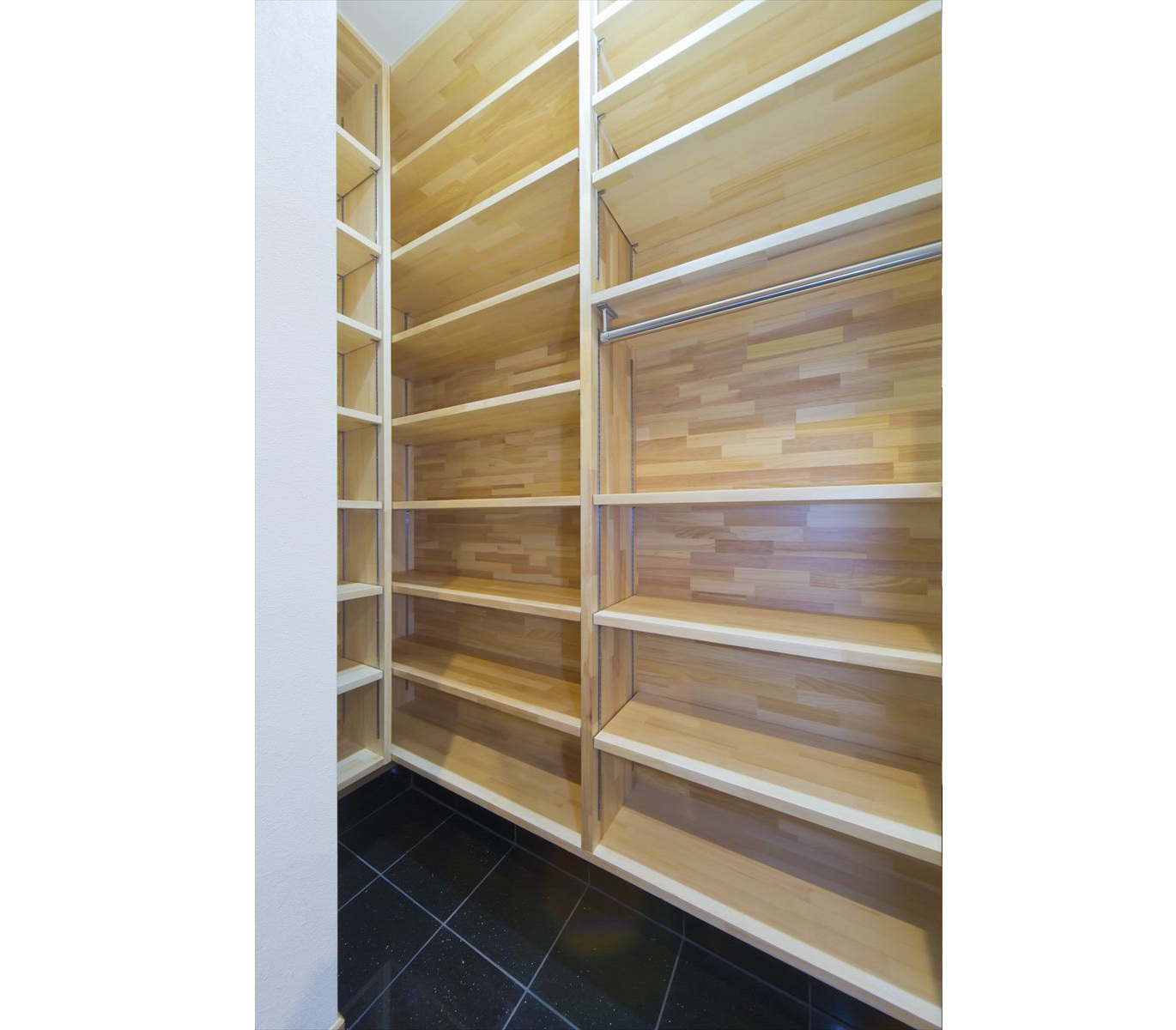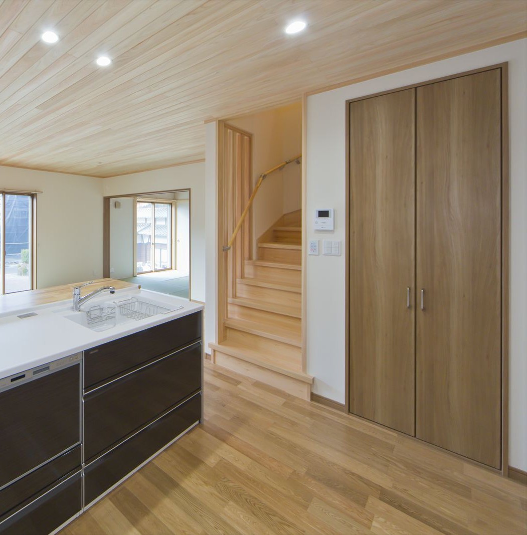 リビング天井には桧、和室天井は杉、プライベートルームの壁や天井に桧など、自然素材をふんだんに使用したお宅です。家中に広がる木の香りと美しい木目、ナチュラルな色合いは、住む人にやすらぎと安心感を与えてくれます。また、玄関とシューズクロークの土間に敷き詰められた輝く御影石は高級感と重厚感にあふれ、訪れた人の第一印象となることでしょう。他にもトイレ手洗い器に信楽焼の器を使用したり、キッチンカウンターの壁にマグネットクロスで作った掲示板を設置したりと目を引くポイントが、たくさんあります。