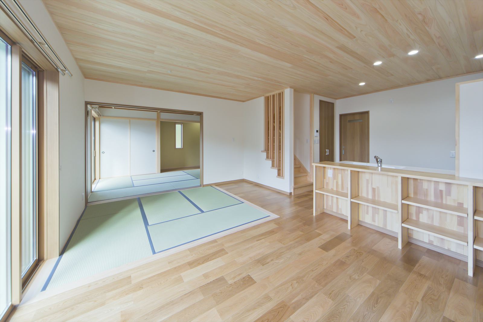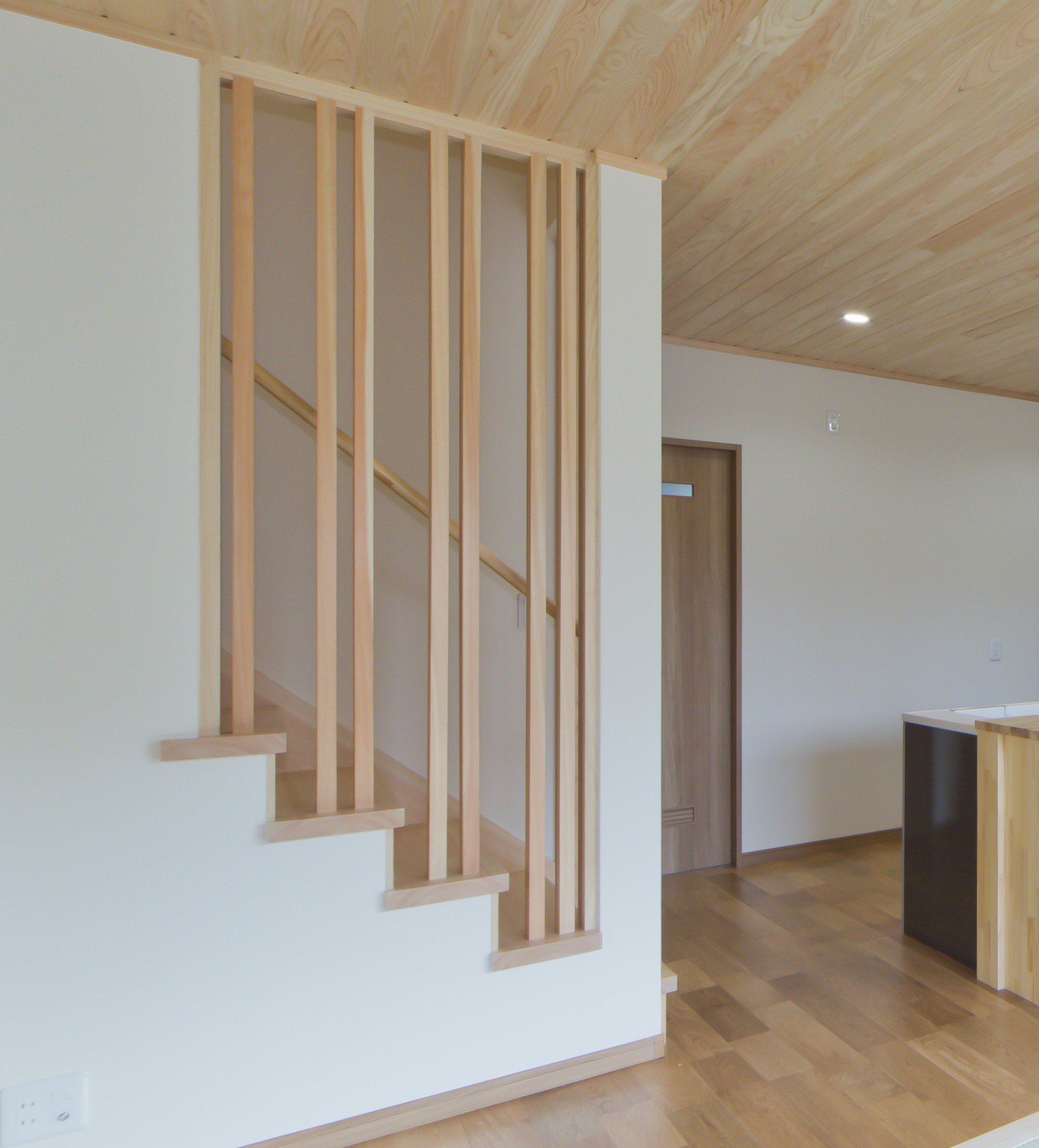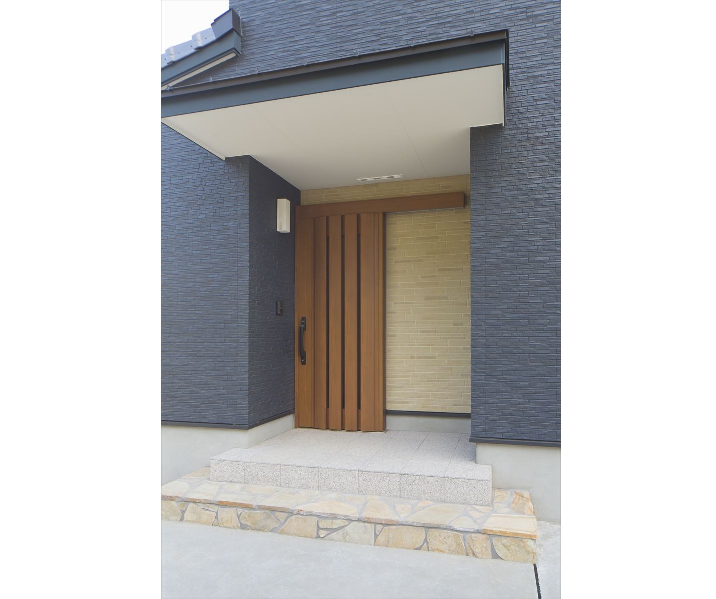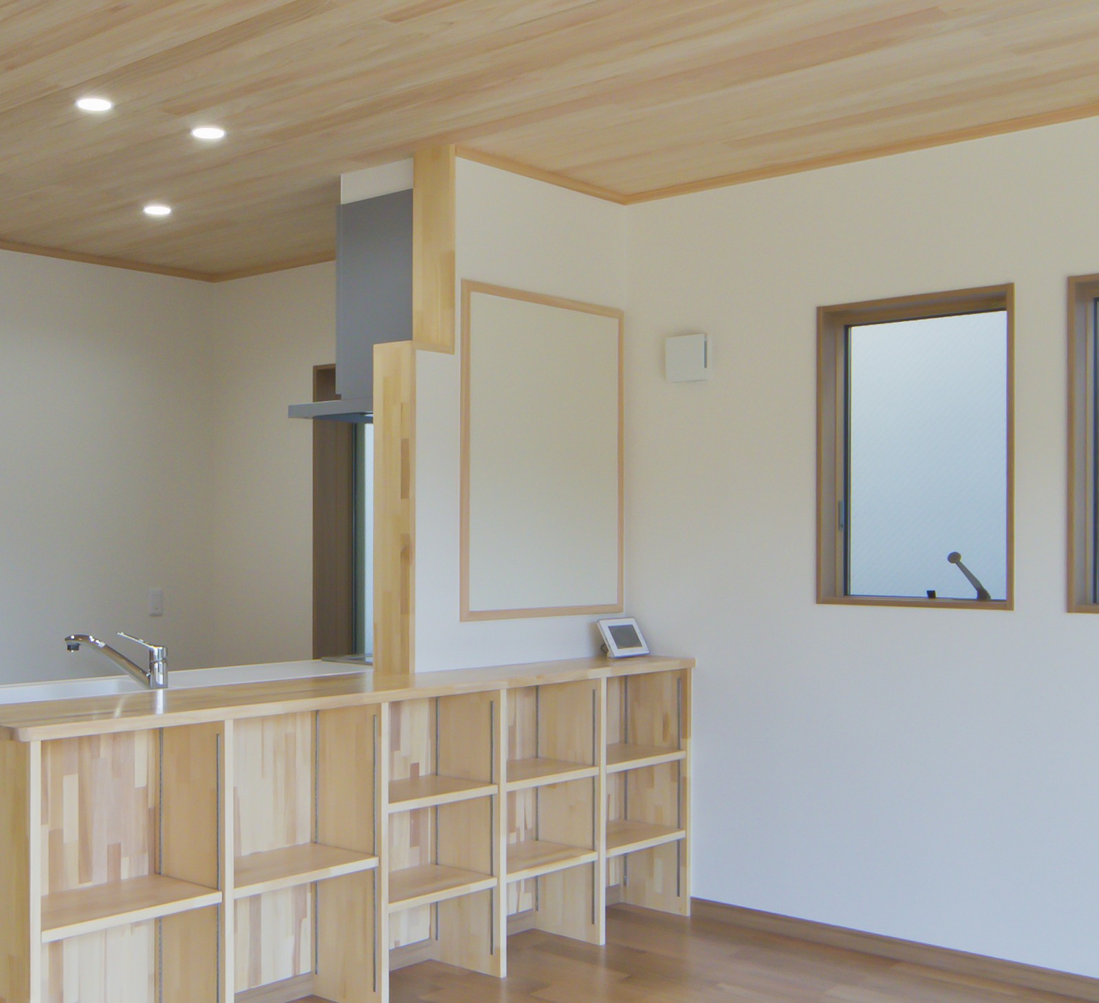 リビング天井には桧、和室天井は杉、プライベートルームの壁や天井に桧など、自然素材をふんだんに使用したお宅です。家中に広がる木の香りと美しい木目、ナチュラルな色合いは、住む人にやすらぎと安心感を与えてくれます。また、玄関とシューズクロークの土間に敷き詰められた輝く御影石は高級感と重厚感にあふれ、訪れた人の第一印象となることでしょう。他にもトイレ手洗い器に信楽焼の器を使用したり、キッチンカウンターの壁にマグネットクロスで作った掲示板を設置したりと目を引くポイントが、たくさんあります。