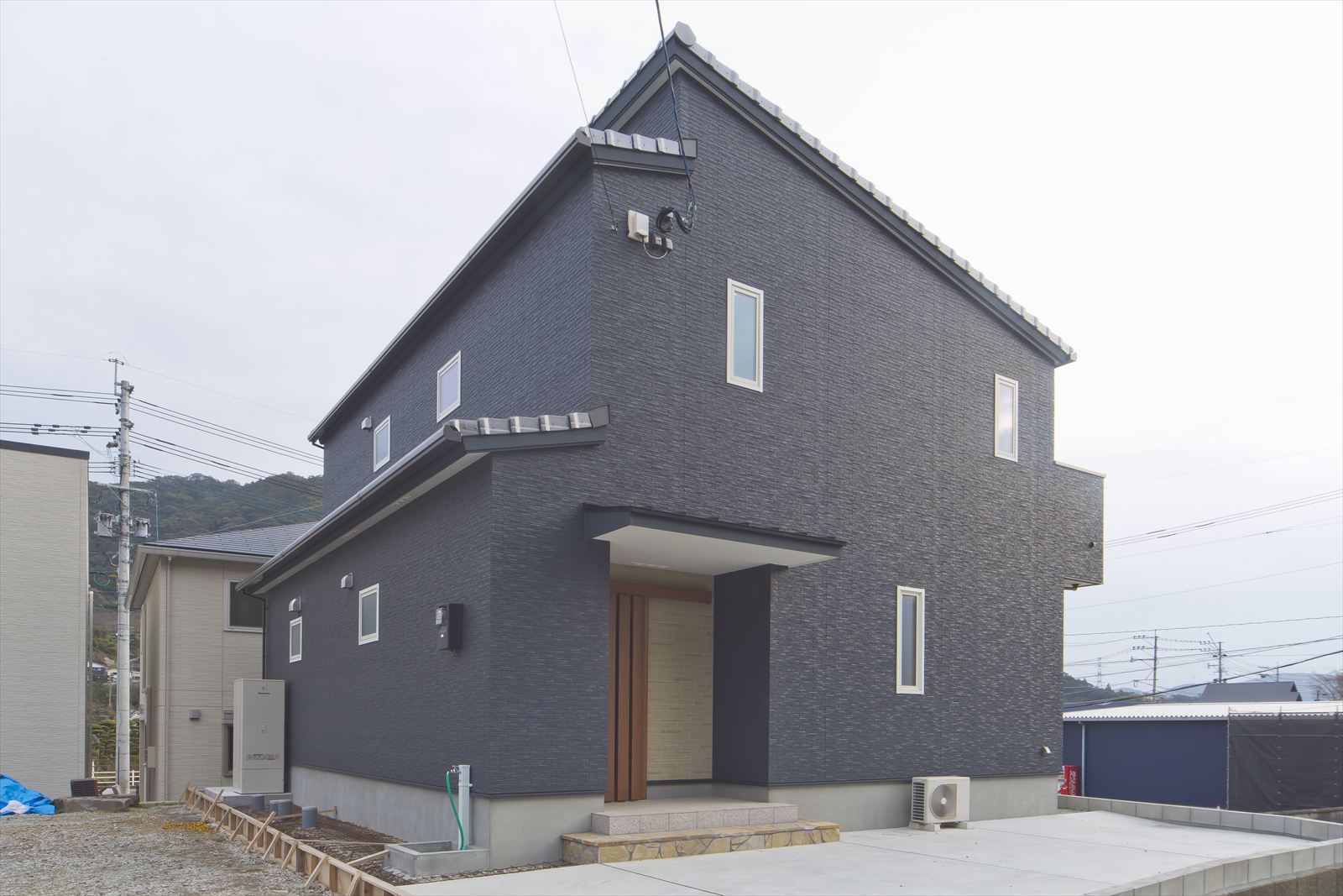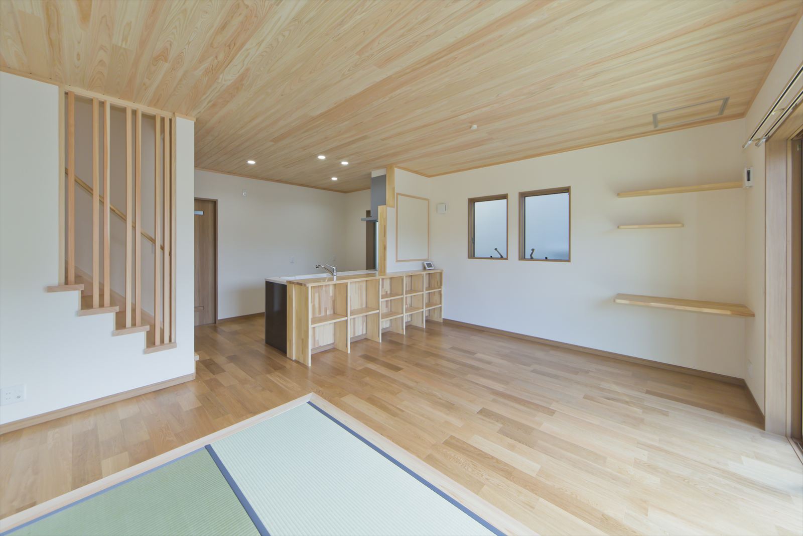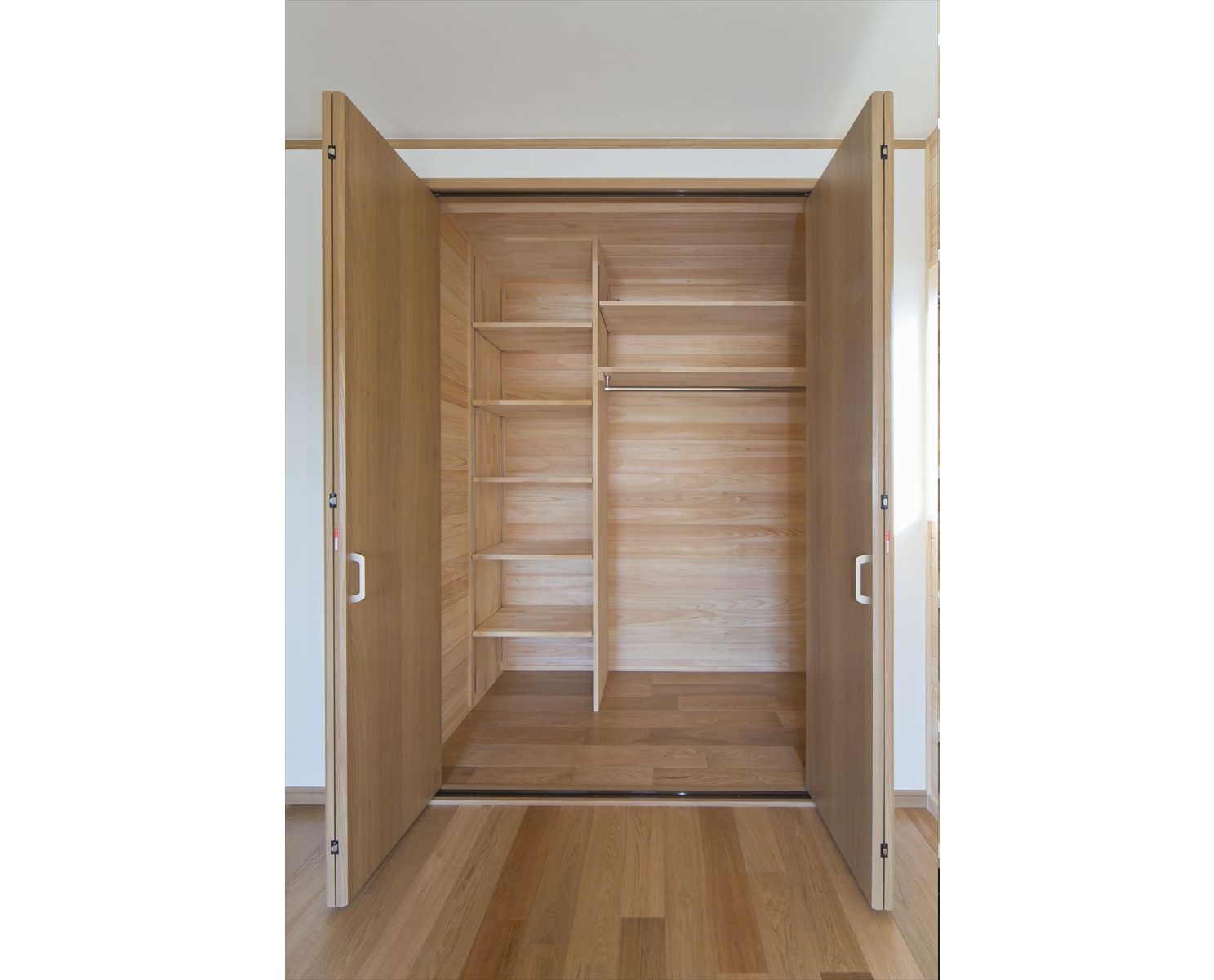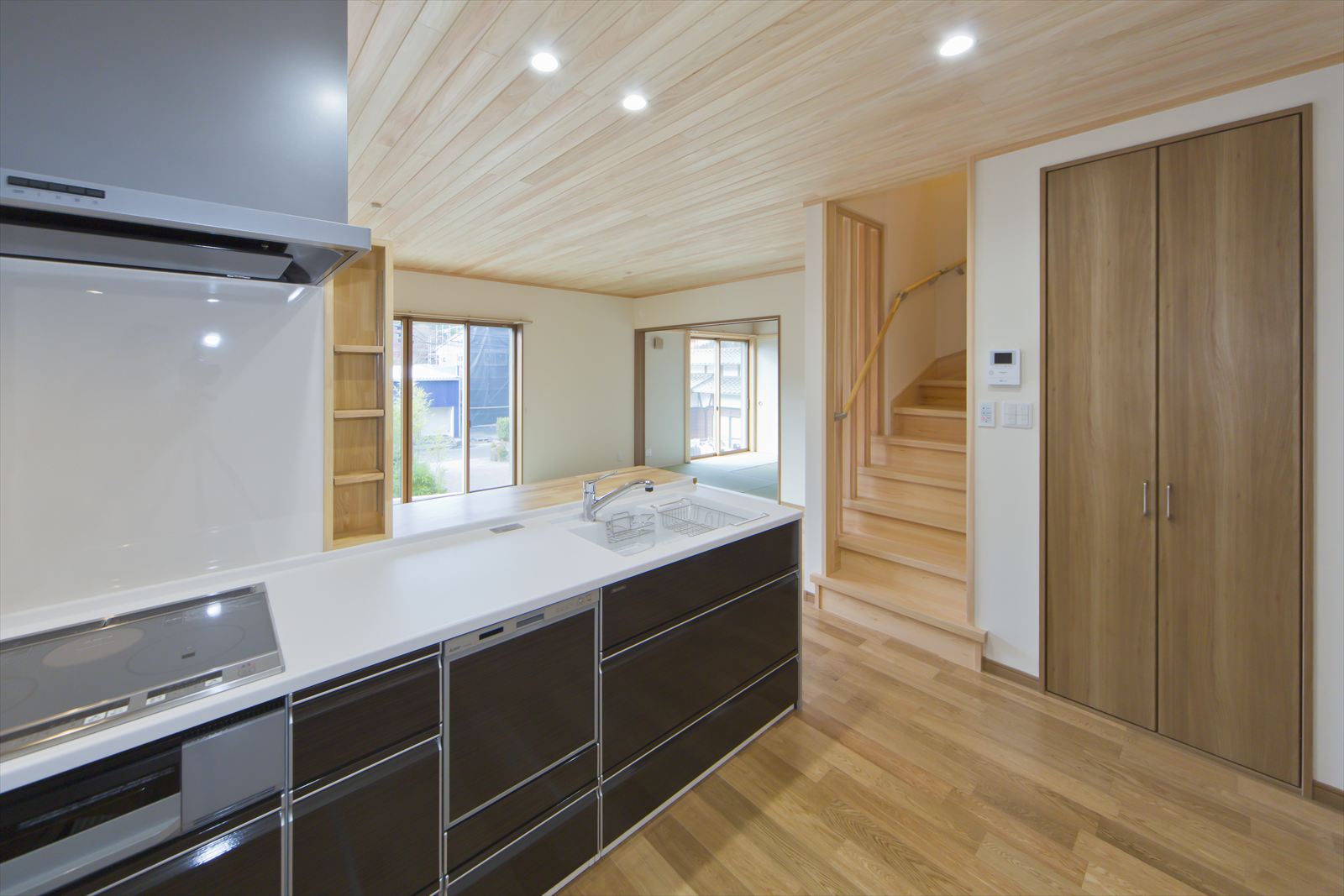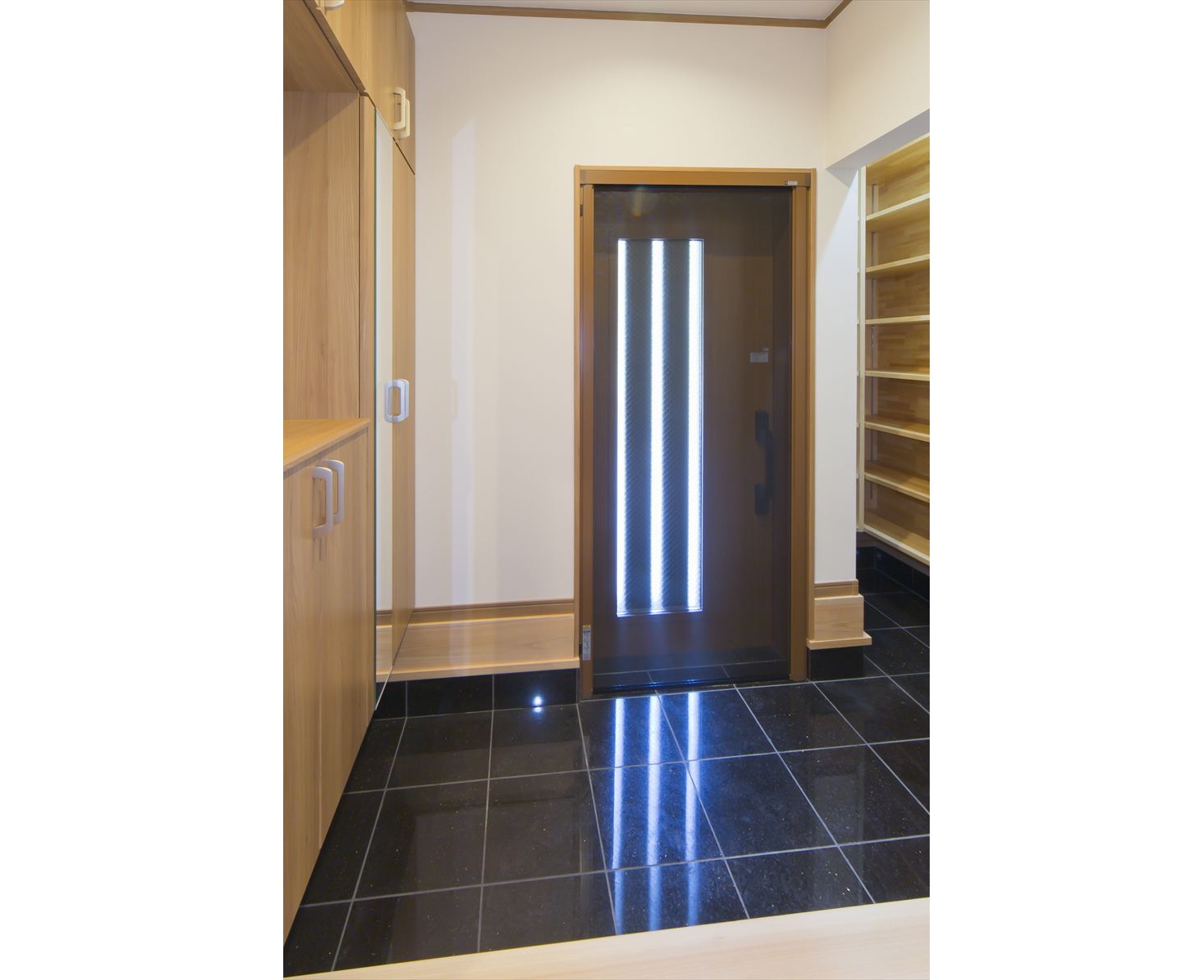 リビング天井には桧、和室天井は杉、プライベートルームの壁や天井に桧など、自然素材をふんだんに使用したお宅です。家中に広がる木の香りと美しい木目、ナチュラルな色合いは、住む人にやすらぎと安心感を与えてくれます。また、玄関とシューズクロークの土間に敷き詰められた輝く御影石は高級感と重厚感にあふれ、訪れた人の第一印象となることでしょう。他にもトイレ手洗い器に信楽焼の器を使用したり、キッチンカウンターの壁にマグネットクロスで作った掲示板を設置したりと目を引くポイントが、たくさんあります。