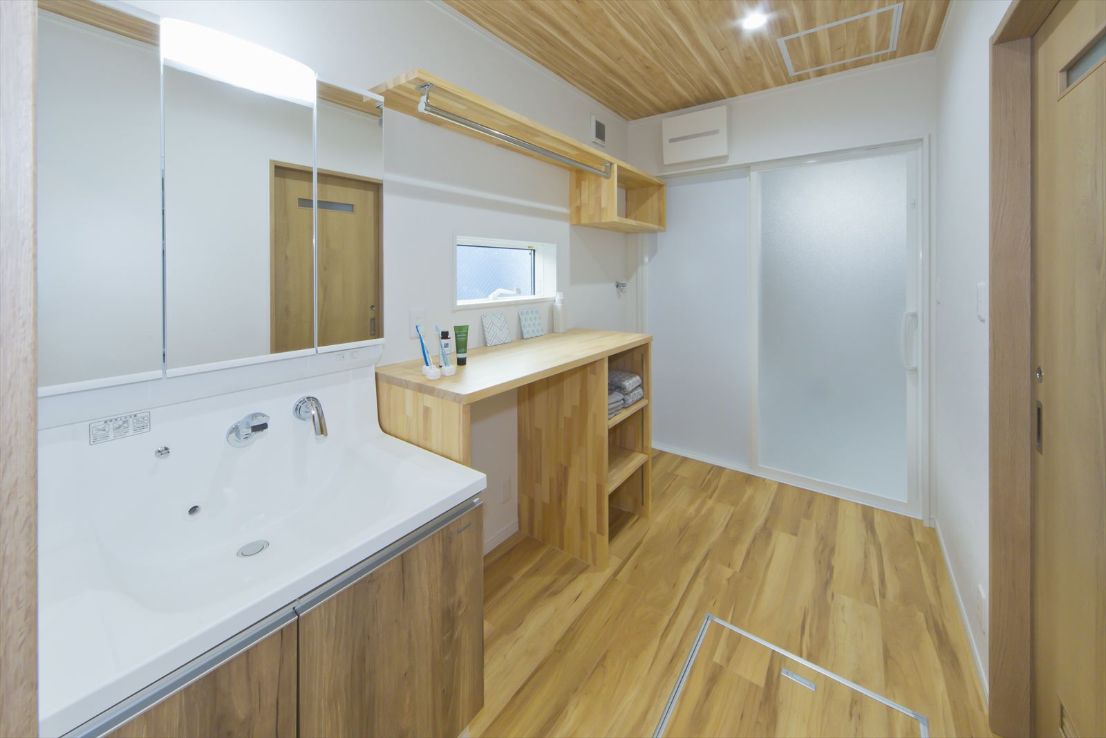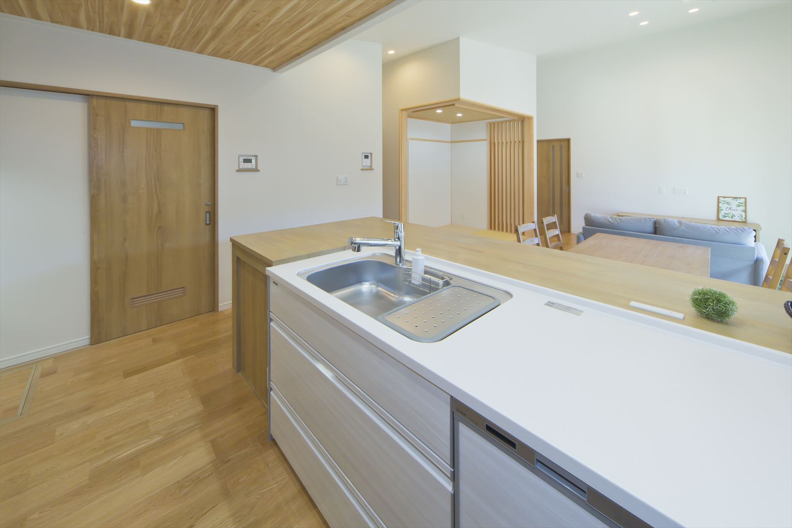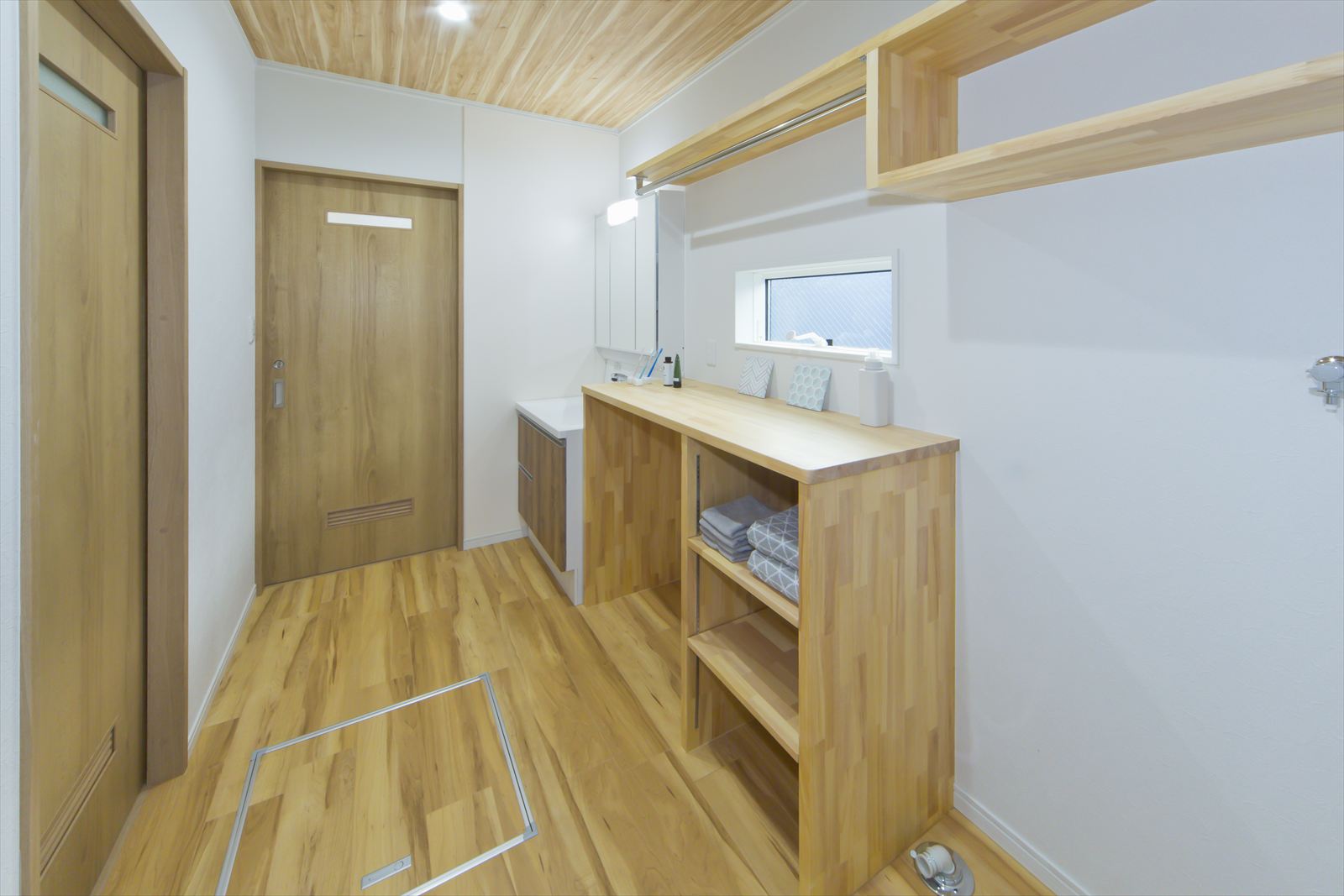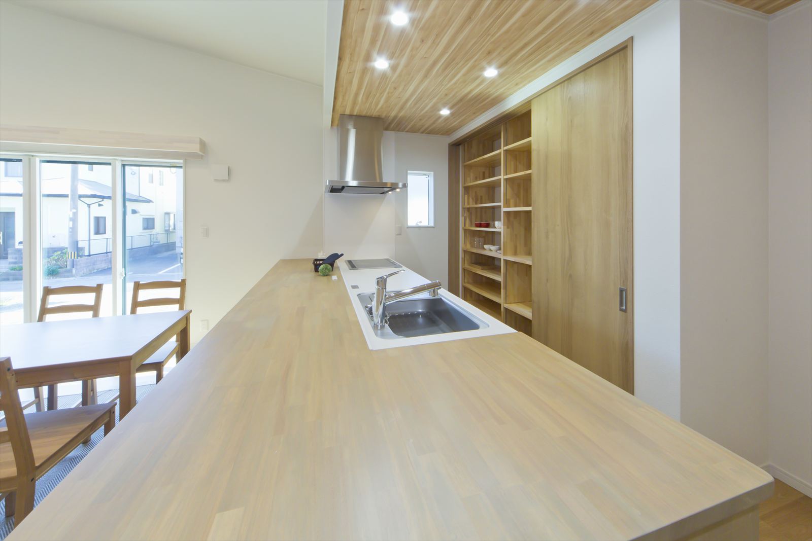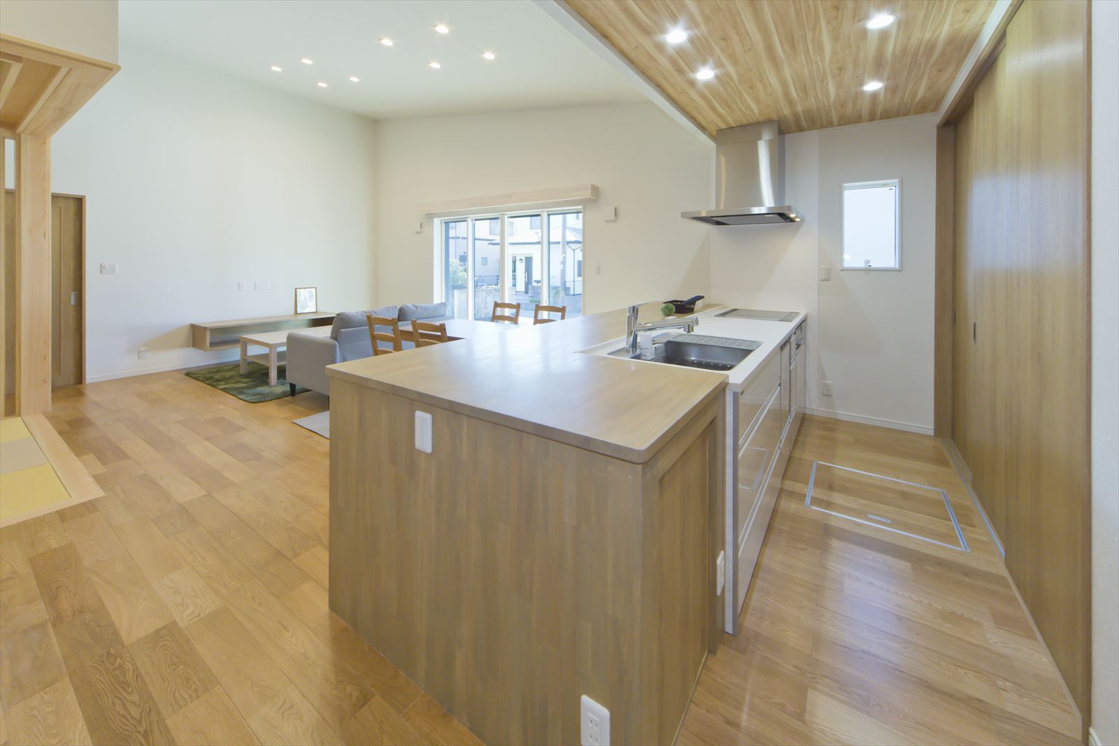リビングから1枚の扉を開くと、家族のプライベートルームへと繋がる平屋建てのH様邸は実に機能的。キッチンを囲むように造作されたカウンターは、キッチンと高さを合わせているので作業台としても大活躍することでしょう。そのカウンターの下は、すべて収納スペースとして確保されており開閉はプッシュ式の両開き戸なので見た目もスッキリ。また、キッチン背面の3枚のスライドドアを開けると冷蔵庫以外のキッチン用品が、すべて収納できるようコンセントを完備した可動棚を造作しております。広い洗面脱衣室には、アイロンがけもできるカウンターのある収納を造作しました。