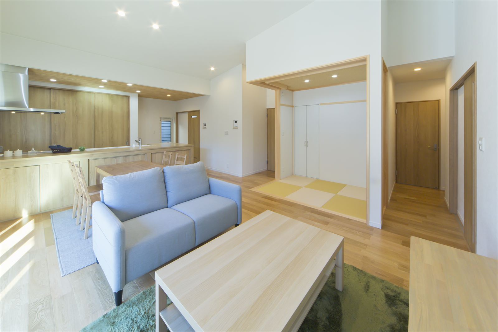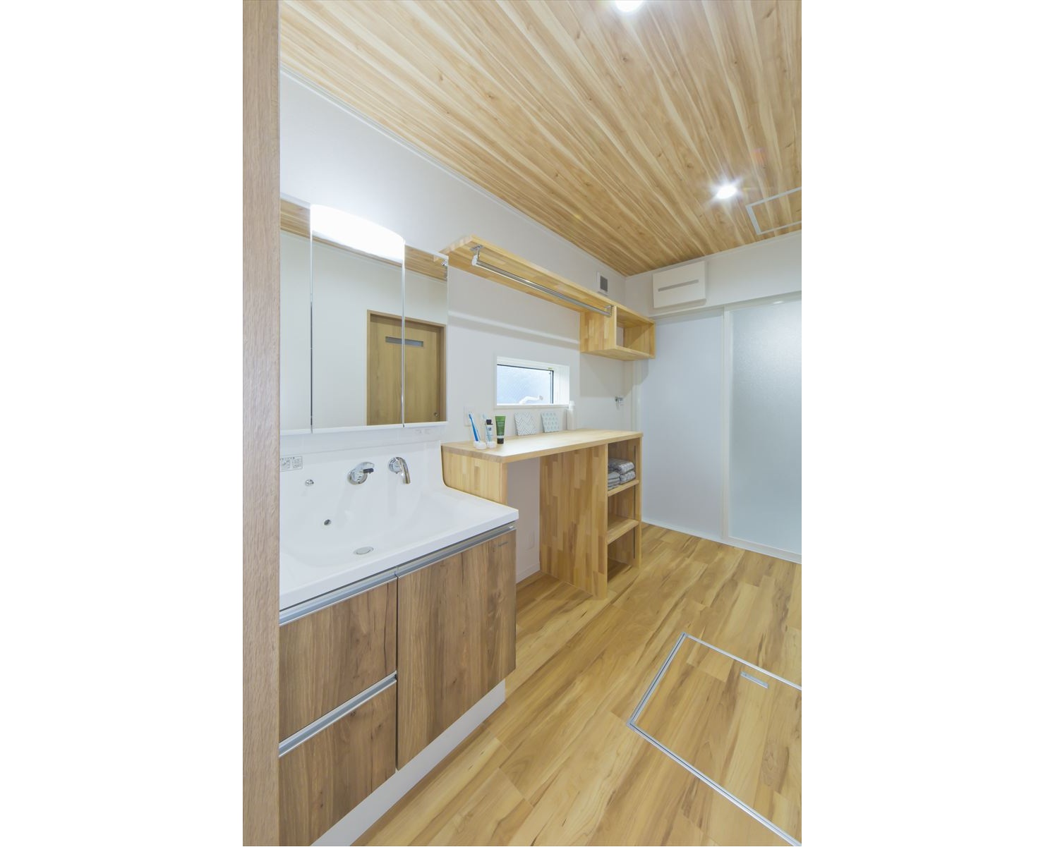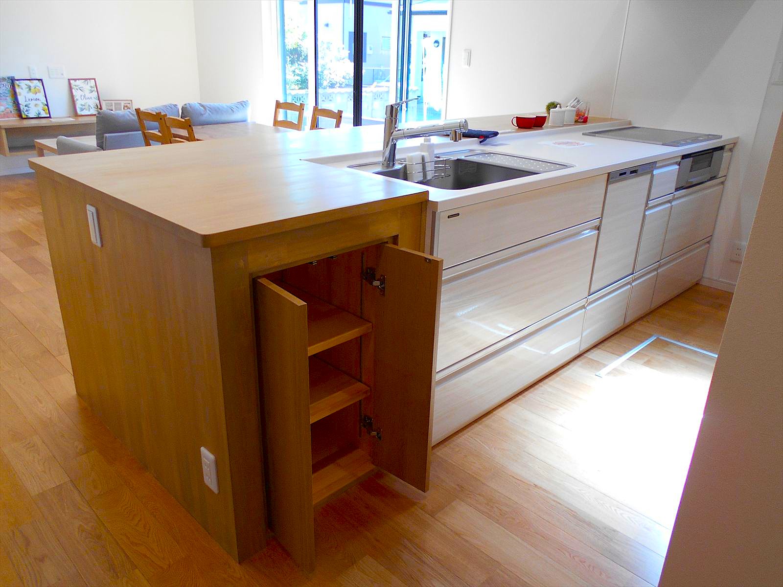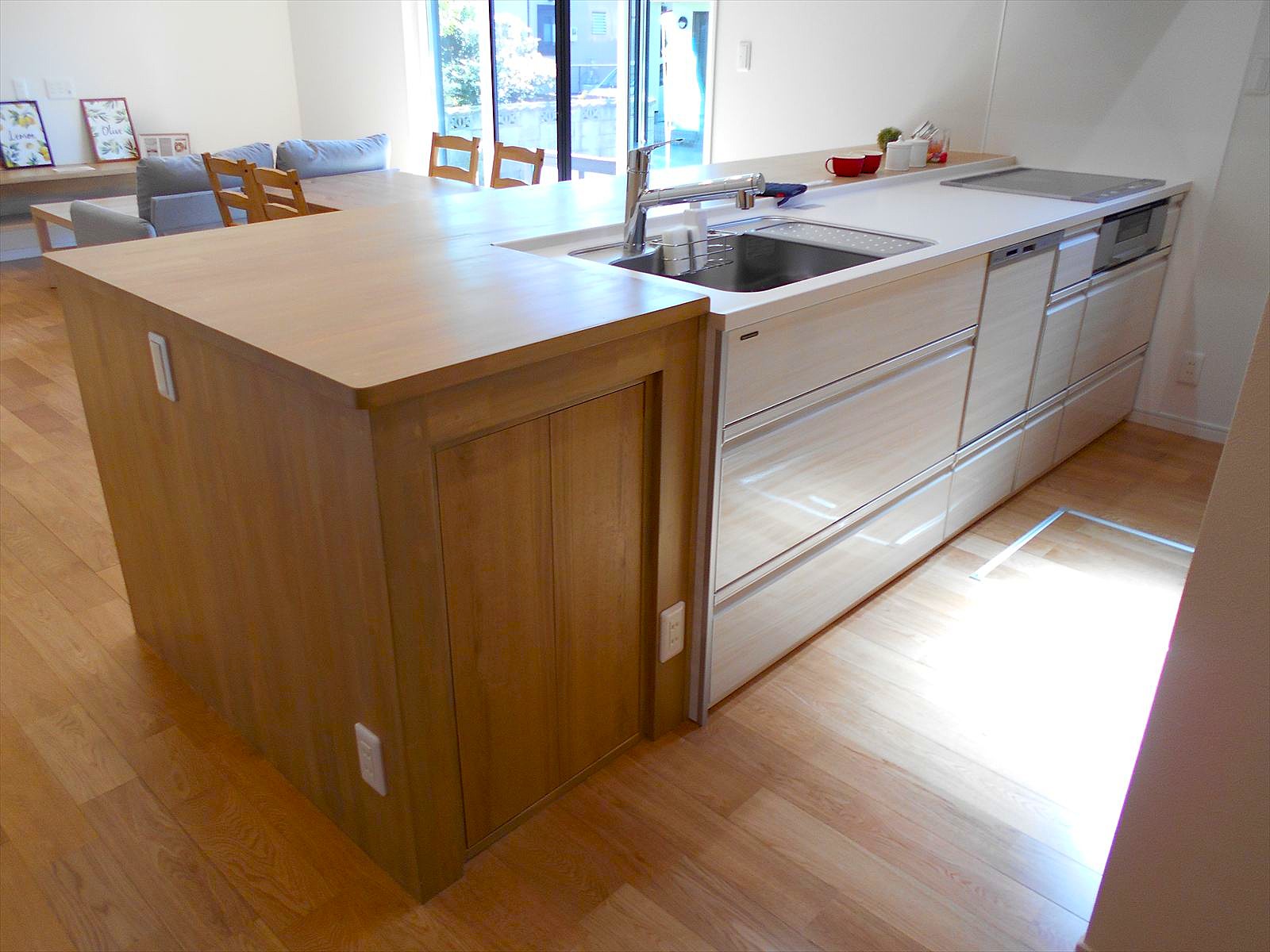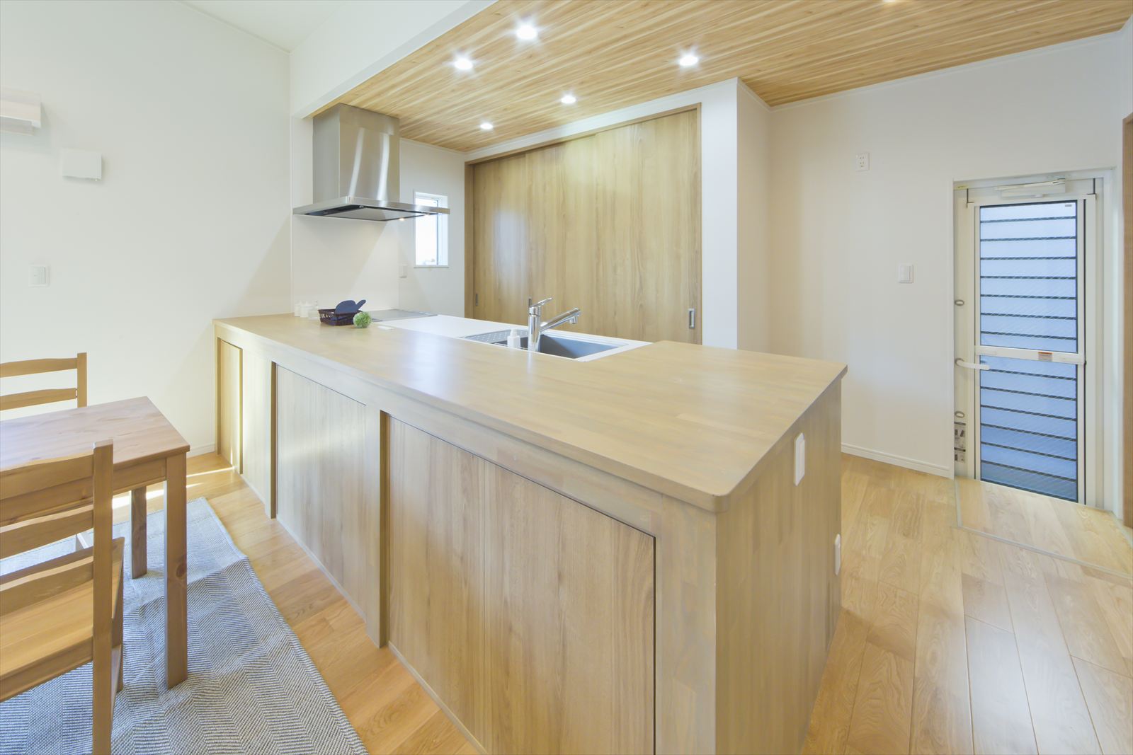 リビングから1枚の扉を開くと、家族のプライベートルームへと繋がる平屋建てのH様邸は実に機能的。キッチンを囲むように造作されたカウンターは、キッチンと高さを合わせているので作業台としても大活躍することでしょう。そのカウンターの下は、すべて収納スペースとして確保されており開閉はプッシュ式の両開き戸なので見た目もスッキリ。また、キッチン背面の3枚のスライドドアを開けると冷蔵庫以外のキッチン用品が、すべて収納できるようコンセントを完備した可動棚を造作しております。広い洗面脱衣室には、アイロンがけもできるカウンターのある収納を造作しました。