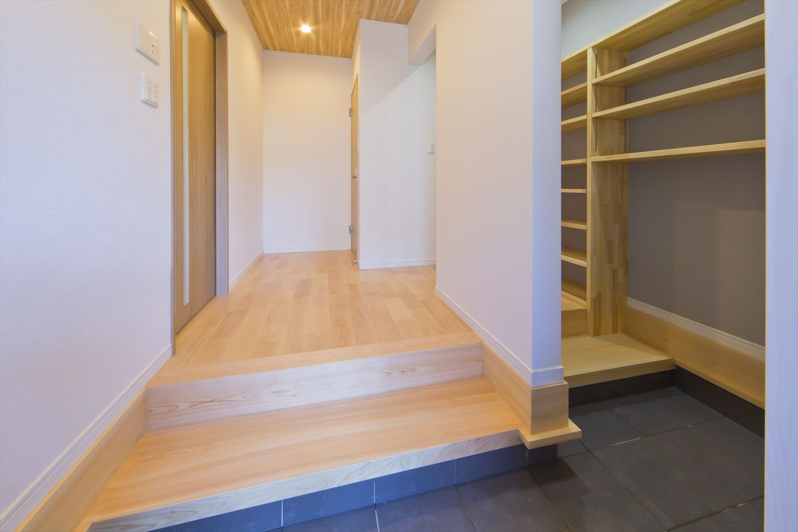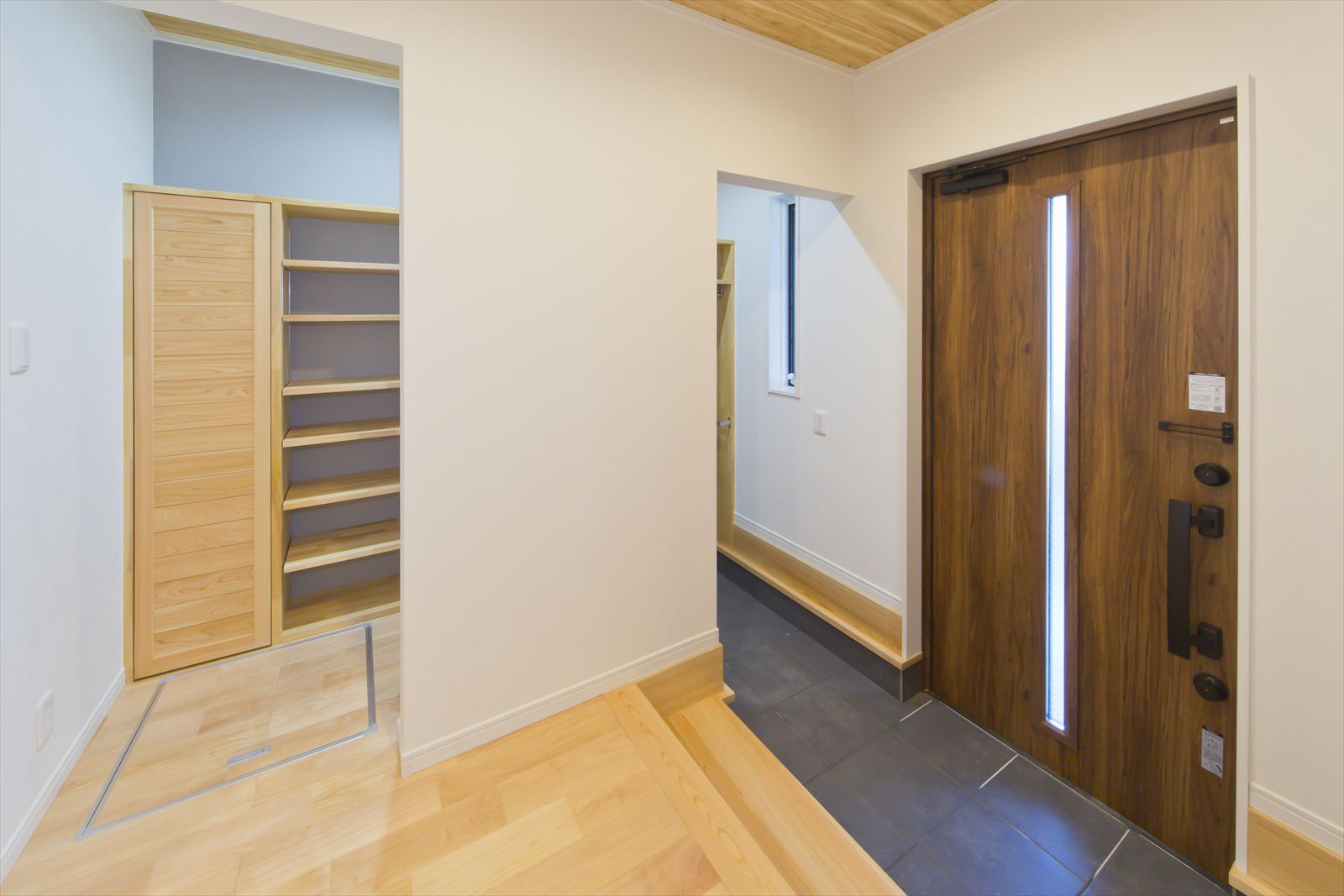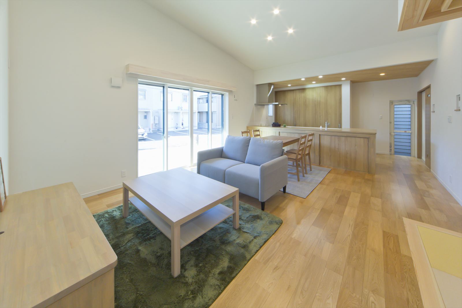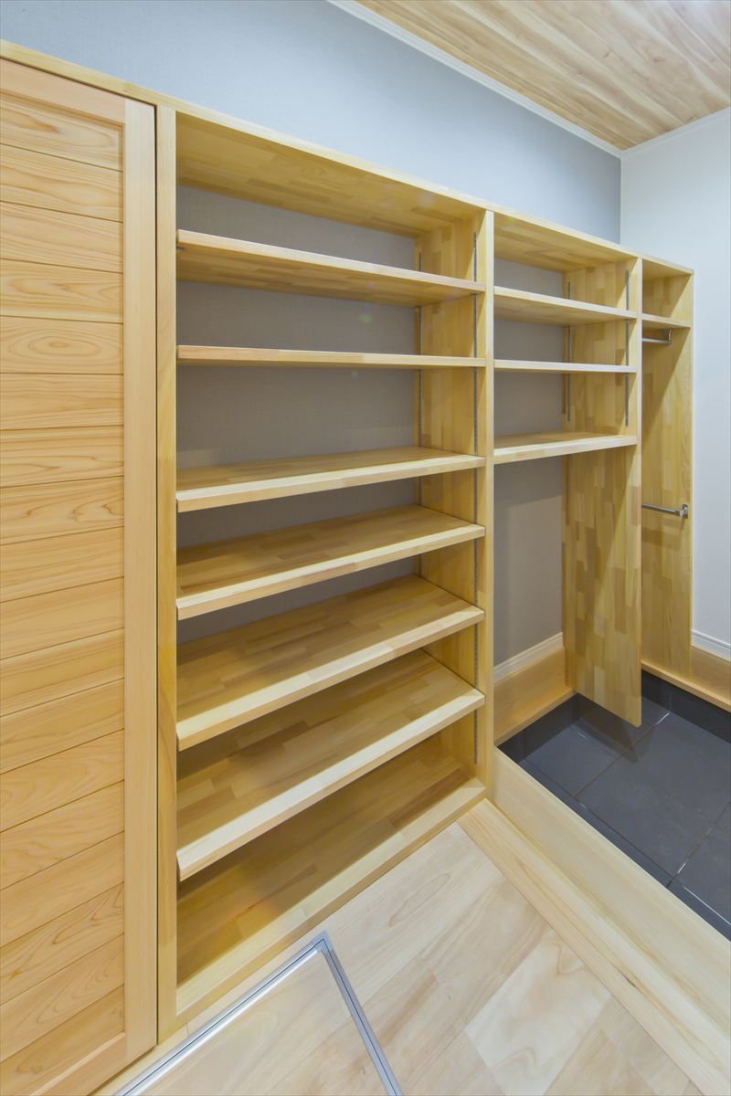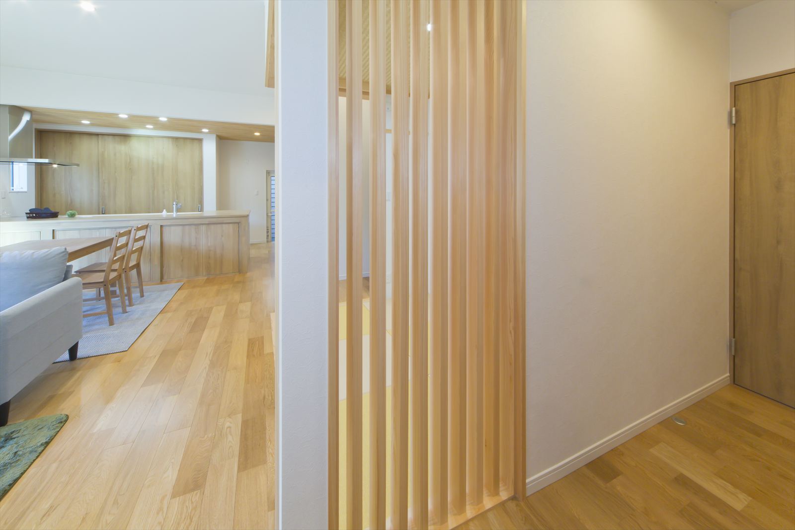 リビングから1枚の扉を開くと、家族のプライベートルームへと繋がる平屋建てのH様邸は実に機能的。キッチンを囲むように造作されたカウンターは、キッチンと高さを合わせているので作業台としても大活躍することでしょう。そのカウンターの下は、すべて収納スペースとして確保されており開閉はプッシュ式の両開き戸なので見た目もスッキリ。また、キッチン背面の3枚のスライドドアを開けると冷蔵庫以外のキッチン用品が、すべて収納できるようコンセントを完備した可動棚を造作しております。広い洗面脱衣室には、アイロンがけもできるカウンターのある収納を造作しました。