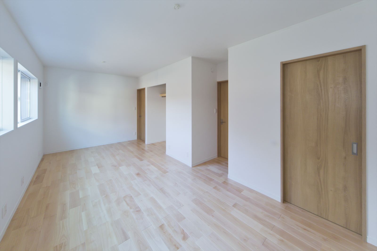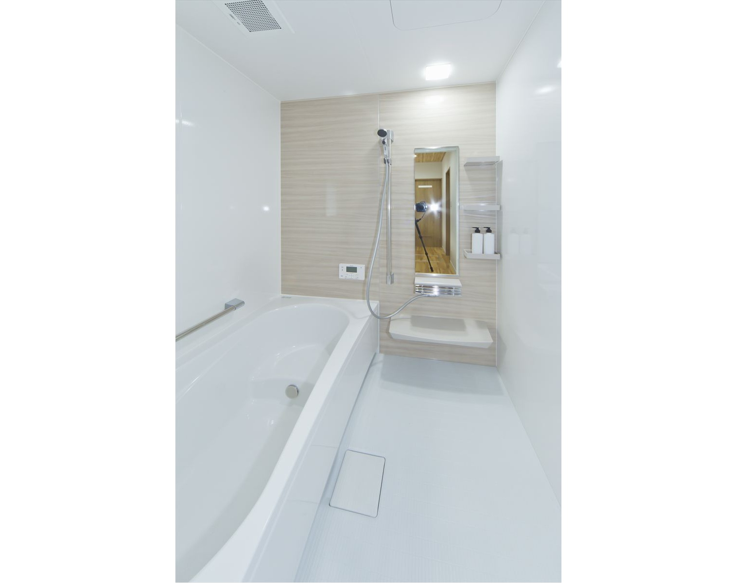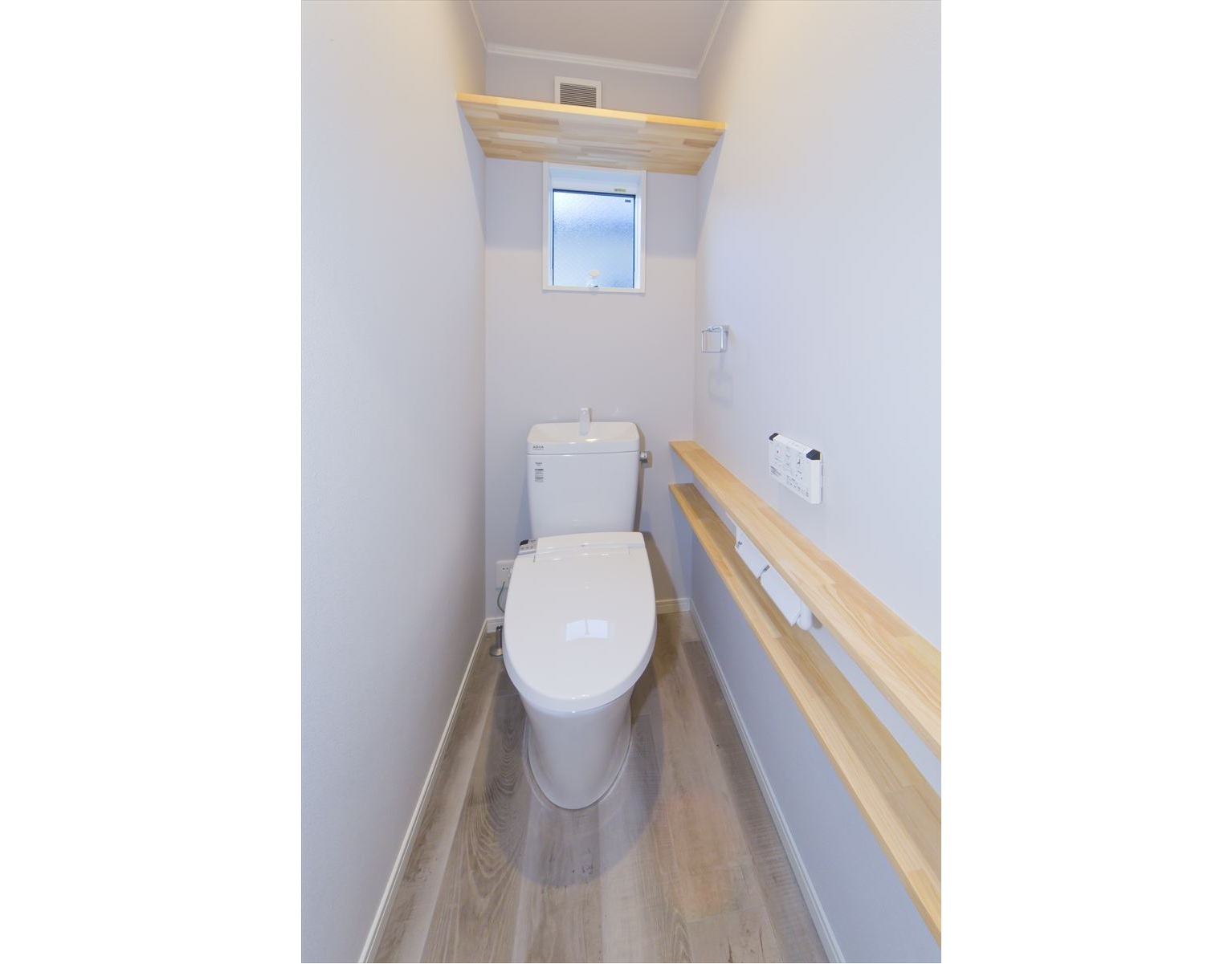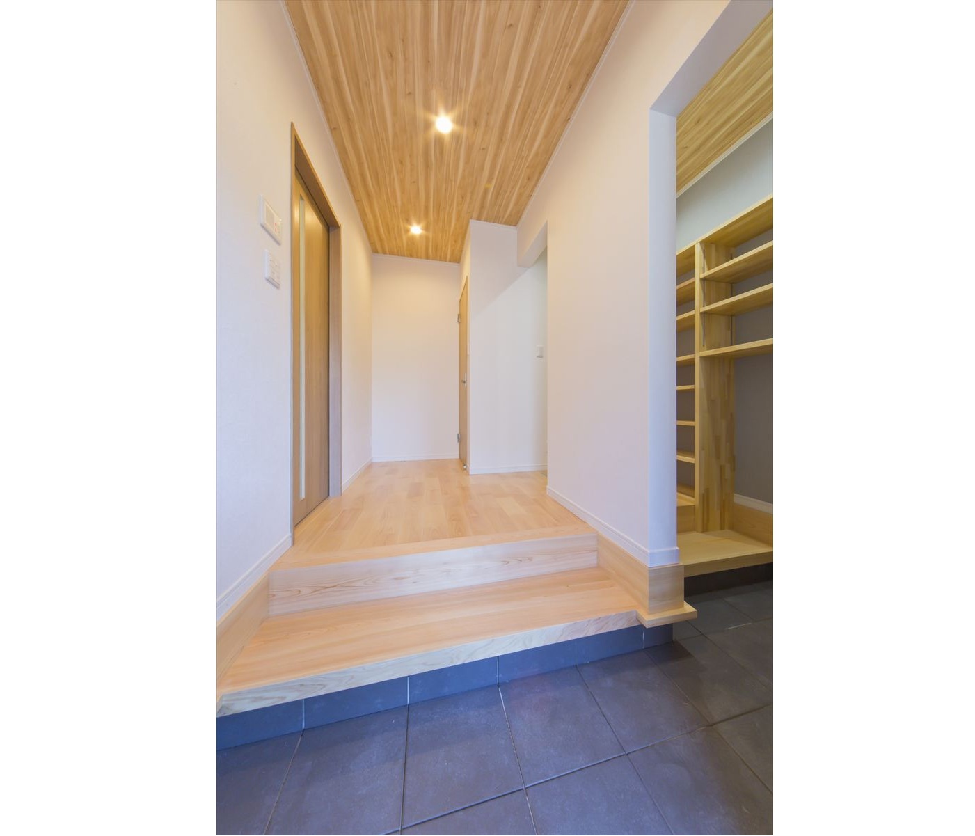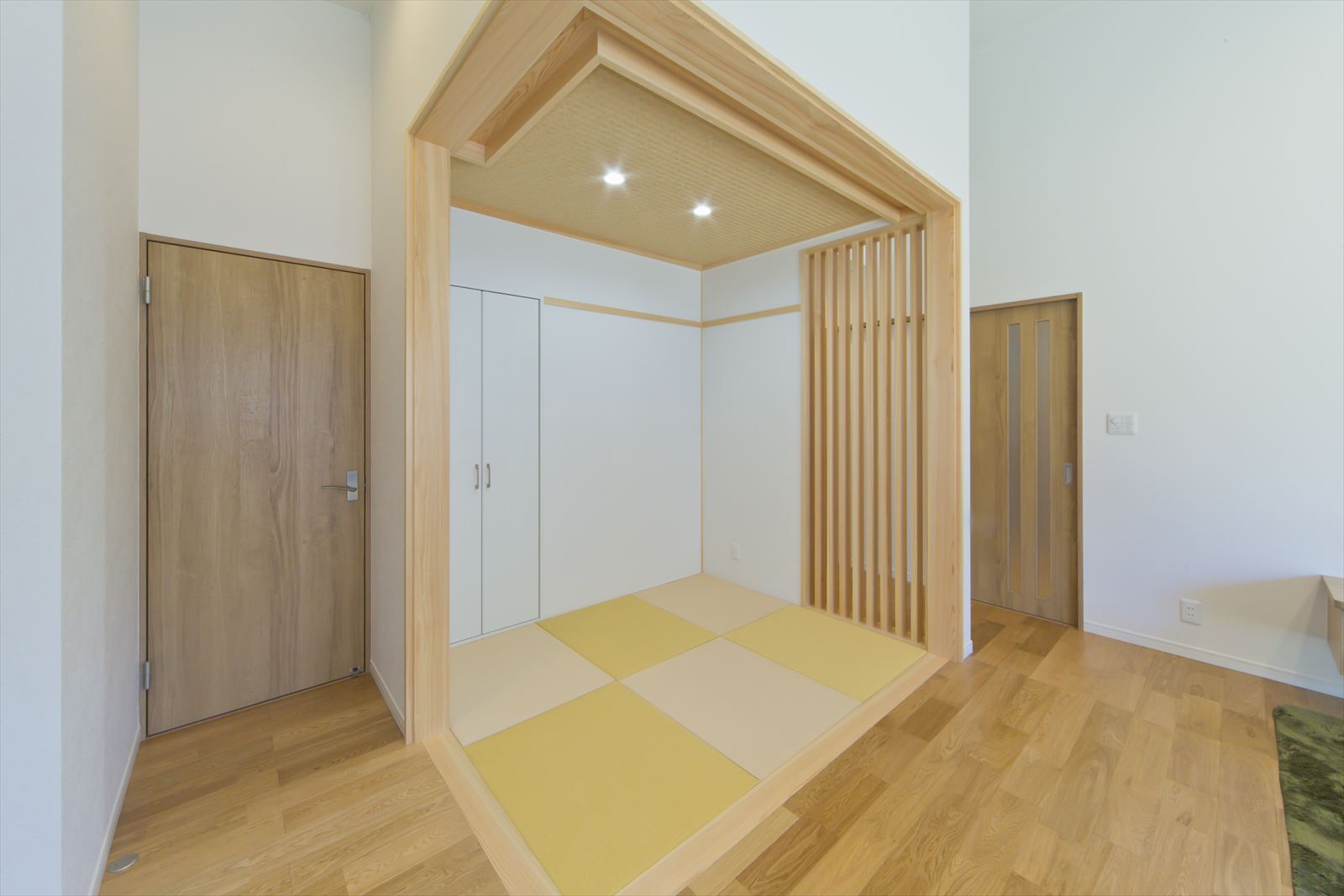 リビングから1枚の扉を開くと、家族のプライベートルームへと繋がる平屋建てのH様邸は実に機能的。キッチンを囲むように造作されたカウンターは、キッチンと高さを合わせているので作業台としても大活躍することでしょう。そのカウンターの下は、すべて収納スペースとして確保されており開閉はプッシュ式の両開き戸なので見た目もスッキリ。また、キッチン背面の3枚のスライドドアを開けると冷蔵庫以外のキッチン用品が、すべて収納できるようコンセントを完備した可動棚を造作しております。広い洗面脱衣室には、アイロンがけもできるカウンターのある収納を造作しました。