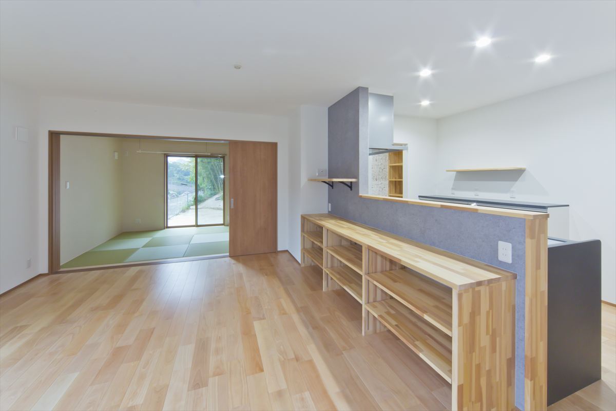 将来を考えて、十分な収納スペースを確保いたしました。玄関には、コート掛けのあるシューズクロークを造作。キッチン奥には、マグネットクロスを使用して作った掲示板のあるパントリーなど、どこを見ても安心できる収納力。また、キッチンカウンターの収納棚は、可動式なので棚板を取り外すとスタディーコーナーへと変身できます。
