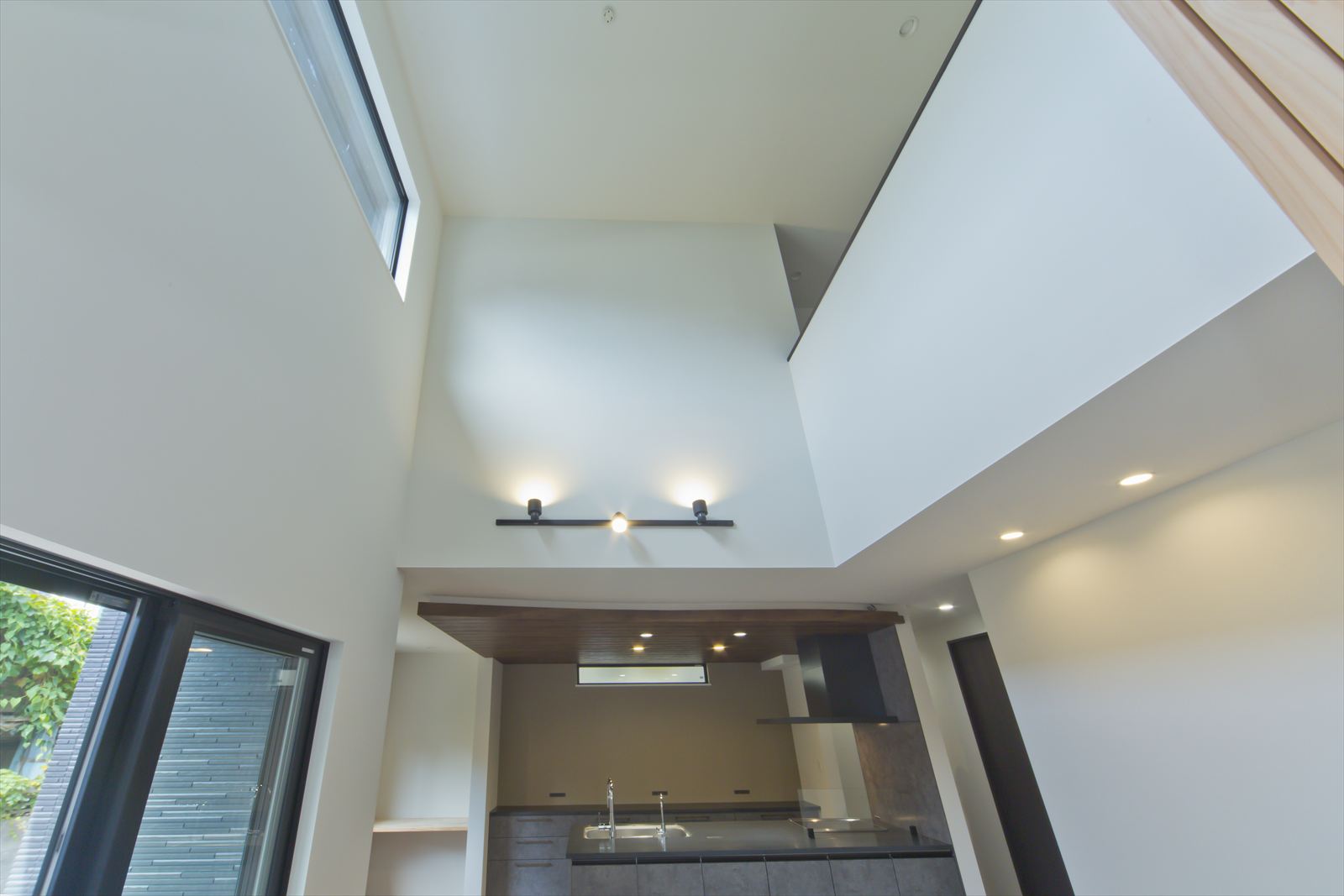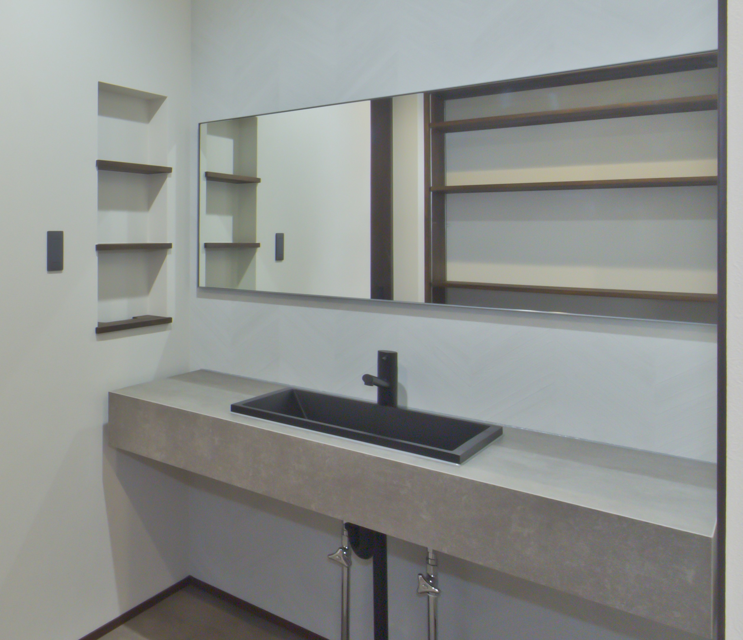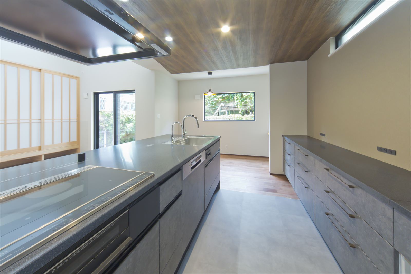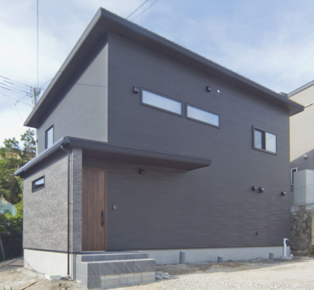 ダーク色で、コーディネートされたH様邸。住宅密集地という立地条件だったため、通りからの視線が気にならないよう窓の配置を考慮されました。玄関ドアを開くと奥へと広がる土間スペース。この奥行が、お施主様の家作りへのこだわりとセンスを想像させます。玄関ホールに配置されている洗面台は、すっきりと洗練されたミラタップのモルタナ洗面。そこからリビングへ入ると圧巻の見上げる大きな吹き抜けが、やすらぎの自然光を降り注いできます。この吹き抜けは、2階ホールとも繋がっており建物全体を繋げ、豊かな暮らしを育んでくれることでしょう。