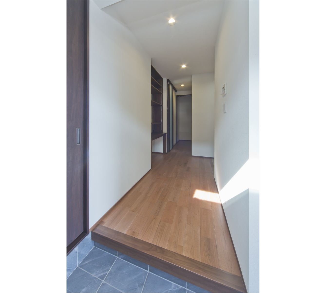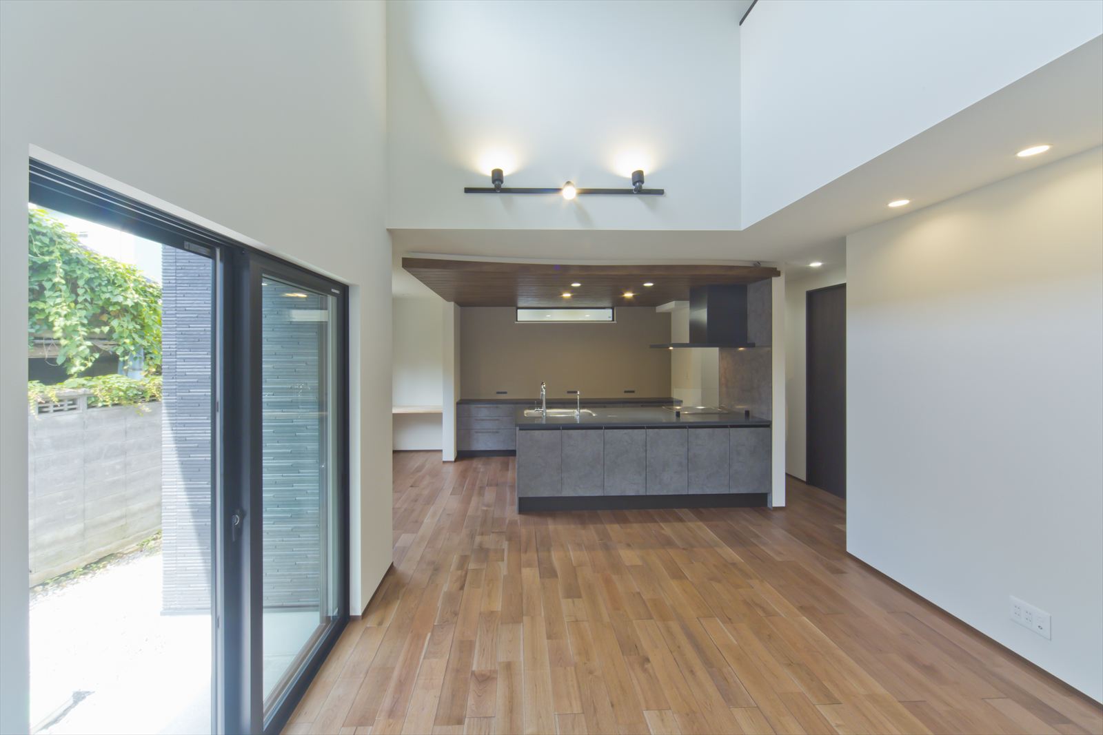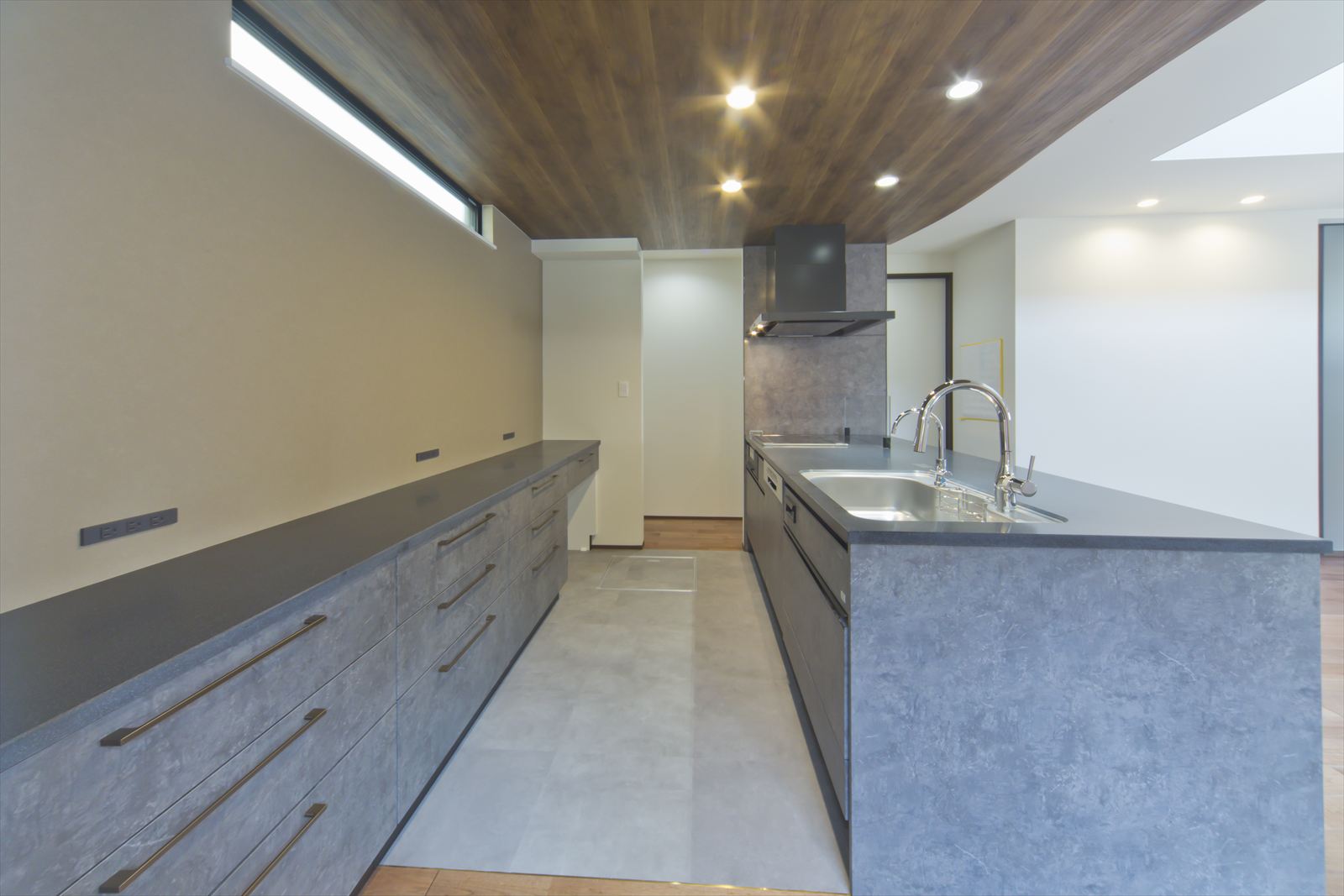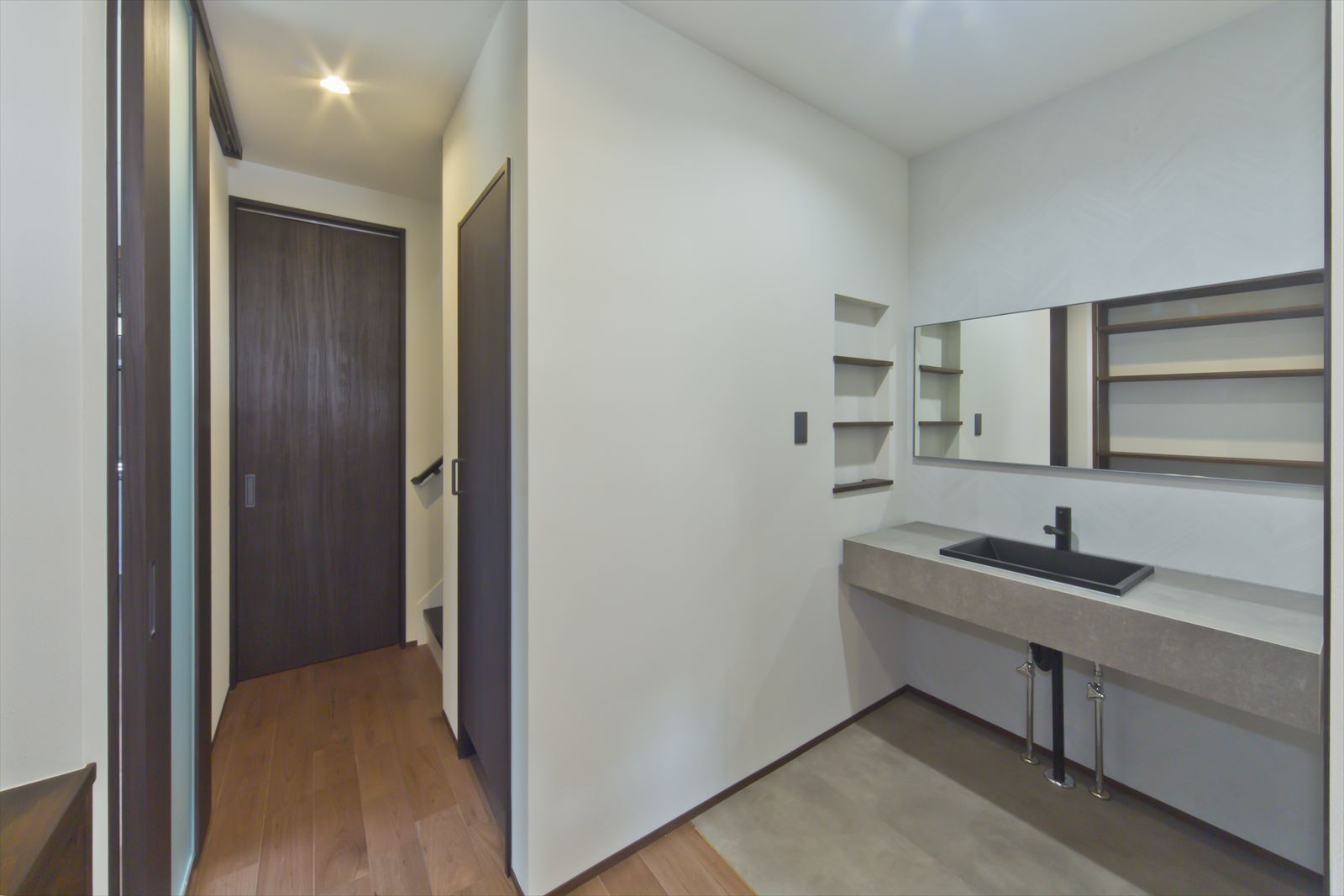 ダーク色で、コーディネートされたH様邸。住宅密集地という立地条件だったため、通りからの視線が気にならないよう窓の配置を考慮されました。玄関ドアを開くと奥へと広がる土間スペース。この奥行が、お施主様の家作りへのこだわりとセンスを想像させます。玄関ホールに配置されている洗面台は、すっきりと洗練されたミラタップのモルタナ洗面。そこからリビングへ入ると圧巻の見上げる大きな吹き抜けが、やすらぎの自然光を降り注いできます。この吹き抜けは、2階ホールとも繋がっており建物全体を繋げ、豊かな暮らしを育んでくれることでしょう。