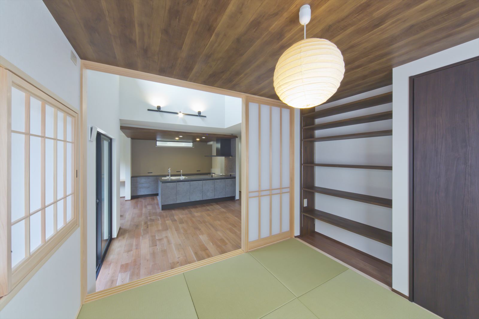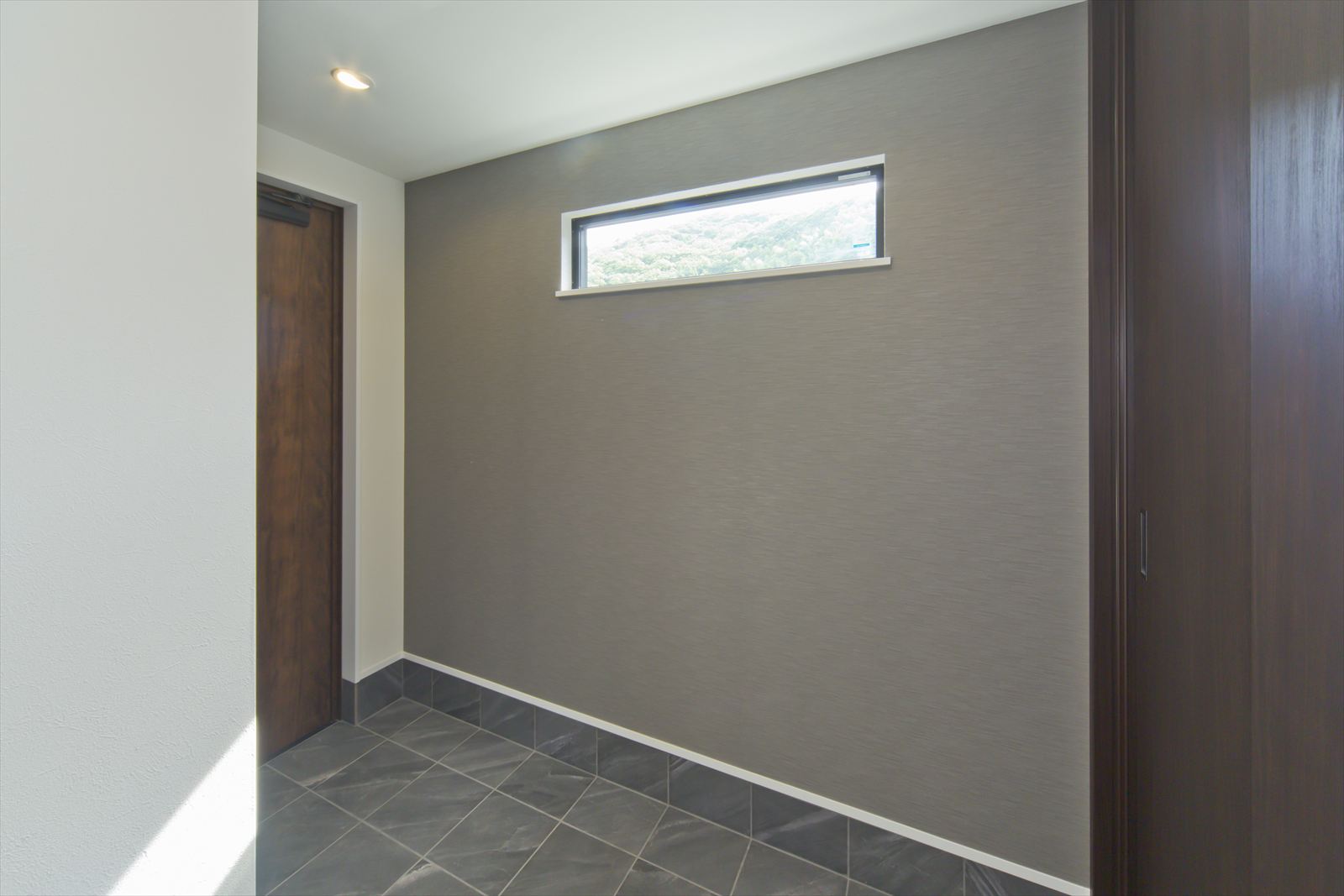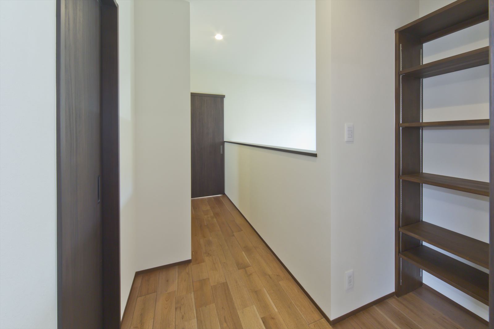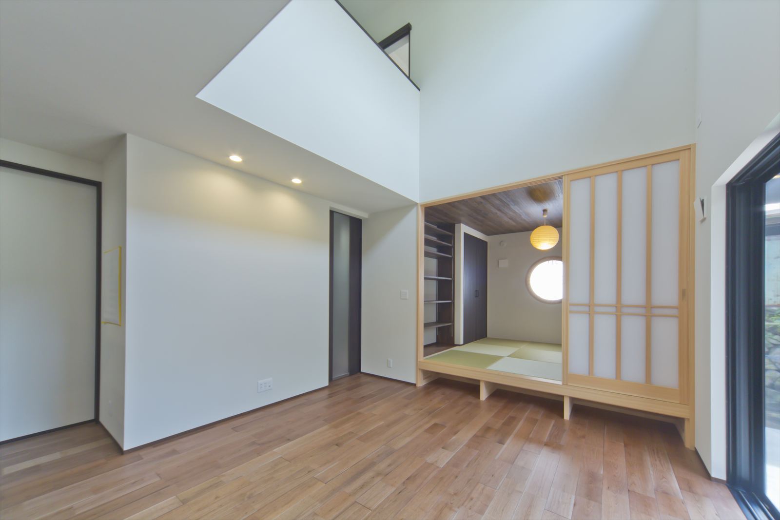 ダーク色で、コーディネートされたH様邸。住宅密集地という立地条件だったため、通りからの視線が気にならないよう窓の配置を考慮されました。玄関ドアを開くと奥へと広がる土間スペース。この奥行が、お施主様の家作りへのこだわりとセンスを想像させます。玄関ホールに配置されている洗面台は、すっきりと洗練されたミラタップのモルタナ洗面。そこからリビングへ入ると圧巻の見上げる大きな吹き抜けが、やすらぎの自然光を降り注いできます。この吹き抜けは、2階ホールとも繋がっており建物全体を繋げ、豊かな暮らしを育んでくれることでしょう。