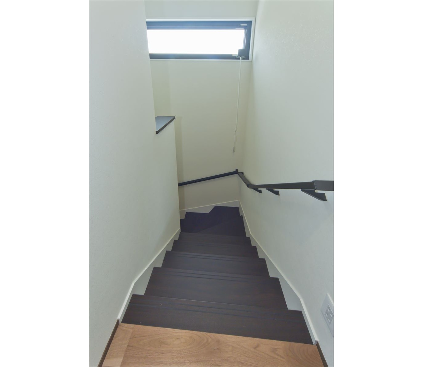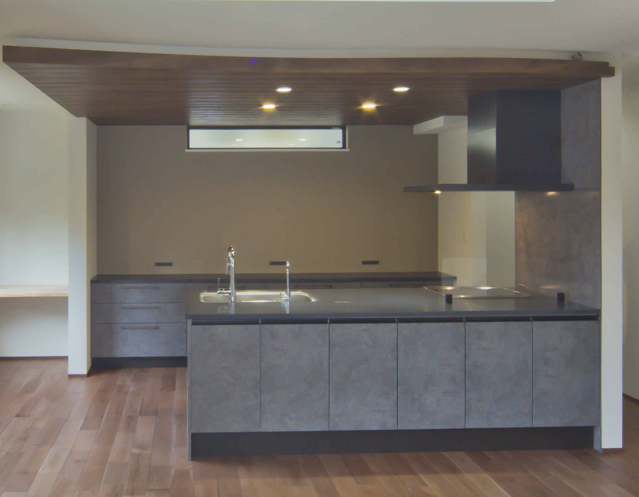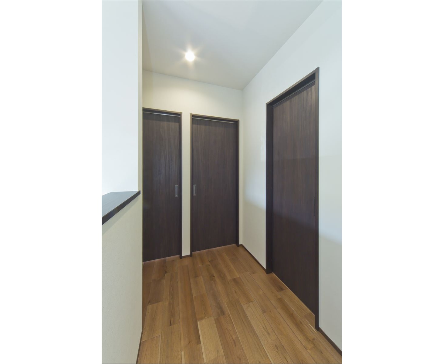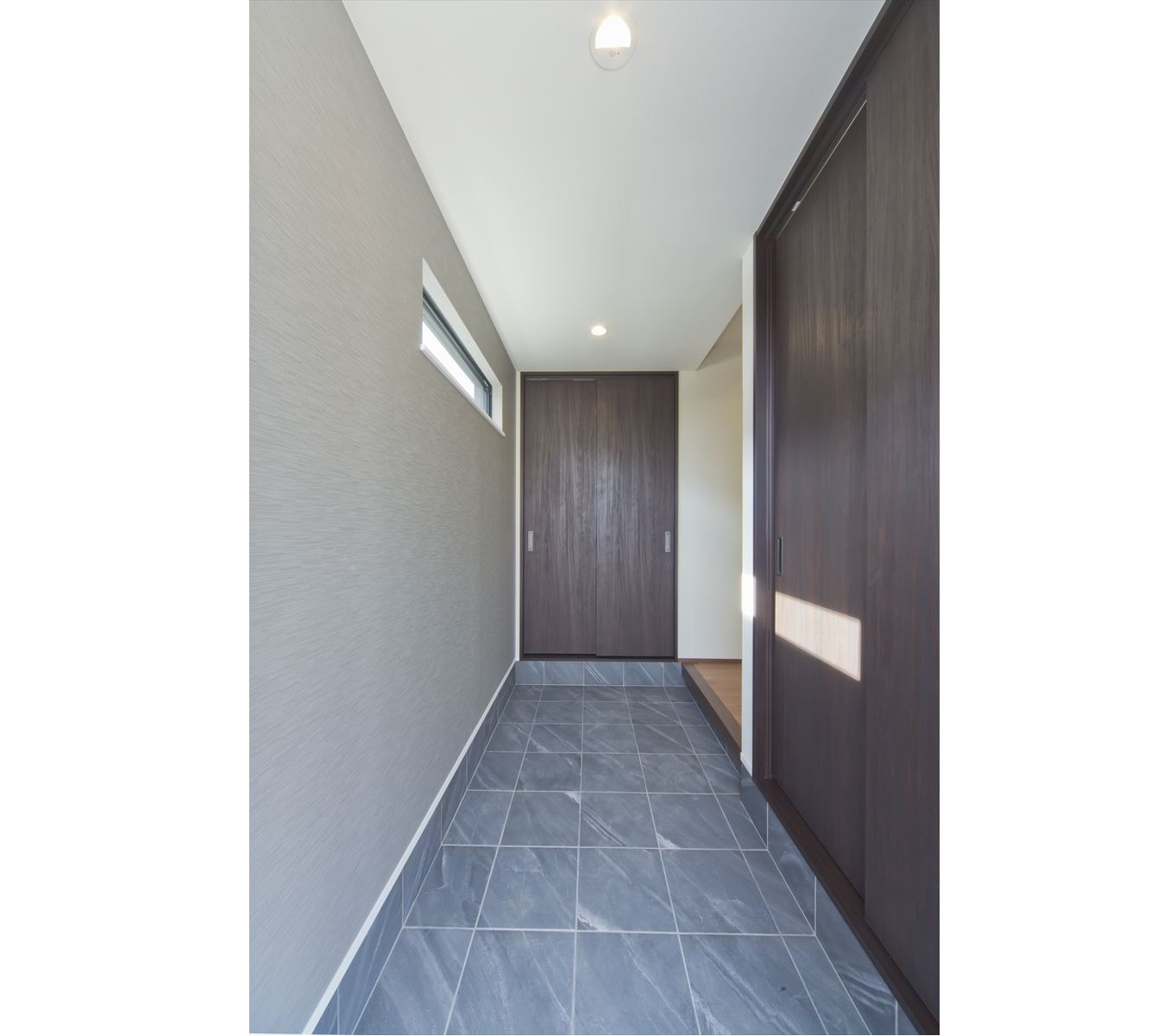 ダーク色で、コーディネートされたH様邸。住宅密集地という立地条件だったため、通りからの視線が気にならないよう窓の配置を考慮されました。玄関ドアを開くと奥へと広がる土間スペース。この奥行が、お施主様の家作りへのこだわりとセンスを想像させます。玄関ホールに配置されている洗面台は、すっきりと洗練されたミラタップのモルタナ洗面。そこからリビングへ入ると圧巻の見上げる大きな吹き抜けが、やすらぎの自然光を降り注いできます。この吹き抜けは、2階ホールとも繋がっており建物全体を繋げ、豊かな暮らしを育んでくれることでしょう。