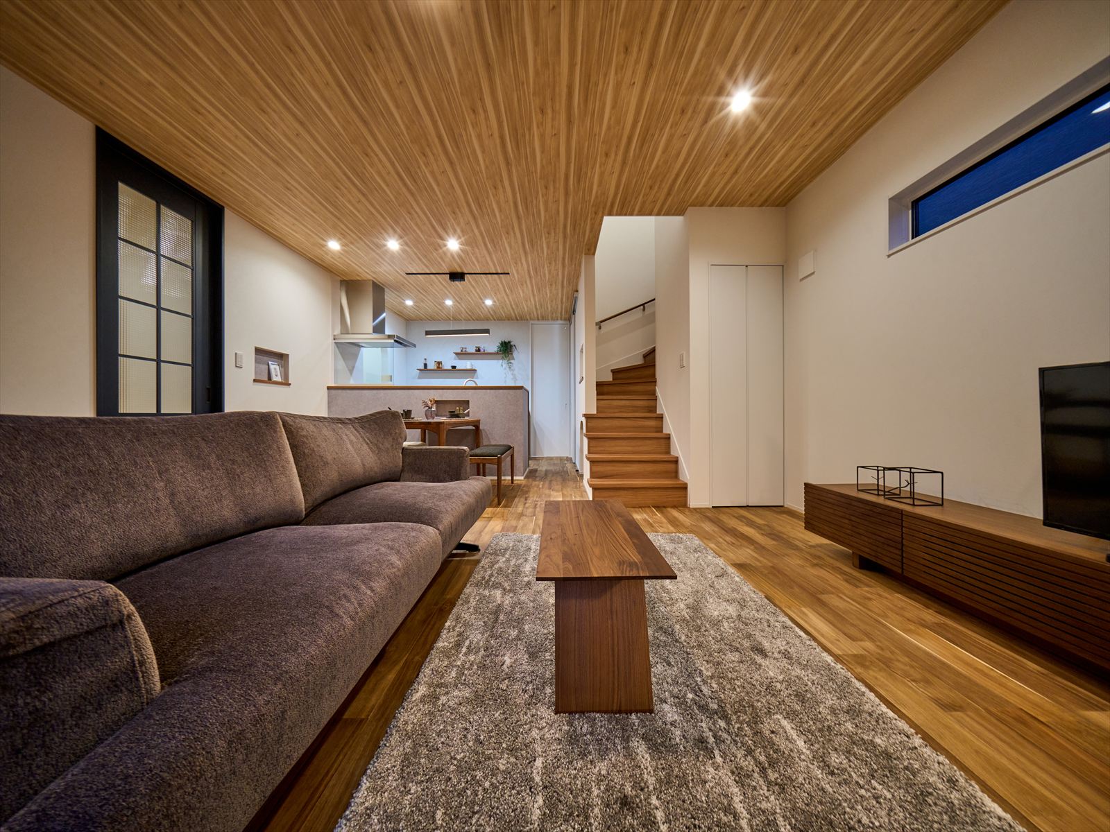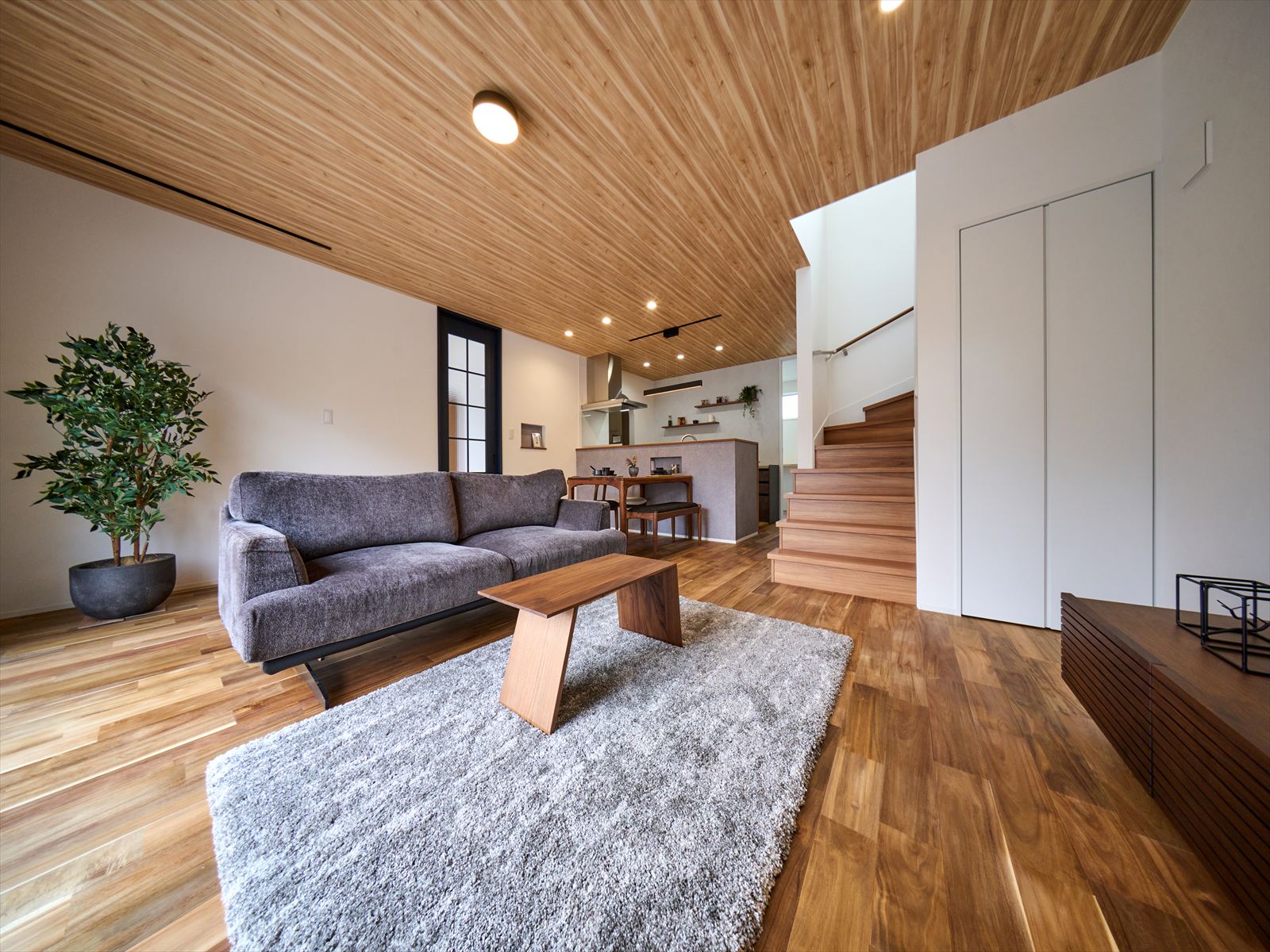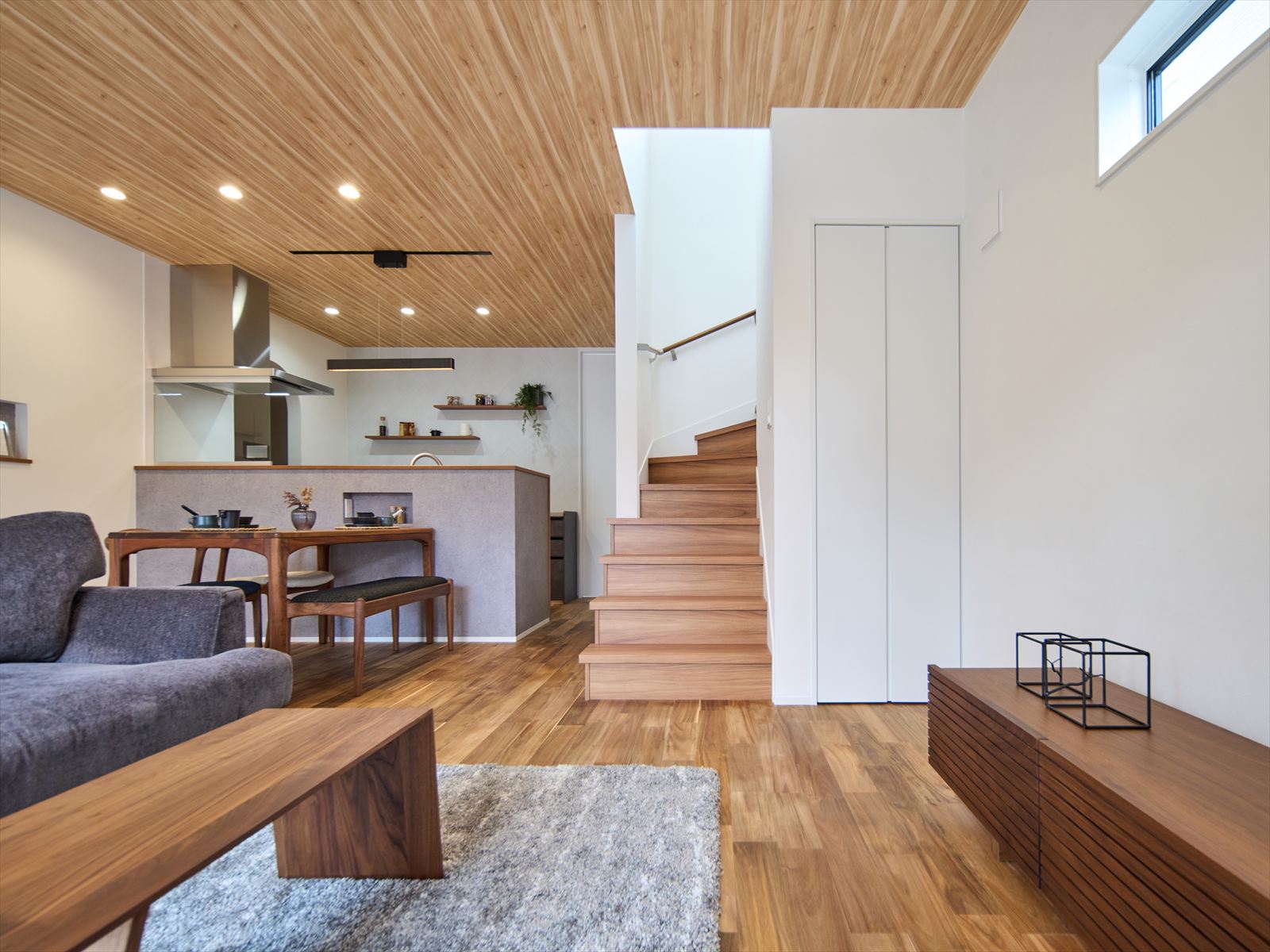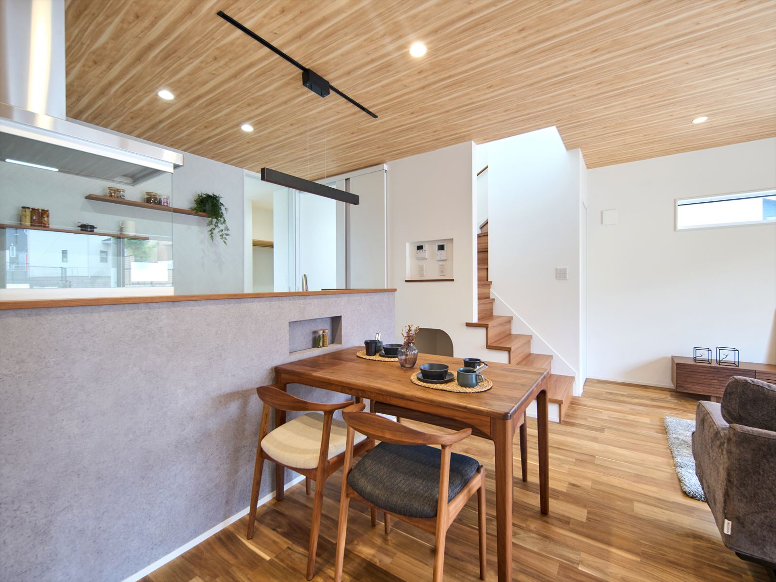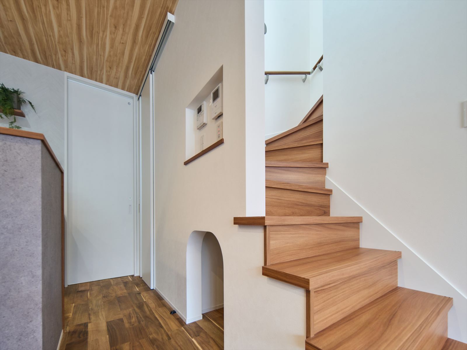 訪れた人の第一印象となる玄関スペースは、シューズクロークまでフラットに土間が続く開放感のある設計。シューズクロークは、そのまま室内へとつながっているので、外出時・帰宅時の動線がスムーズ。玄関ホールとリビングの床材は、深みのある色合いが特徴の「無垢材アカシア」。天井の木目柄と調和し、温かみと重厚感を演出し豊かな時間を作ってくれることでしょう。また、階段下にルンバ専用の小部屋があるところも見逃せないポイントです。