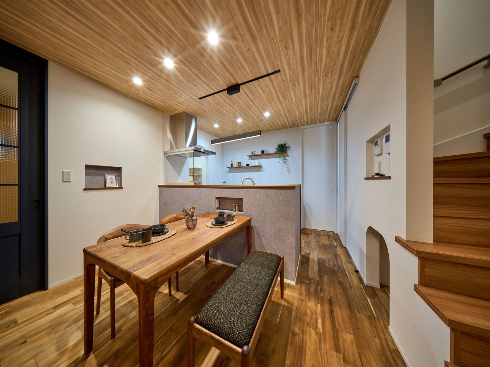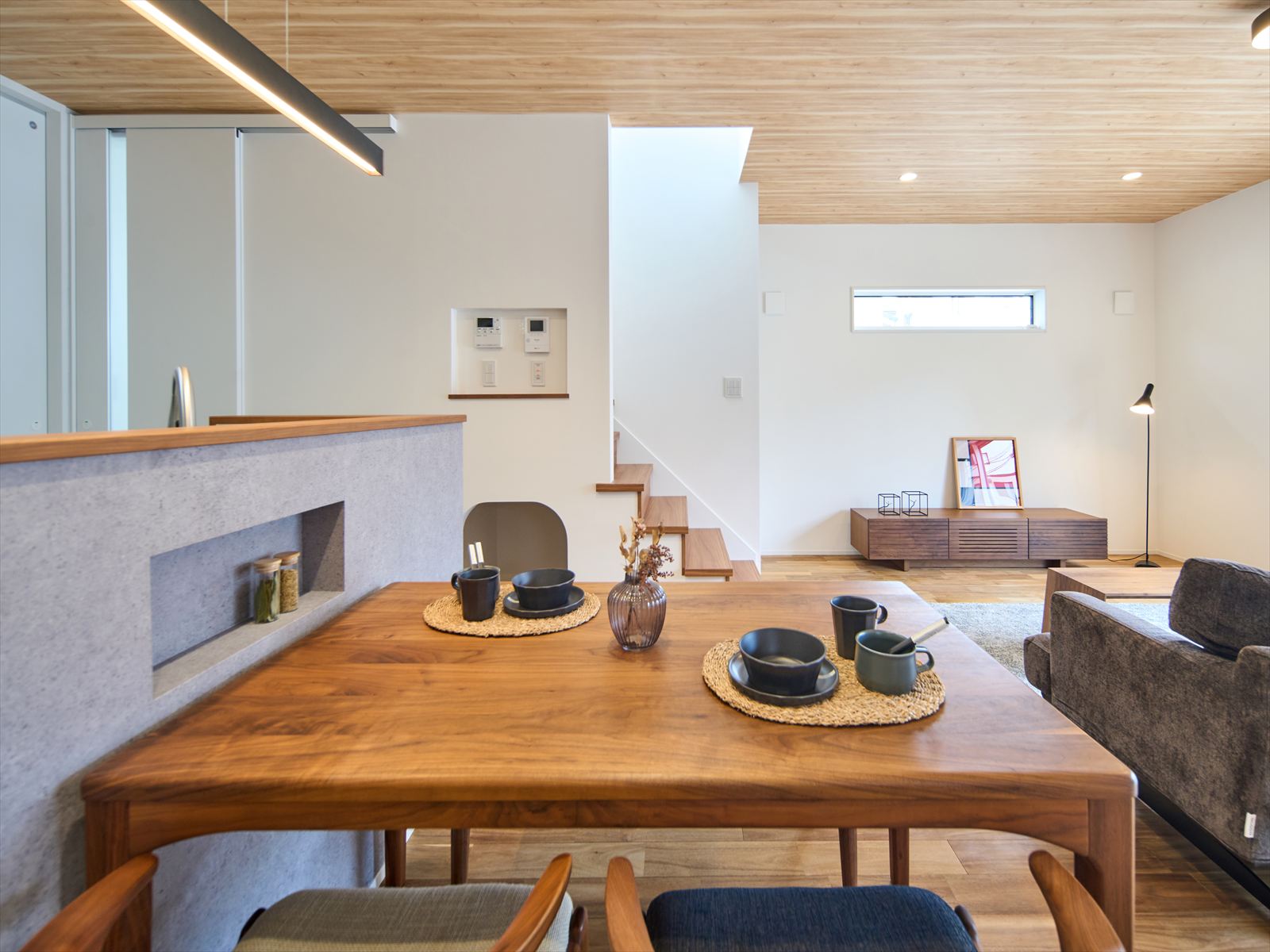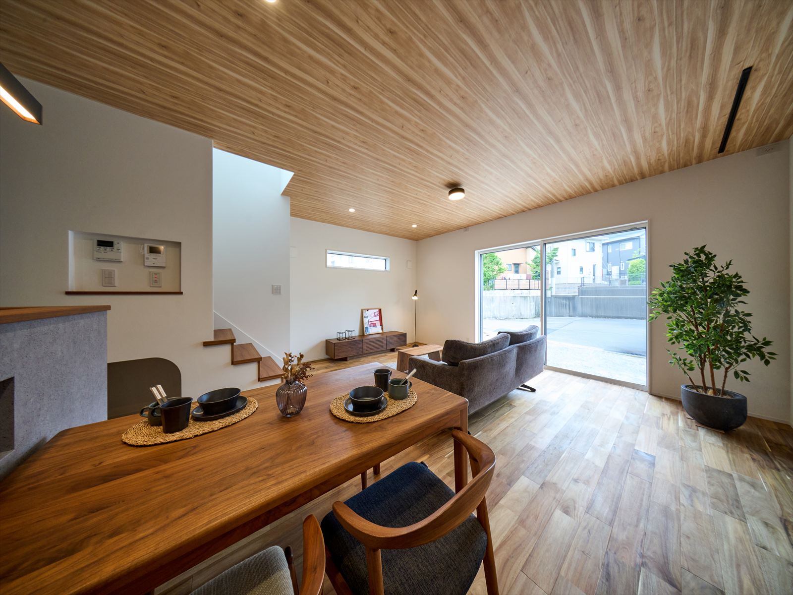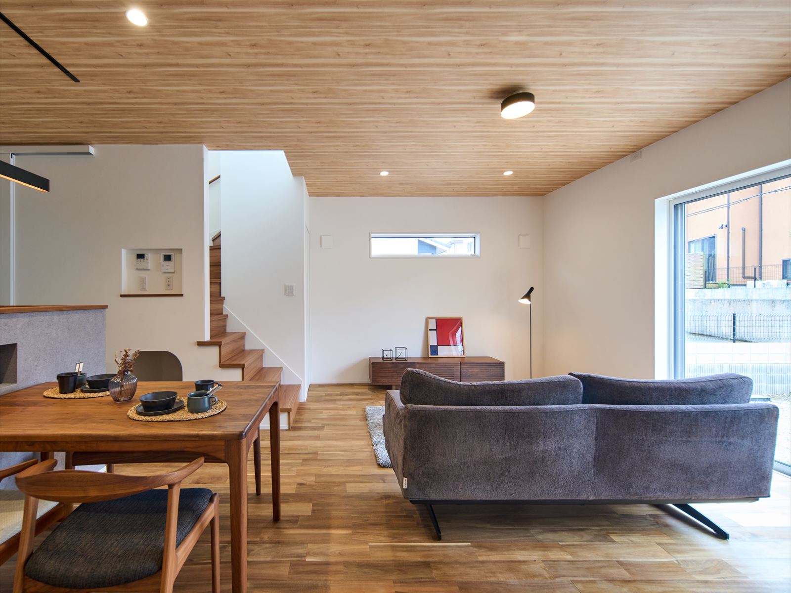 訪れた人の第一印象となる玄関スペースは、シューズクロークまでフラットに土間が続く開放感のある設計。シューズクロークは、そのまま室内へとつながっているので、外出時・帰宅時の動線がスムーズ。玄関ホールとリビングの床材は、深みのある色合いが特徴の「無垢材アカシア」。天井の木目柄と調和し、温かみと重厚感を演出し豊かな時間を作ってくれることでしょう。また、階段下にルンバ専用の小部屋があるところも見逃せないポイントです。