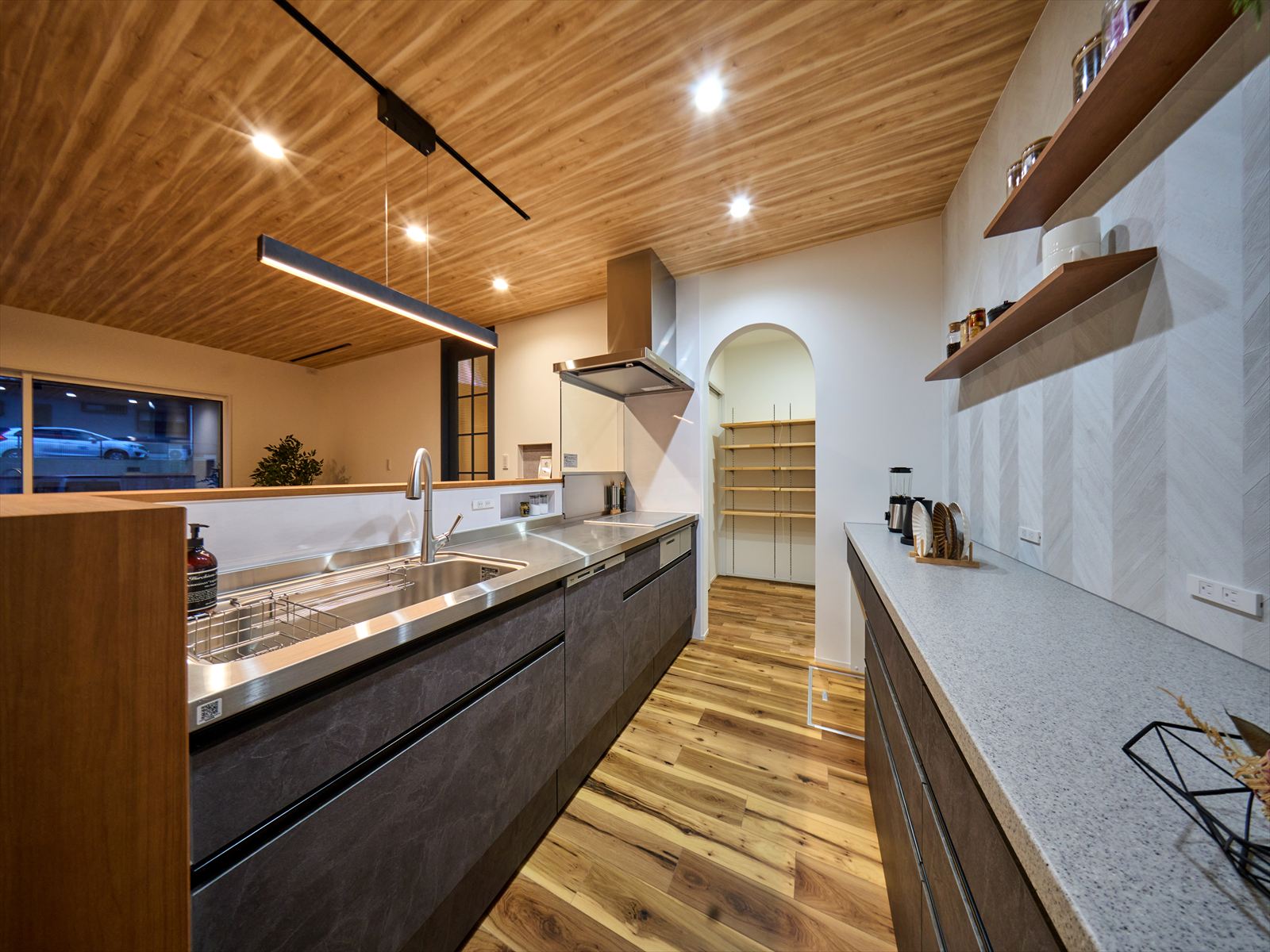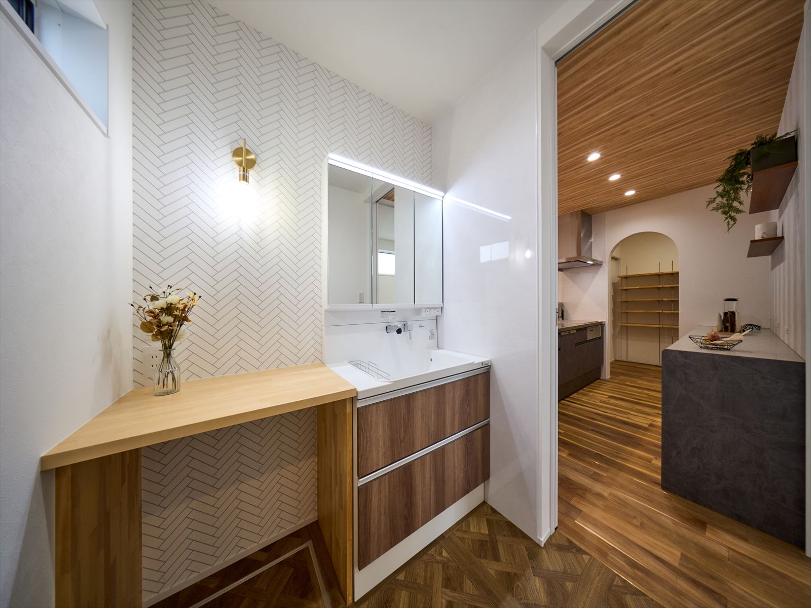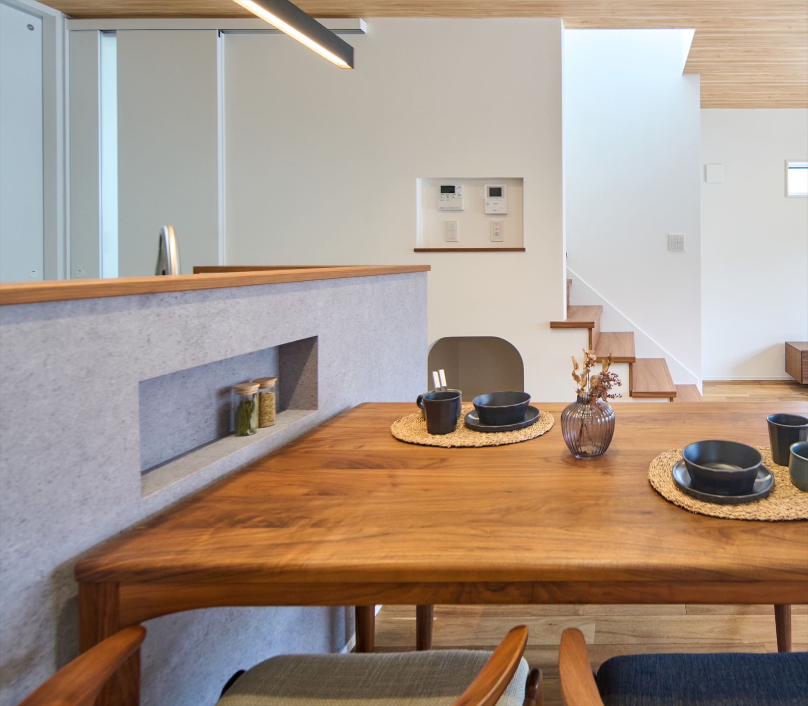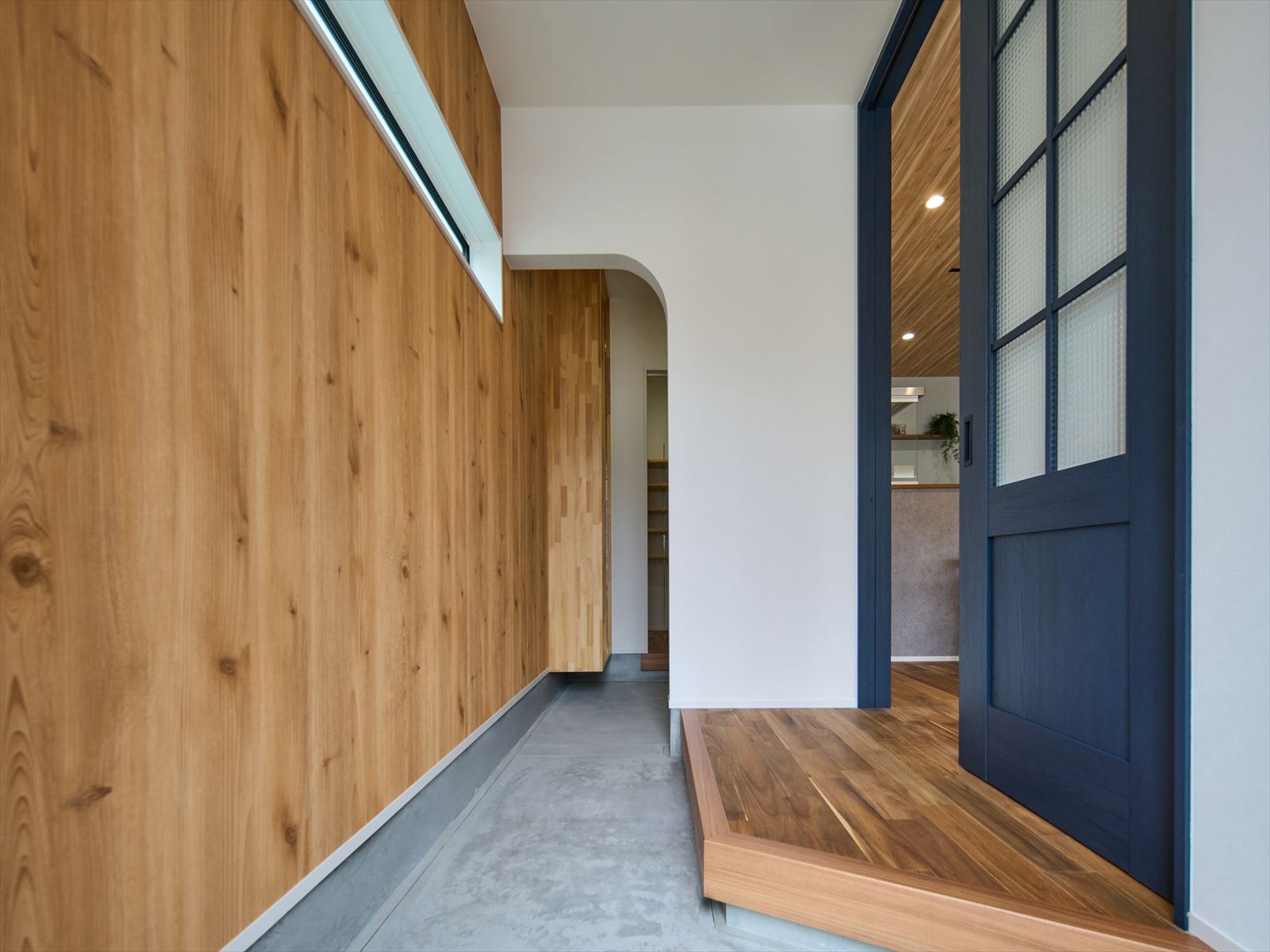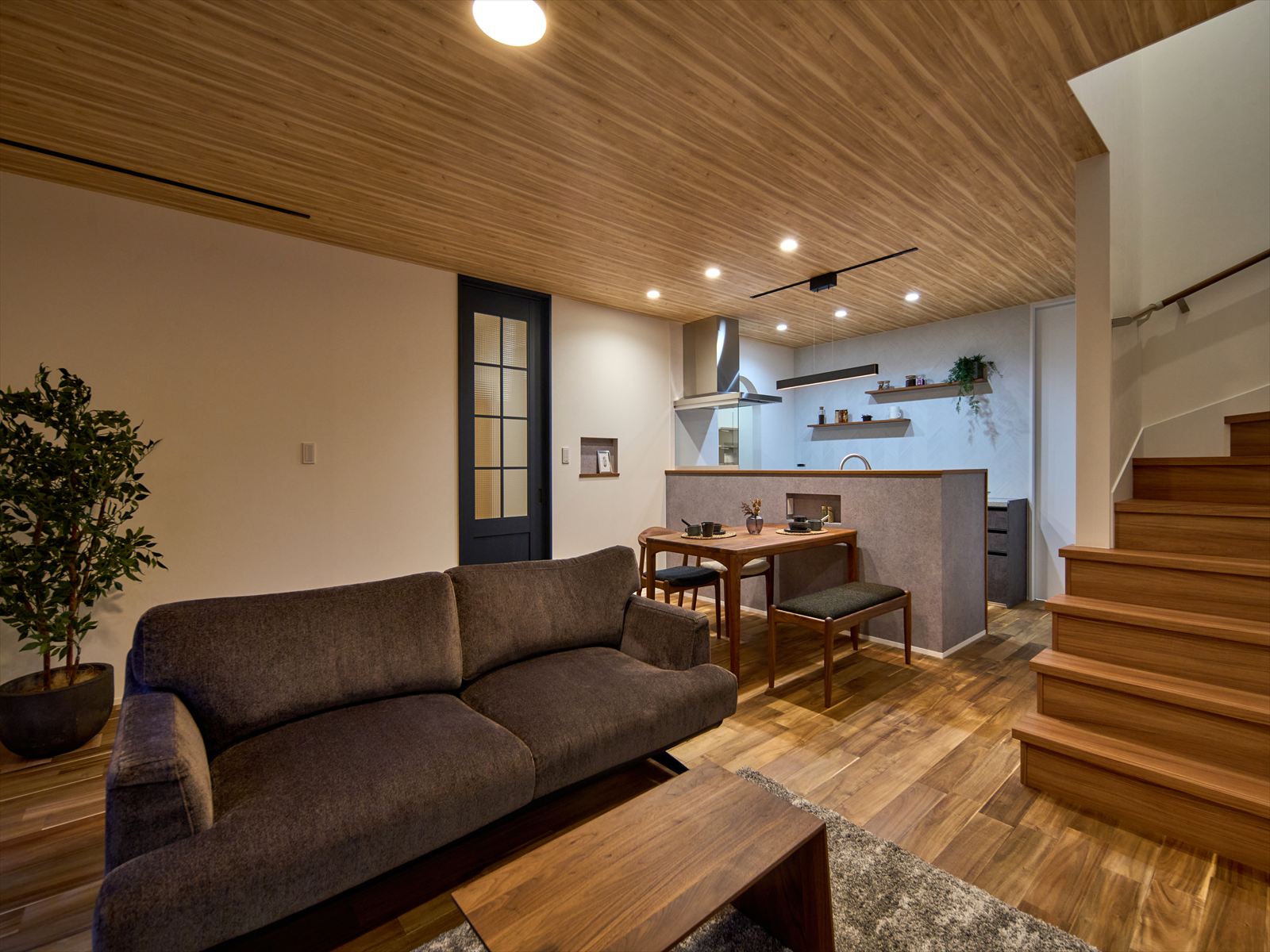 訪れた人の第一印象となる玄関スペースは、シューズクロークまでフラットに土間が続く開放感のある設計。シューズクロークは、そのまま室内へとつながっているので、外出時・帰宅時の動線がスムーズ。玄関ホールとリビングの床材は、深みのある色合いが特徴の「無垢材アカシア」。天井の木目柄と調和し、温かみと重厚感を演出し豊かな時間を作ってくれることでしょう。また、階段下にルンバ専用の小部屋があるところも見逃せないポイントです。