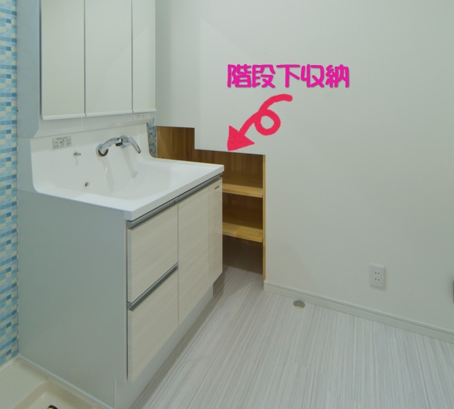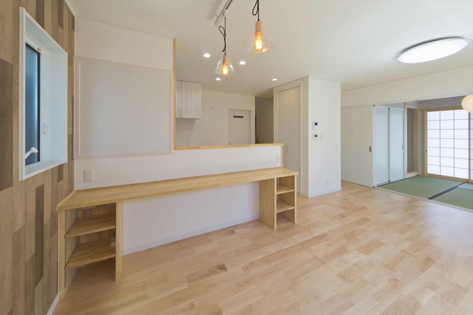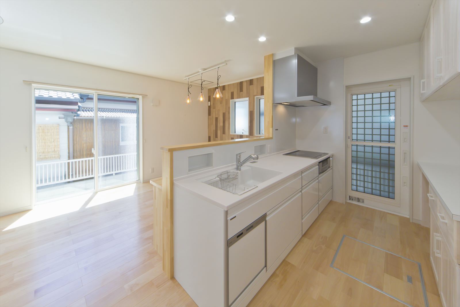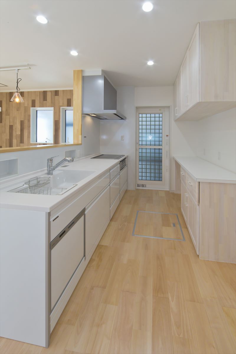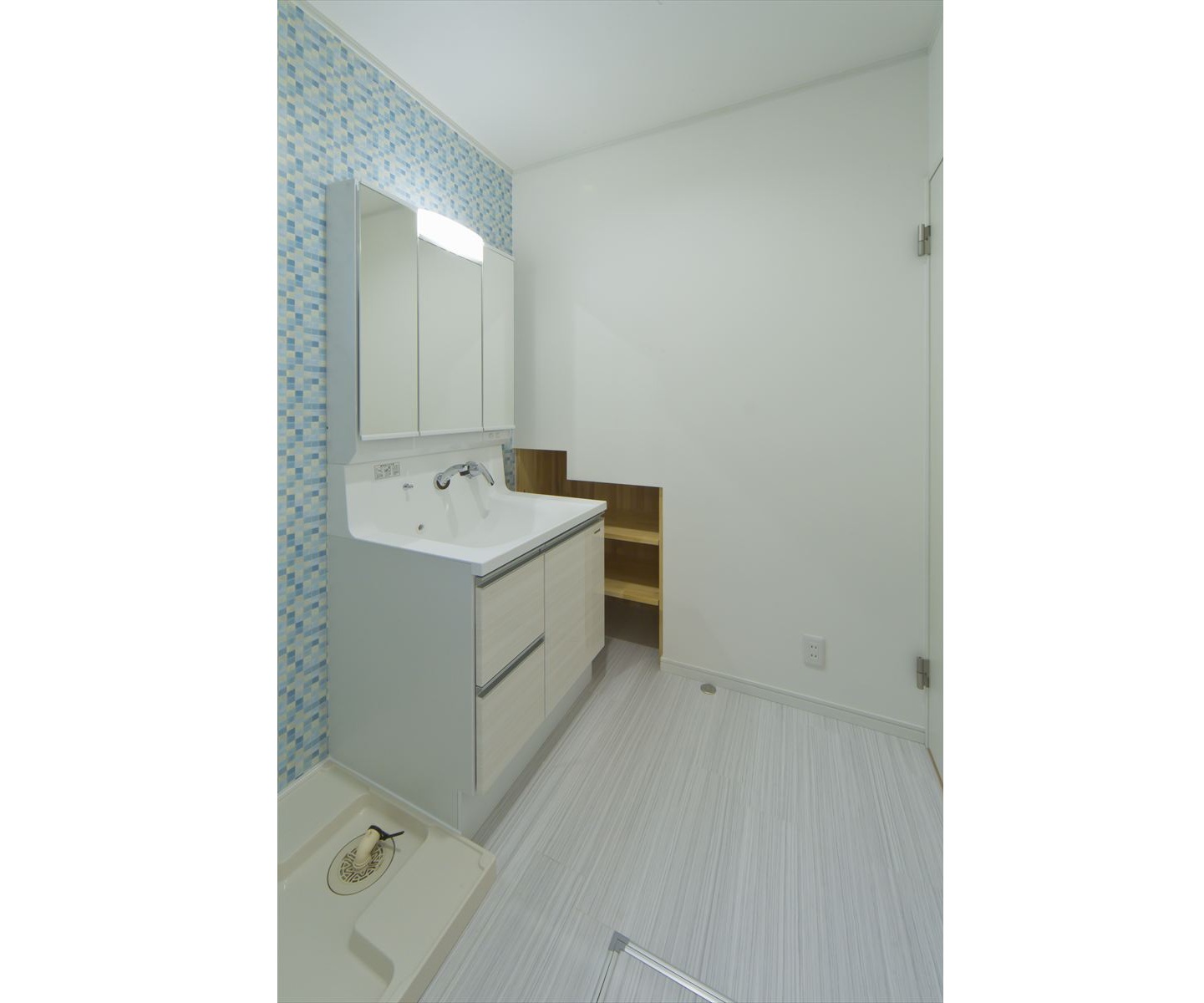 白と青のコントラストが鮮やかなS様邸には、自由設計ならではの、ご紹介ポイントがたくさんあります。シューズクロークは、玄関ホールへと通り抜けられるように配置されているのでスッキリと無駄のない玄関ホールとなっており、そのホールの壁には、ちょっとした小物などが置けるニッチを2か所設置しました。家族が集まるダイニングには、収納棚付きの長いカウンターやマグネットクロスの掲示板を造作し、キッチンの背面には、手作りの収納棚を造作しています。また、隣り合った洗面脱衣室とトイレには、それぞれに階段下スペースを利用して作った収納スペースを確保しています。無駄のない工夫が、毎日の暮らしを応援してくれることでしょう。