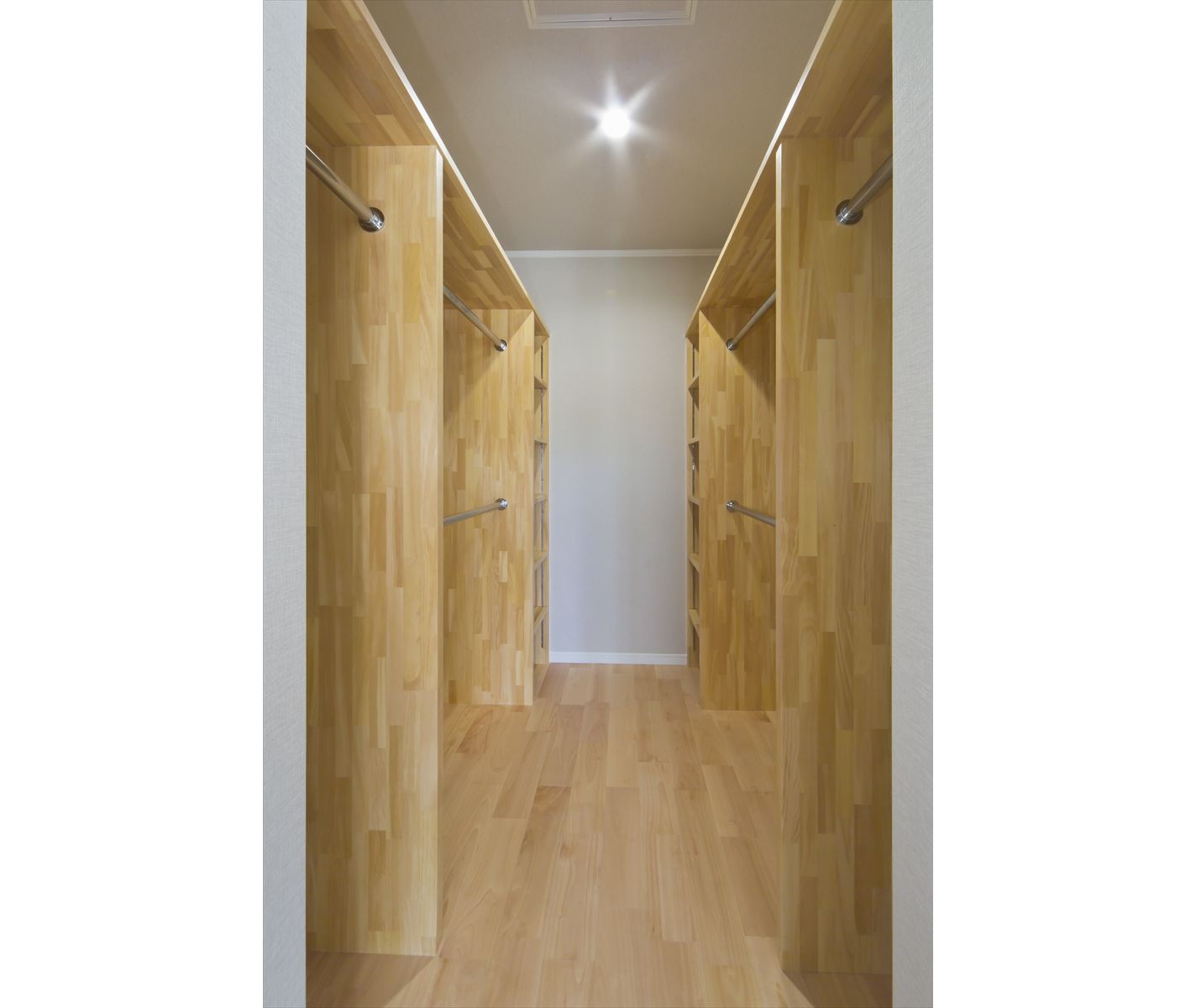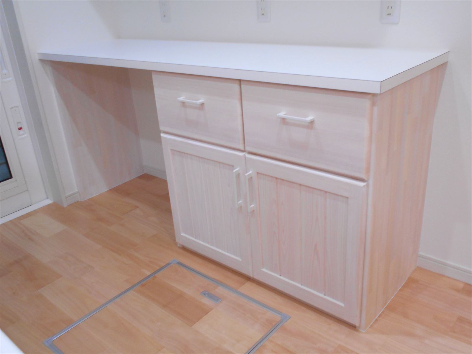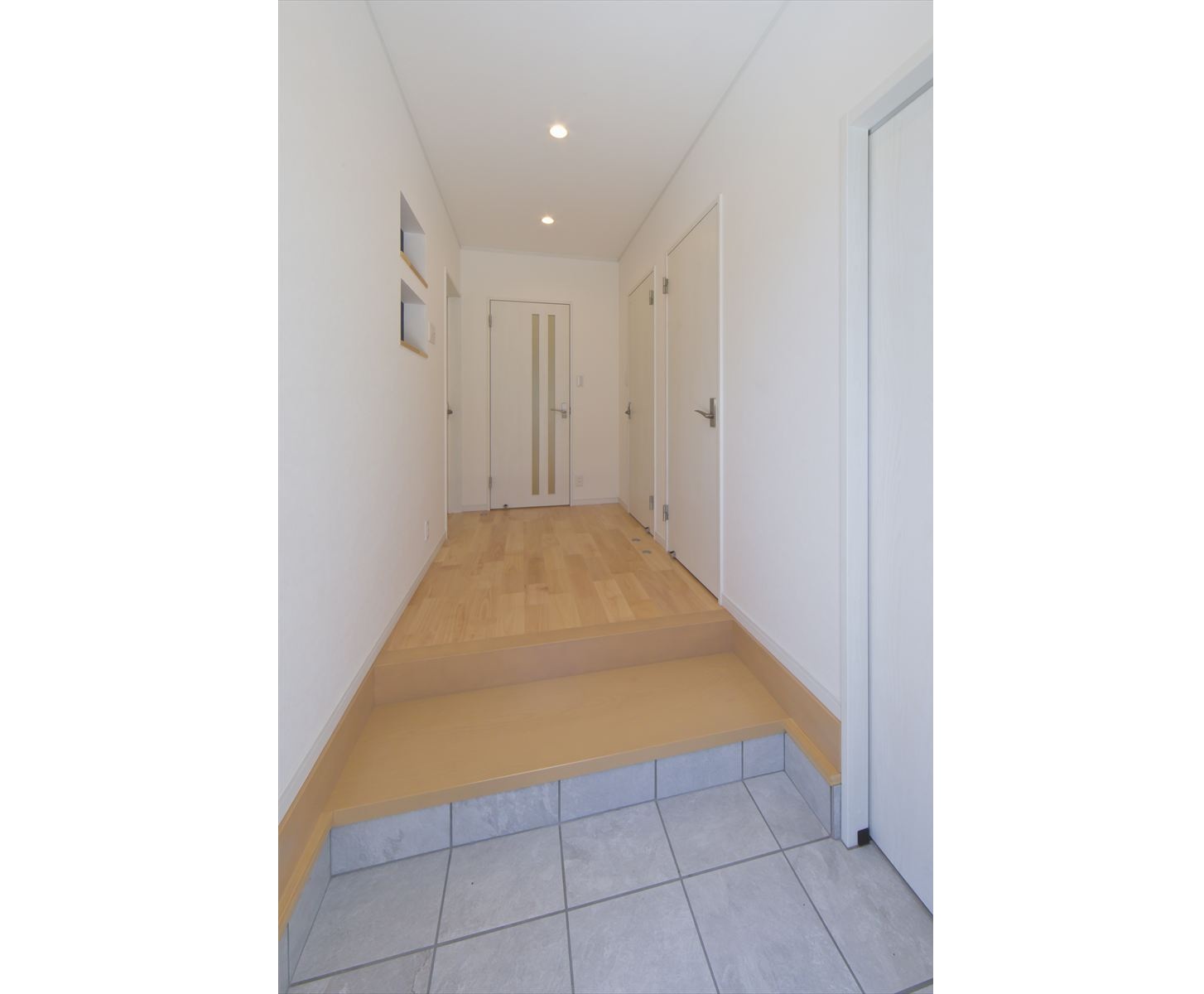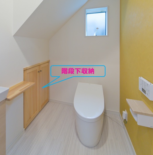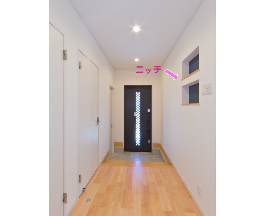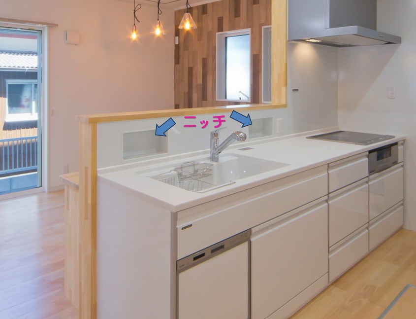 白と青のコントラストが鮮やかなS様邸には、自由設計ならではの、ご紹介ポイントがたくさんあります。シューズクロークは、玄関ホールへと通り抜けられるように配置されているのでスッキリと無駄のない玄関ホールとなっており、そのホールの壁には、ちょっとした小物などが置けるニッチを2か所設置しました。家族が集まるダイニングには、収納棚付きの長いカウンターやマグネットクロスの掲示板を造作し、キッチンの背面には、手作りの収納棚を造作しています。また、隣り合った洗面脱衣室とトイレには、それぞれに階段下スペースを利用して作った収納スペースを確保しています。無駄のない工夫が、毎日の暮らしを応援してくれることでしょう。