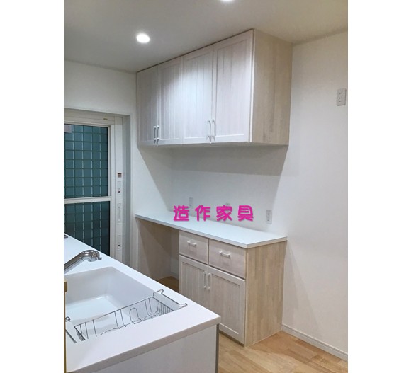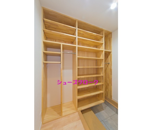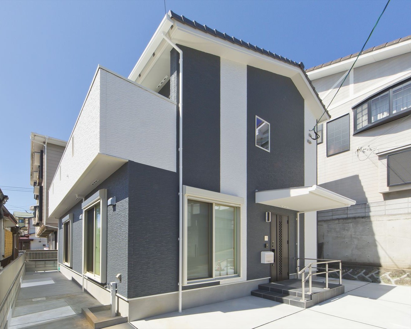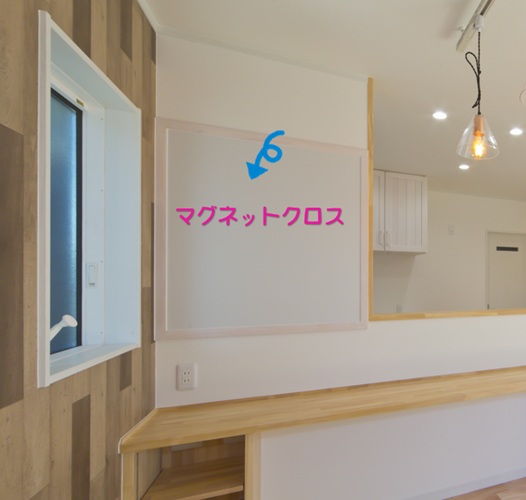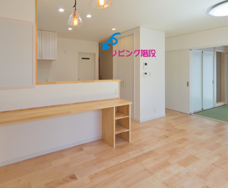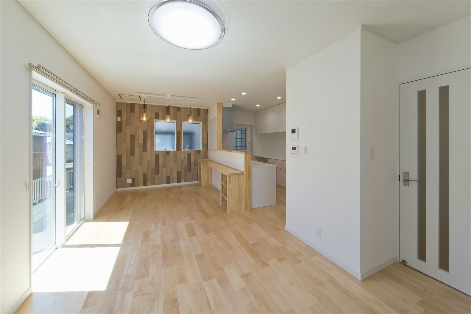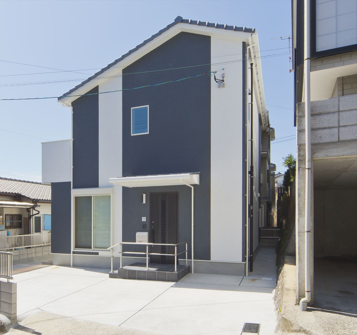 白と青のコントラストが鮮やかなS様邸には、自由設計ならではの、ご紹介ポイントがたくさんあります。シューズクロークは、玄関ホールへと通り抜けられるように配置されているのでスッキリと無駄のない玄関ホールとなっており、そのホールの壁には、ちょっとした小物などが置けるニッチを2か所設置しました。家族が集まるダイニングには、収納棚付きの長いカウンターやマグネットクロスの掲示板を造作し、キッチンの背面には、手作りの収納棚を造作しています。また、隣り合った洗面脱衣室とトイレには、それぞれに階段下スペースを利用して作った収納スペースを確保しています。無駄のない工夫が、毎日の暮らしを応援してくれることでしょう。