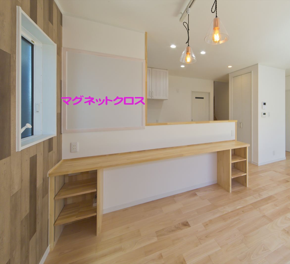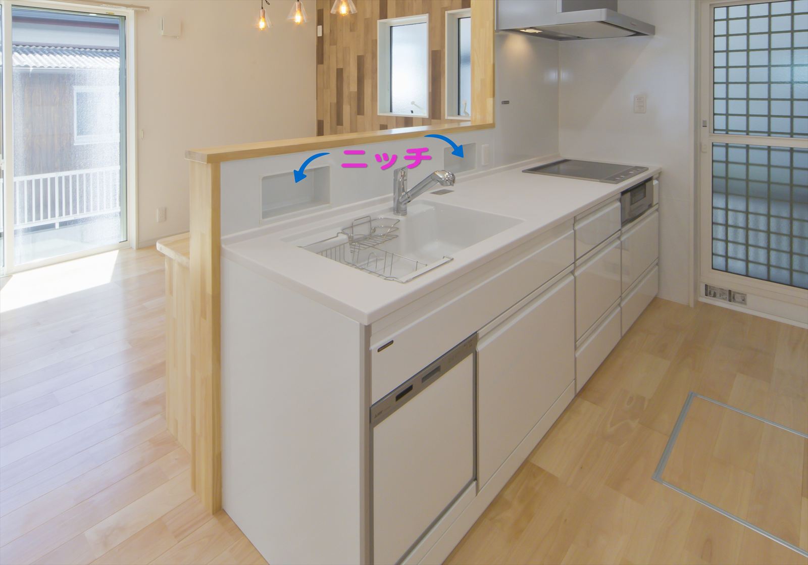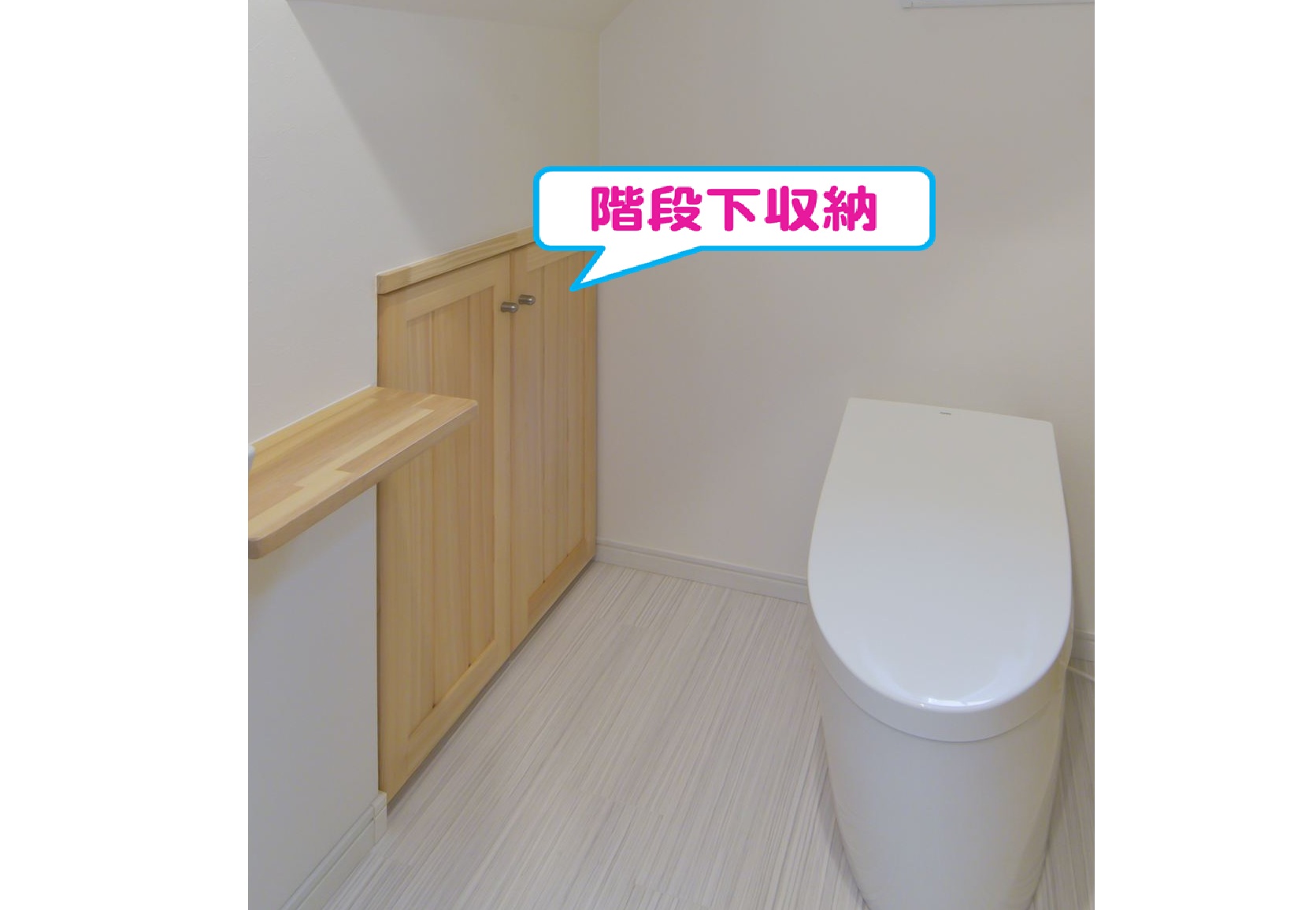 白と青のコントラストが鮮やかなS様邸には、自由設計ならではの、ご紹介ポイントがたくさんあります。シューズクロークは、玄関ホールへと通り抜けられるように配置されているのでスッキリと無駄のない玄関ホールとなっており、そのホールの壁には、ちょっとした小物などが置けるニッチを2か所設置しました。家族が集まるダイニングには、収納棚付きの長いカウンターやマグネットクロスの掲示板を造作し、キッチンの背面には、手作りの収納棚を造作しています。また、隣り合った洗面脱衣室とトイレには、それぞれに階段下スペースを利用して作った収納スペースを確保しています。無駄のない工夫が、毎日の暮らしを応援してくれることでしょう。