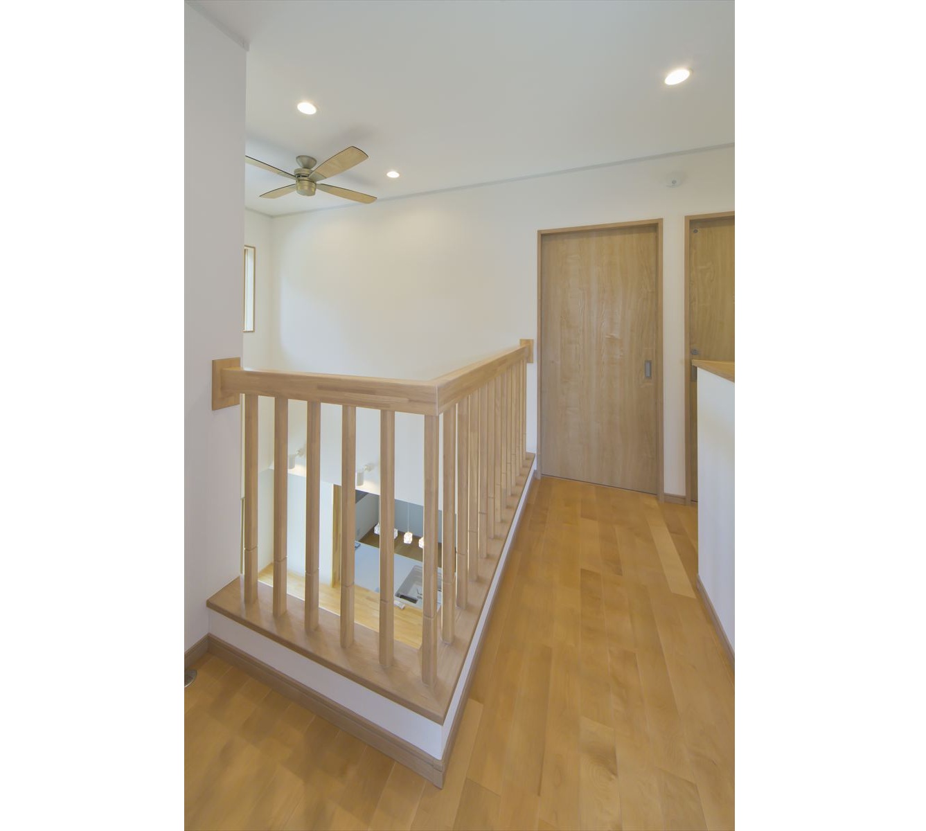 リビングへの扉を開くと吹き抜けの天井から柔らかな自然光が降り注ぐH様邸。ちょうどダイニングの真上に吹き抜けの天井があるので、キッチンに立っていても2階ホールの様子が分かり、会話を交わすことだって可能です。また、リビングを挟んで、キッチンの正面に位置するモダンな畳スペースは、3枚の引込戸の開閉によりリビングの一部として、また個室として幅広く活用することができます。