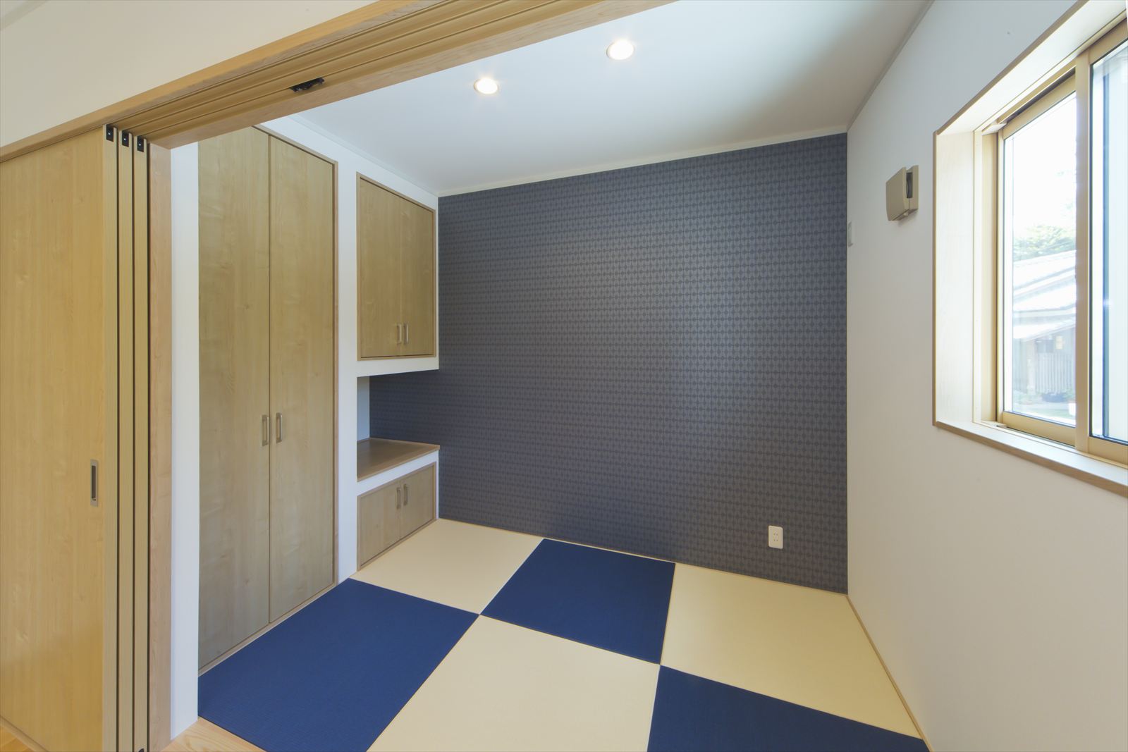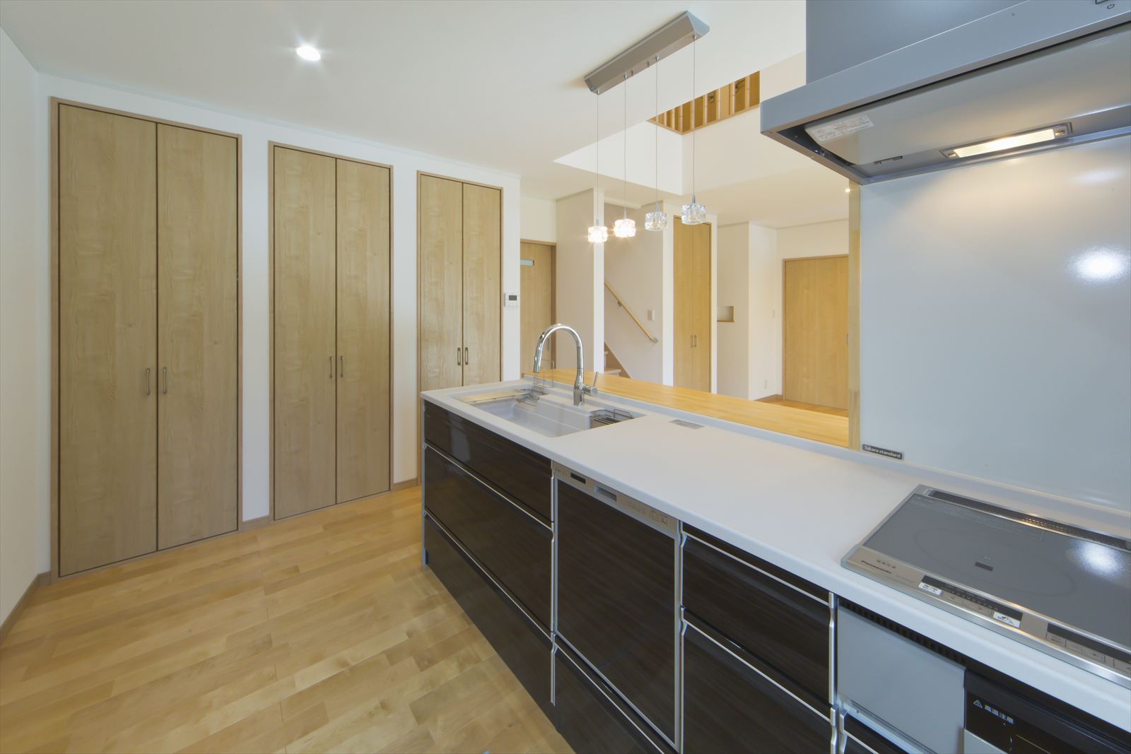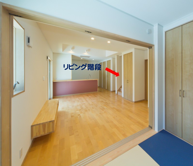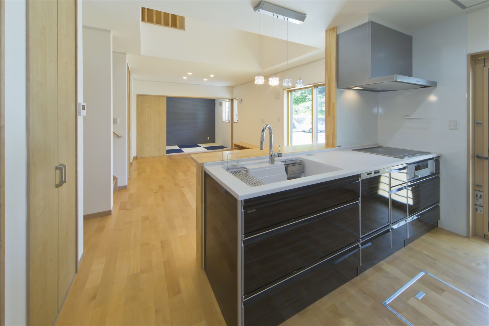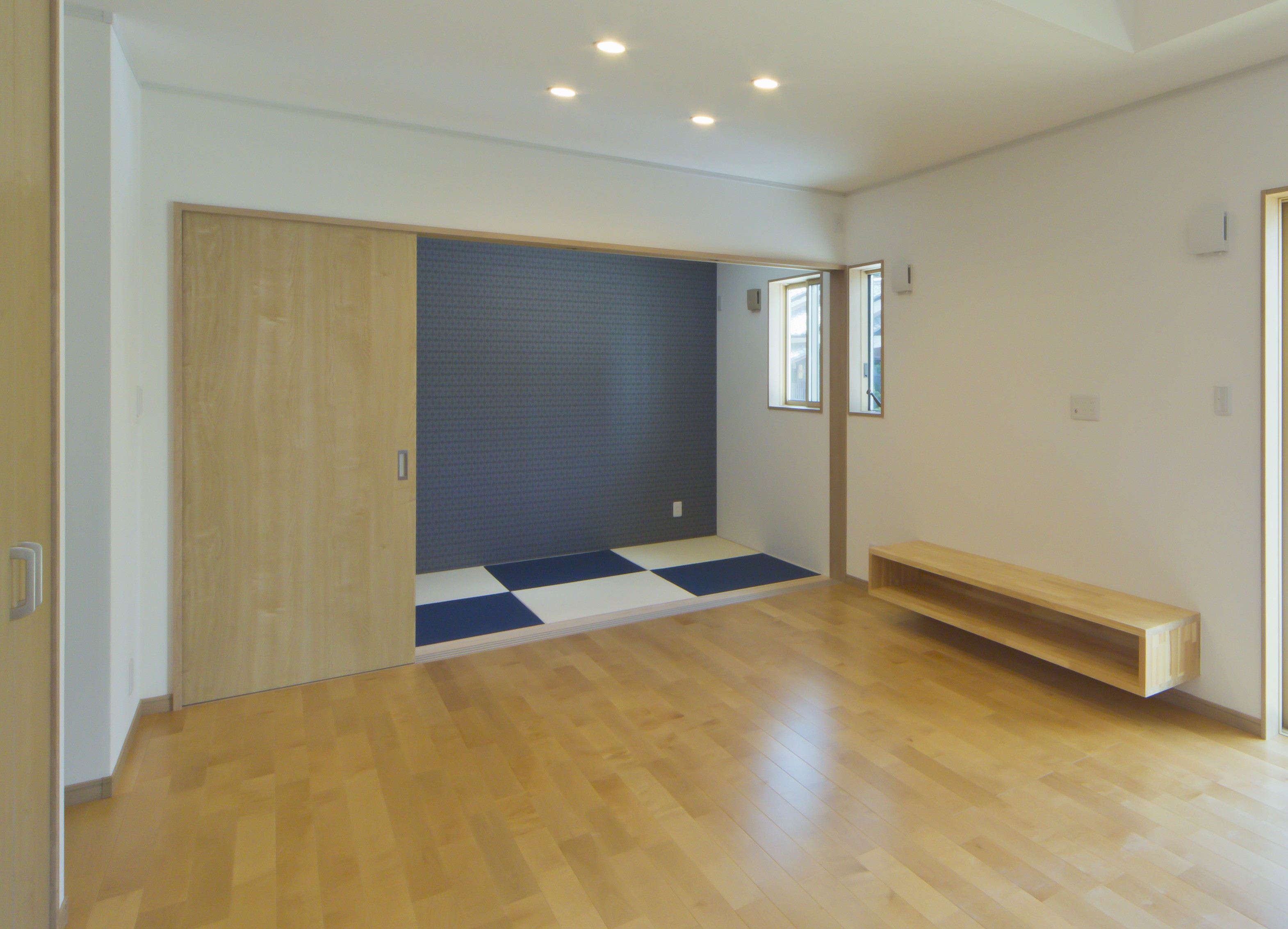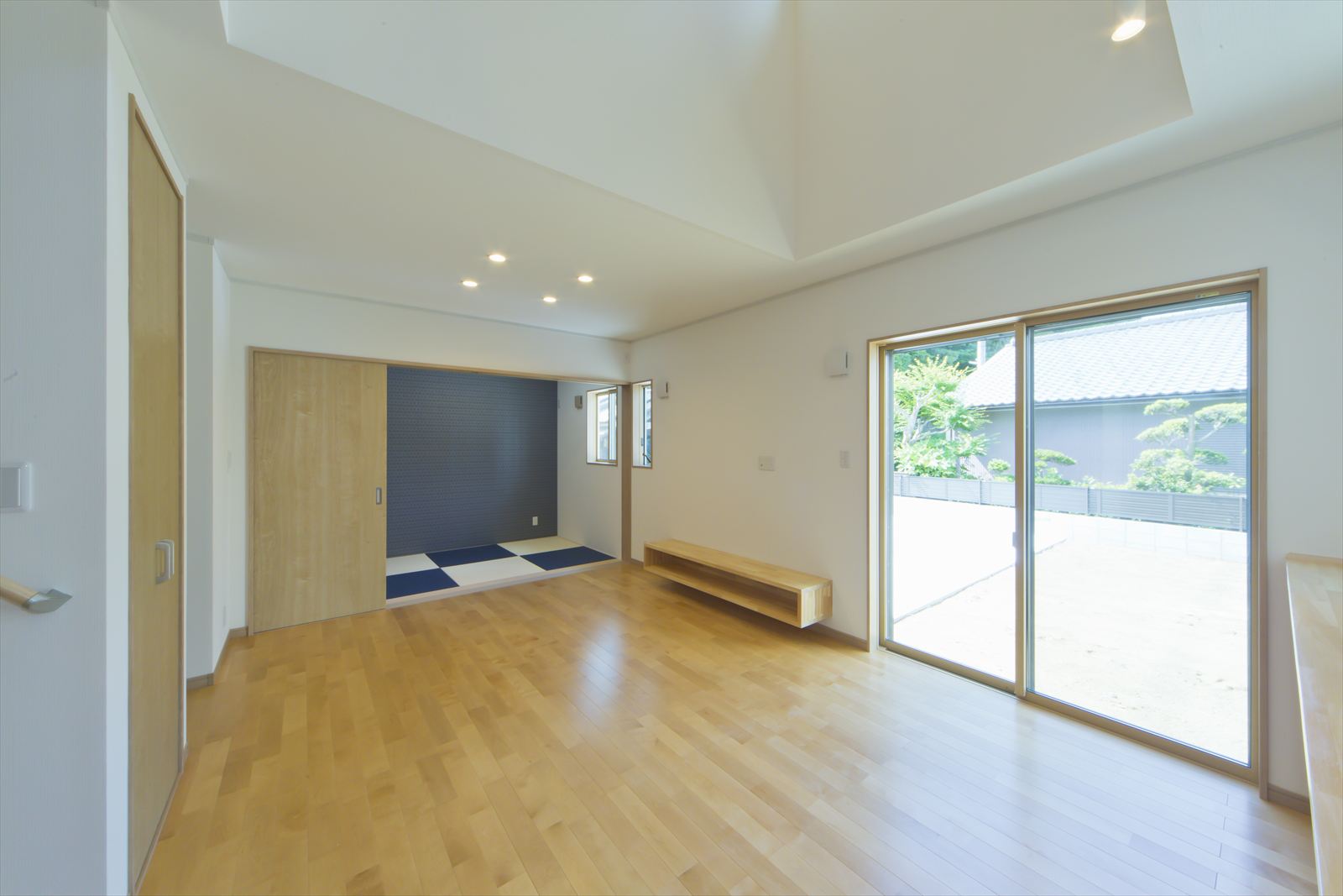 リビングへの扉を開くと吹き抜けの天井から柔らかな自然光が降り注ぐH様邸。ちょうどダイニングの真上に吹き抜けの天井があるので、キッチンに立っていても2階ホールの様子が分かり、会話を交わすことだって可能です。また、リビングを挟んで、キッチンの正面に位置するモダンな畳スペースは、3枚の引込戸の開閉によりリビングの一部として、また個室として幅広く活用することができます。