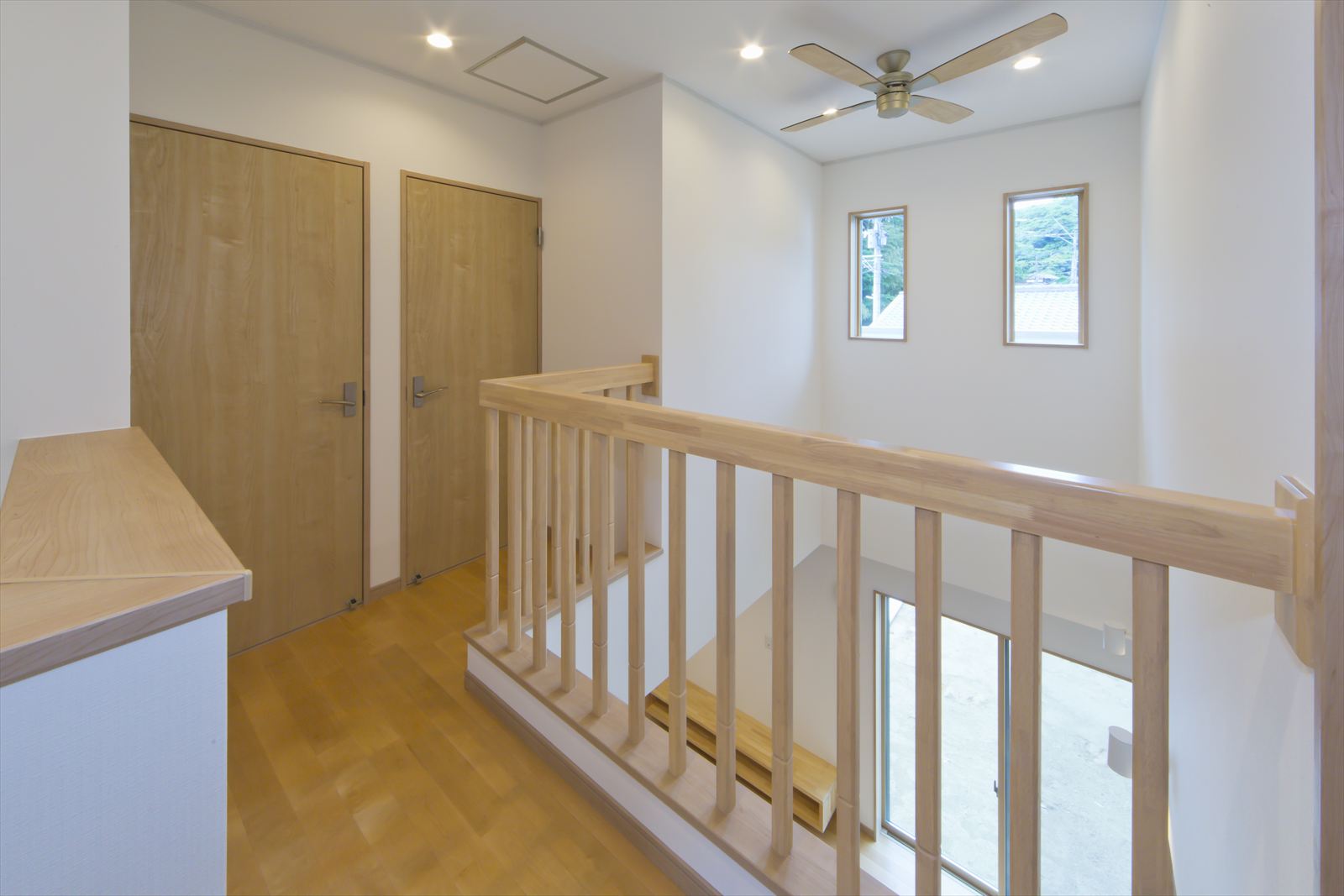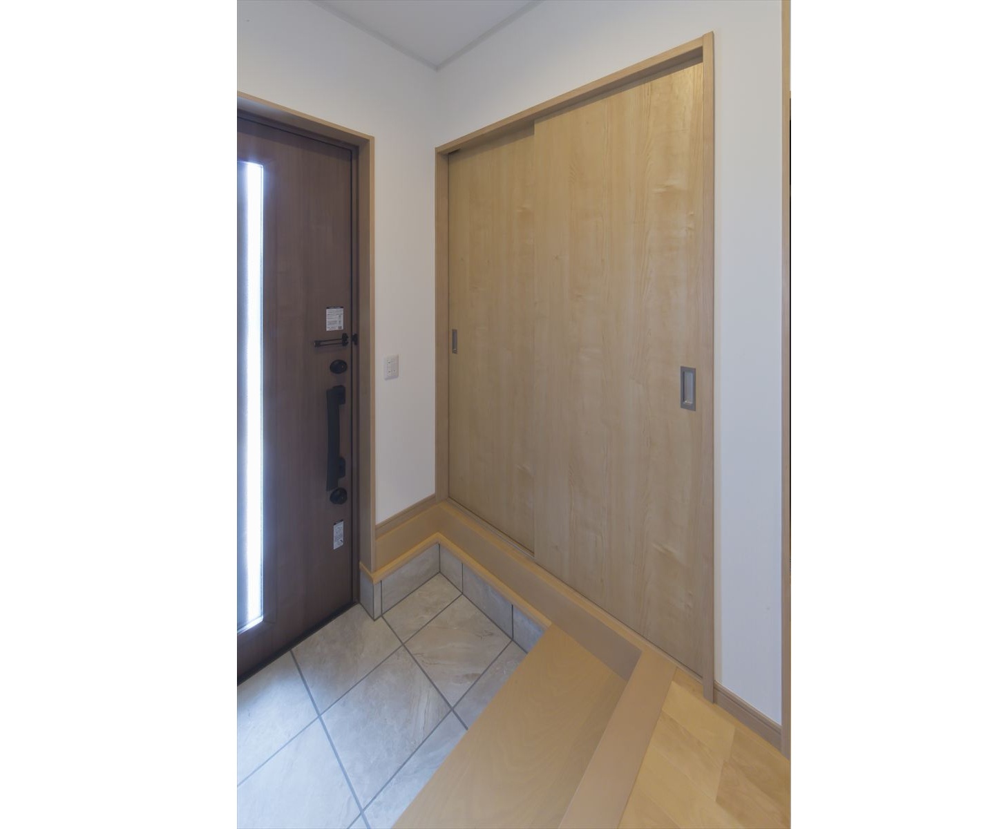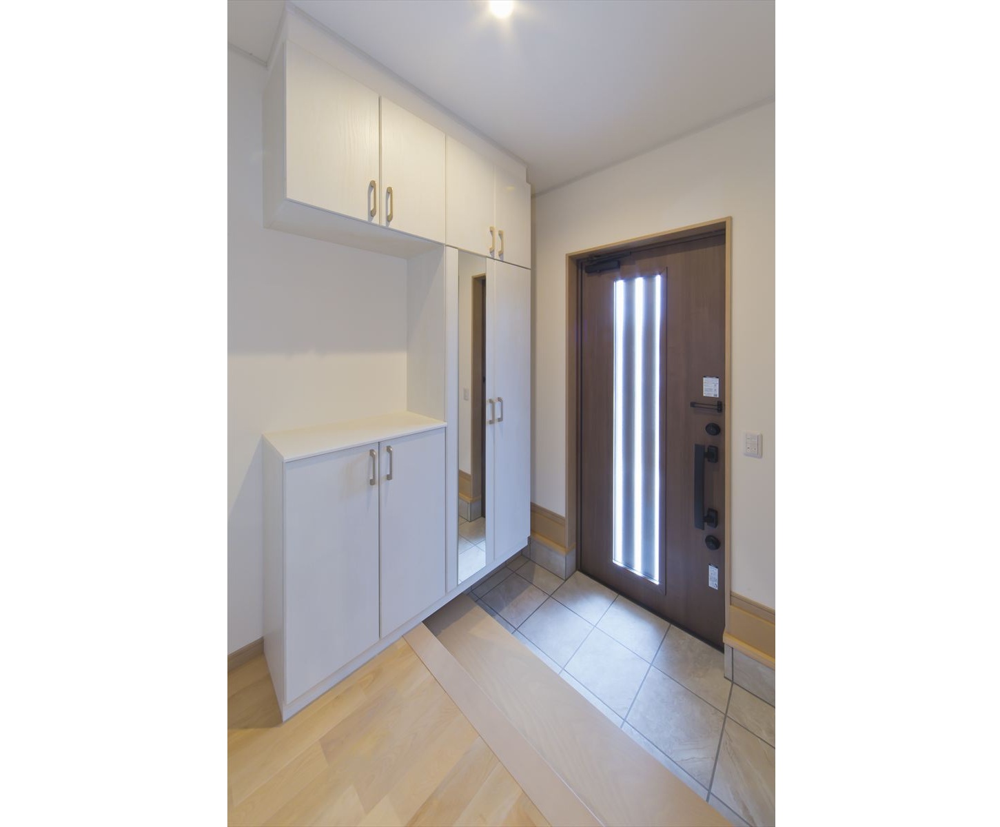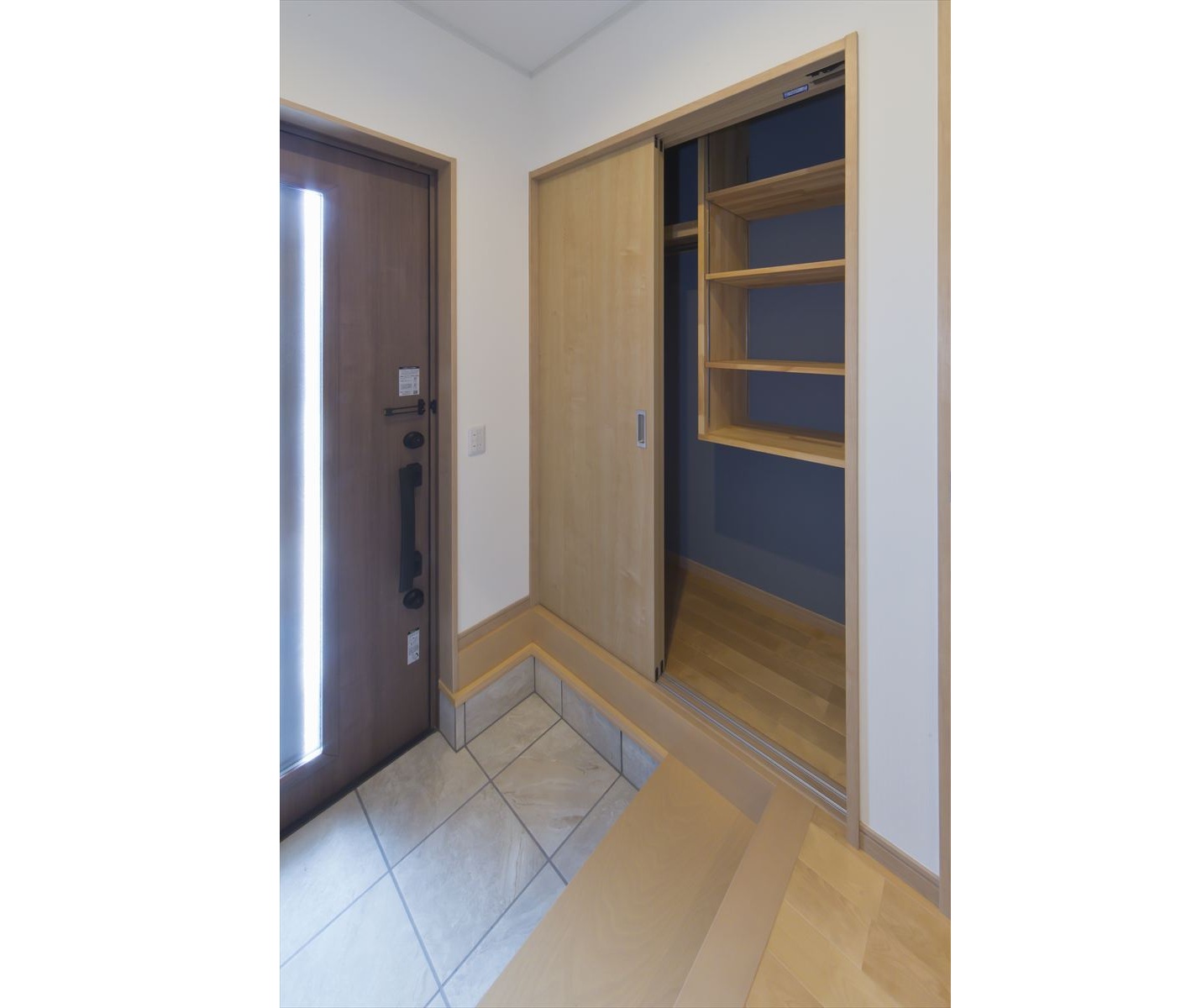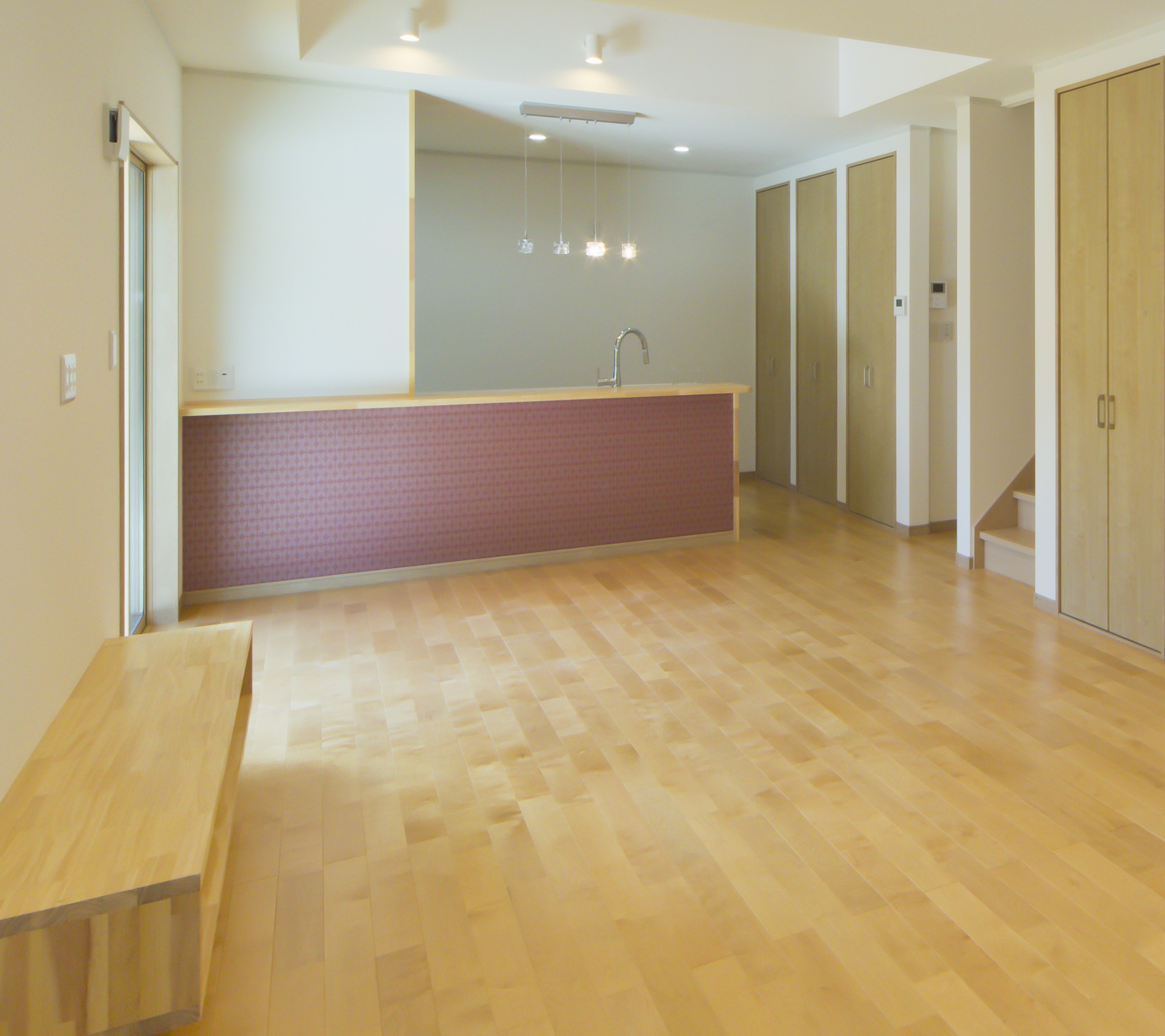 リビングへの扉を開くと吹き抜けの天井から柔らかな自然光が降り注ぐH様邸。ちょうどダイニングの真上に吹き抜けの天井があるので、キッチンに立っていても2階ホールの様子が分かり、会話を交わすことだって可能です。また、リビングを挟んで、キッチンの正面に位置するモダンな畳スペースは、3枚の引込戸の開閉によりリビングの一部として、また個室として幅広く活用することができます。