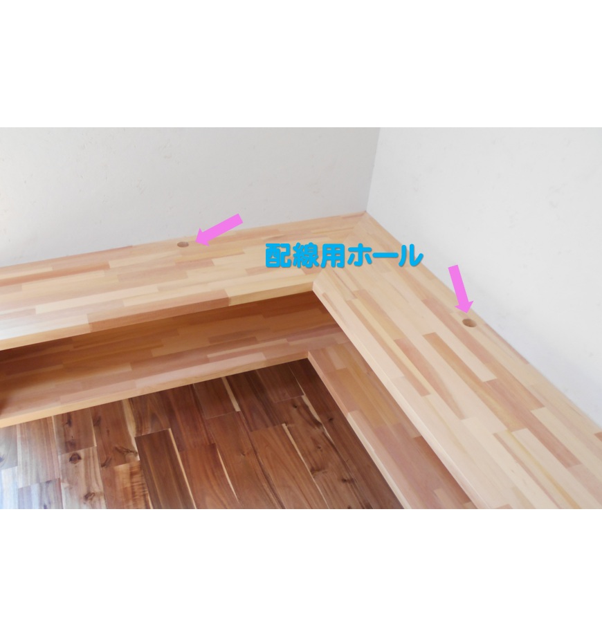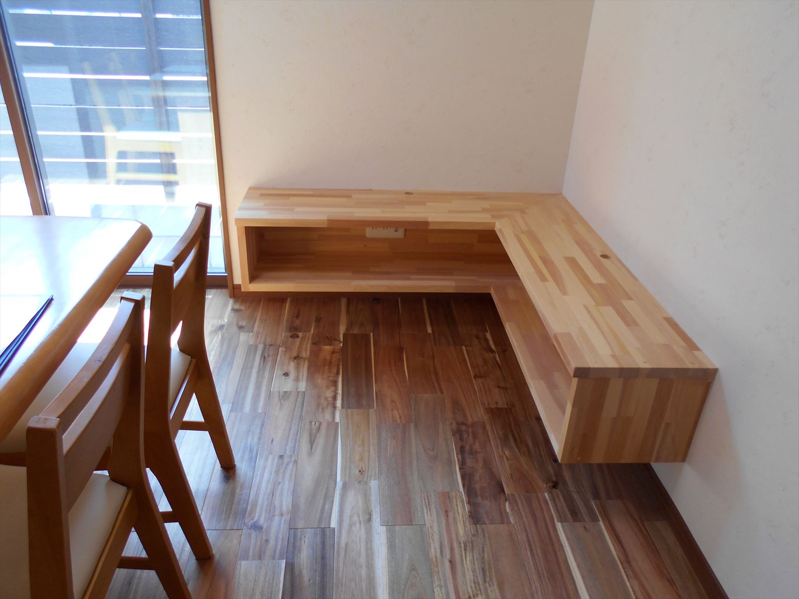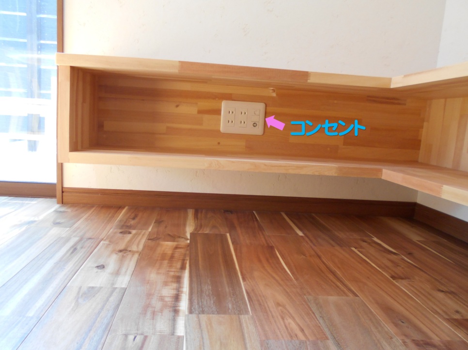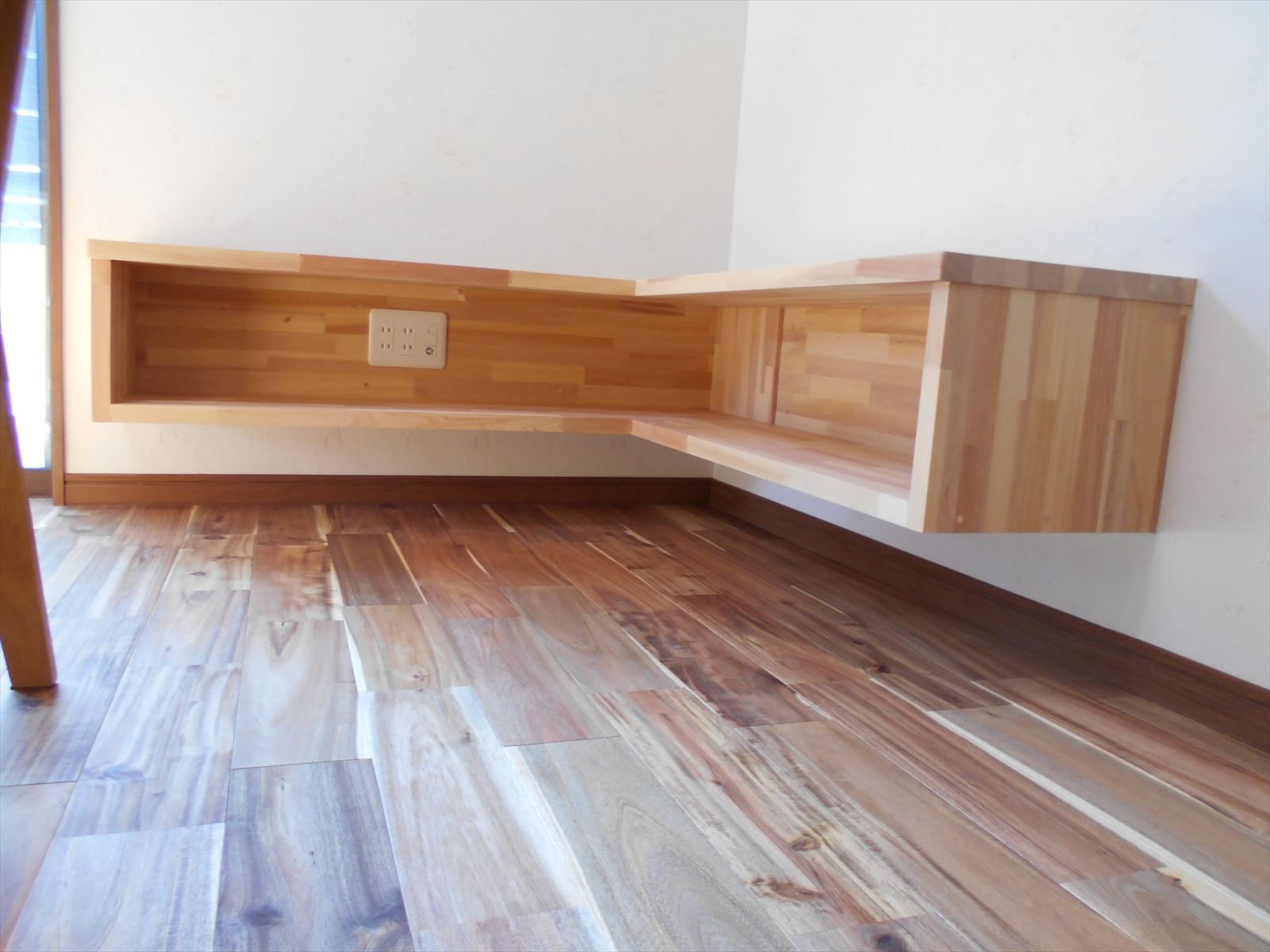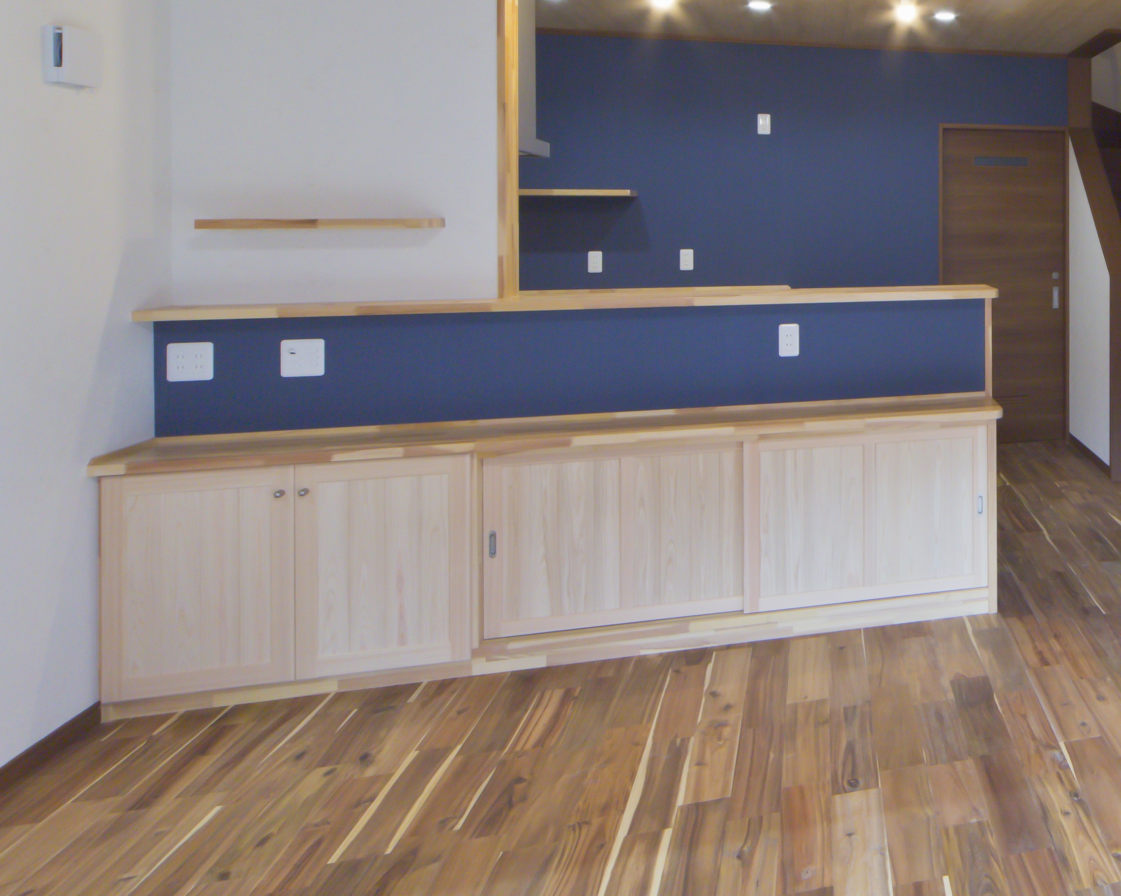 表情が豊で奥深い「アカシア」の無垢フローリングが、印象的なN様邸。玄関ホールからLDKへつながる扉を開くとリビング階段があり、その奥にキッチン・リビングダイニングが広がる設計となっています。システムキッチンの手元には、スペースをフルに利用したコンセント付きのニッチ棚があるので、調味料を置いたり充電をしたりと多様な活用が可能です。そのシステムキッチンの背面には手作り収納棚が、前面にはカウンター付きの手作り収納棚があり、生活習慣や家族構成などに合わせたオリジナルの造作家具が出来上がりました。リビングには、コンセントや配線コード用の穴が開けられたテレビ台造作家具も備え付けました。
