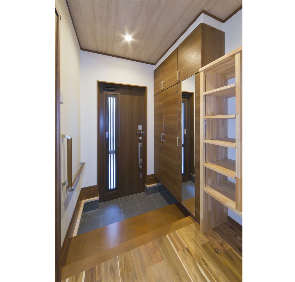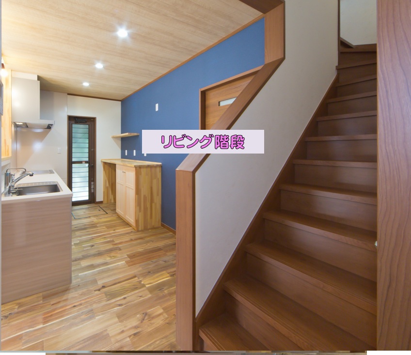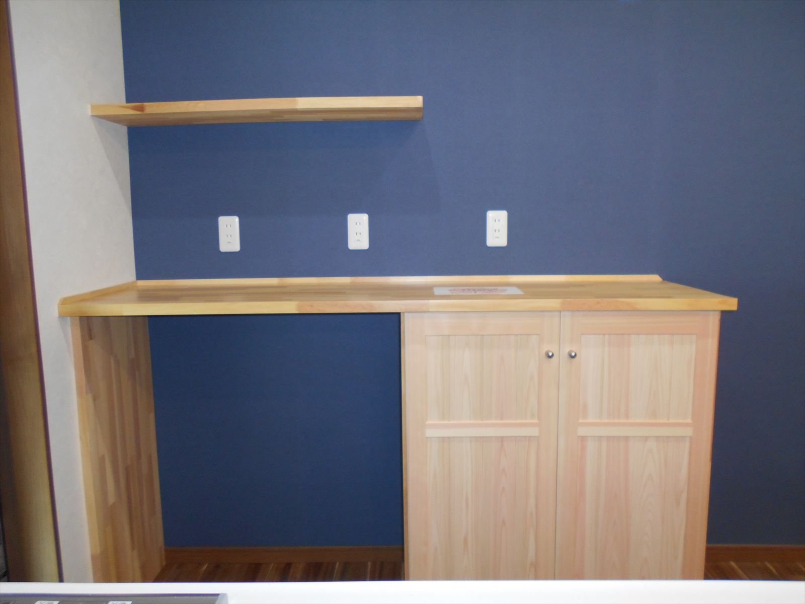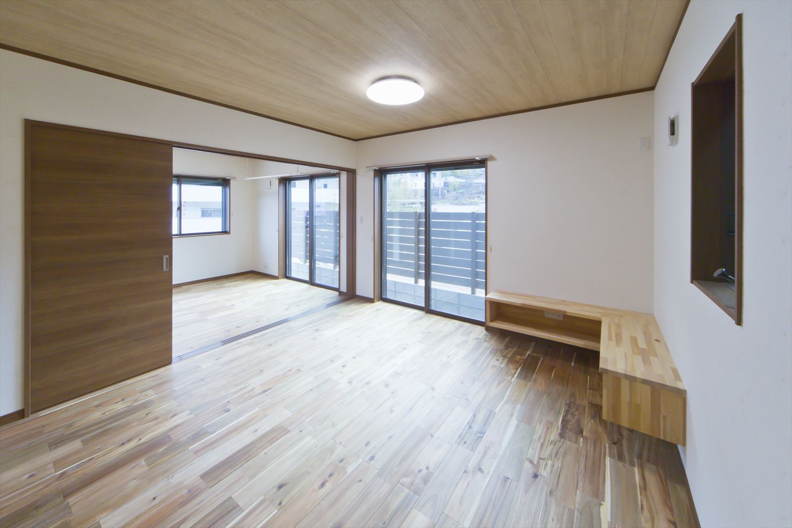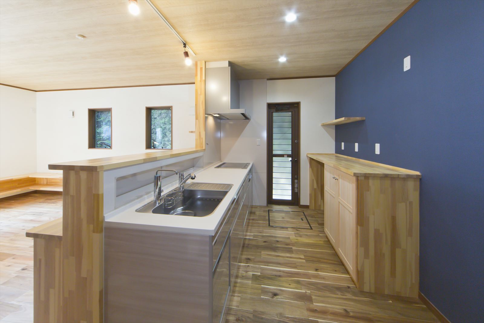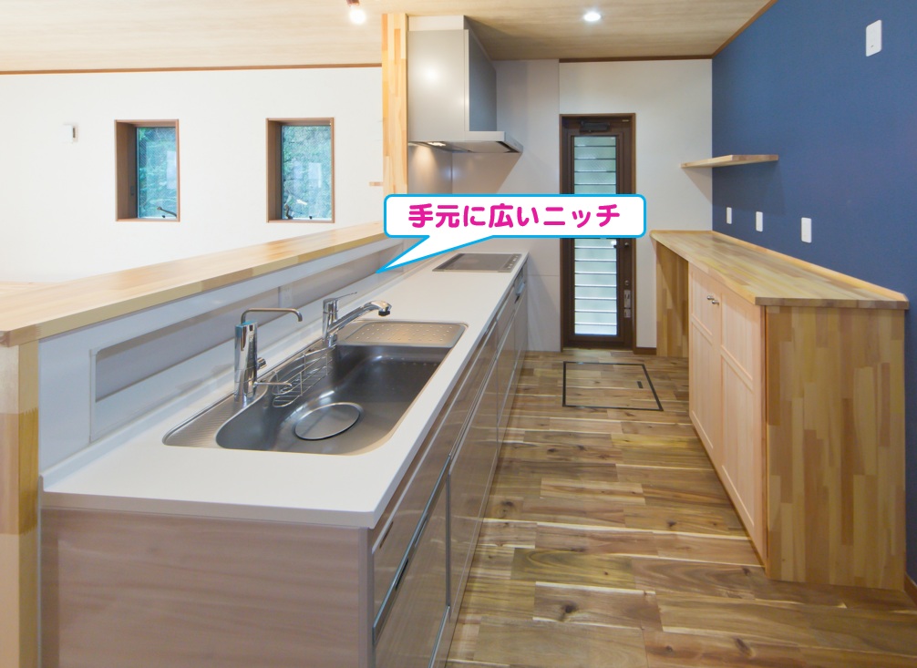 表情が豊で奥深い「アカシア」の無垢フローリングが、印象的なN様邸。玄関ホールからLDKへつながる扉を開くとリビング階段があり、その奥にキッチン・リビングダイニングが広がる設計となっています。システムキッチンの手元には、スペースをフルに利用したコンセント付きのニッチ棚があるので、調味料を置いたり充電をしたりと多様な活用が可能です。そのシステムキッチンの背面には手作り収納棚が、前面にはカウンター付きの手作り収納棚があり、生活習慣や家族構成などに合わせたオリジナルの造作家具が出来上がりました。リビングには、コンセントや配線コード用の穴が開けられたテレビ台造作家具も備え付けました。