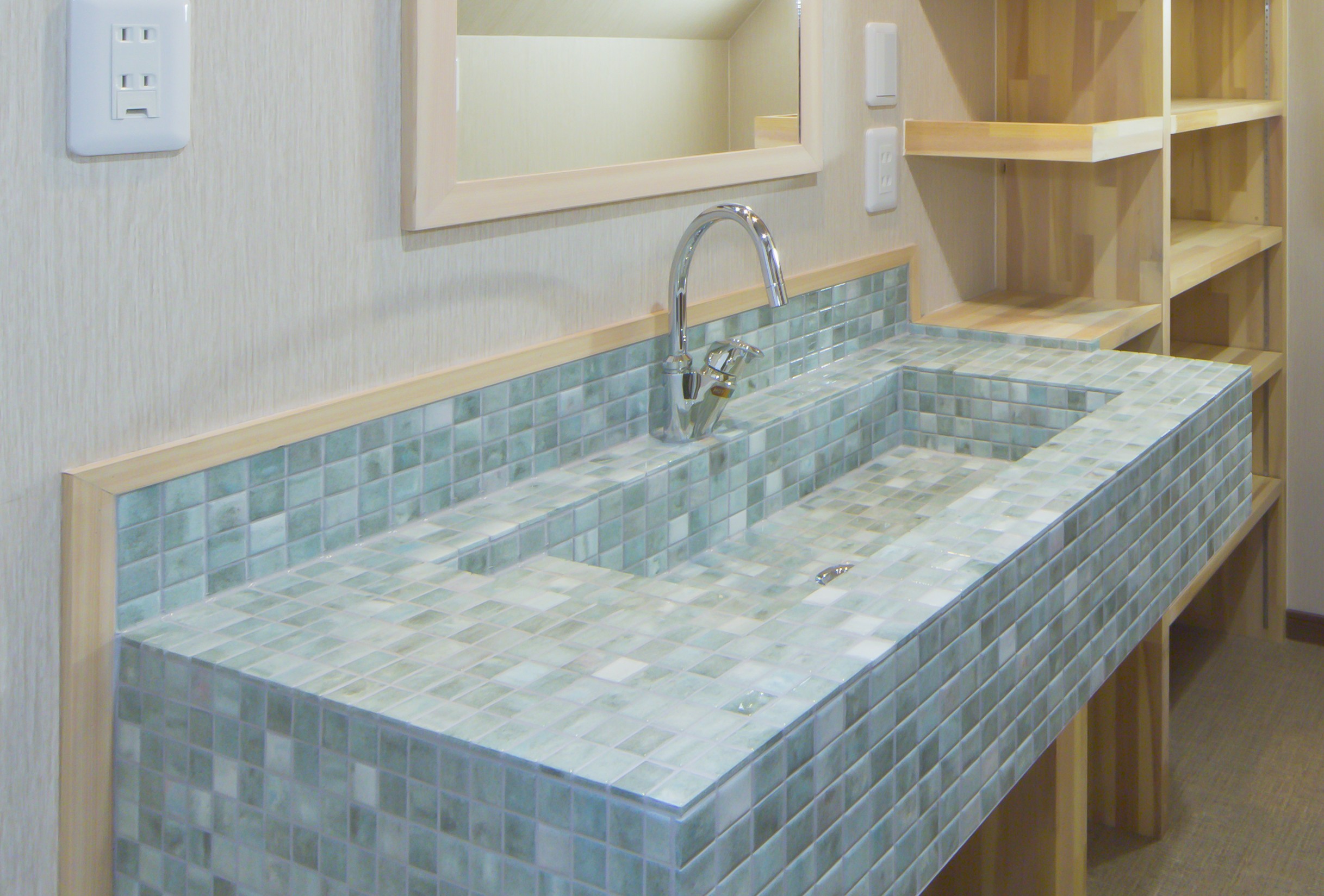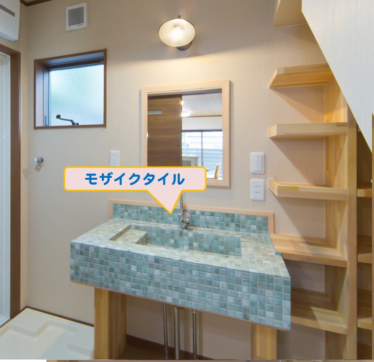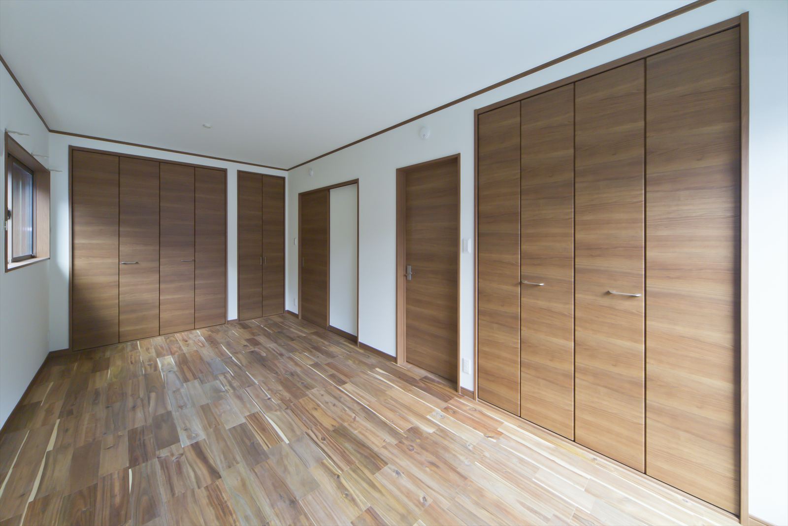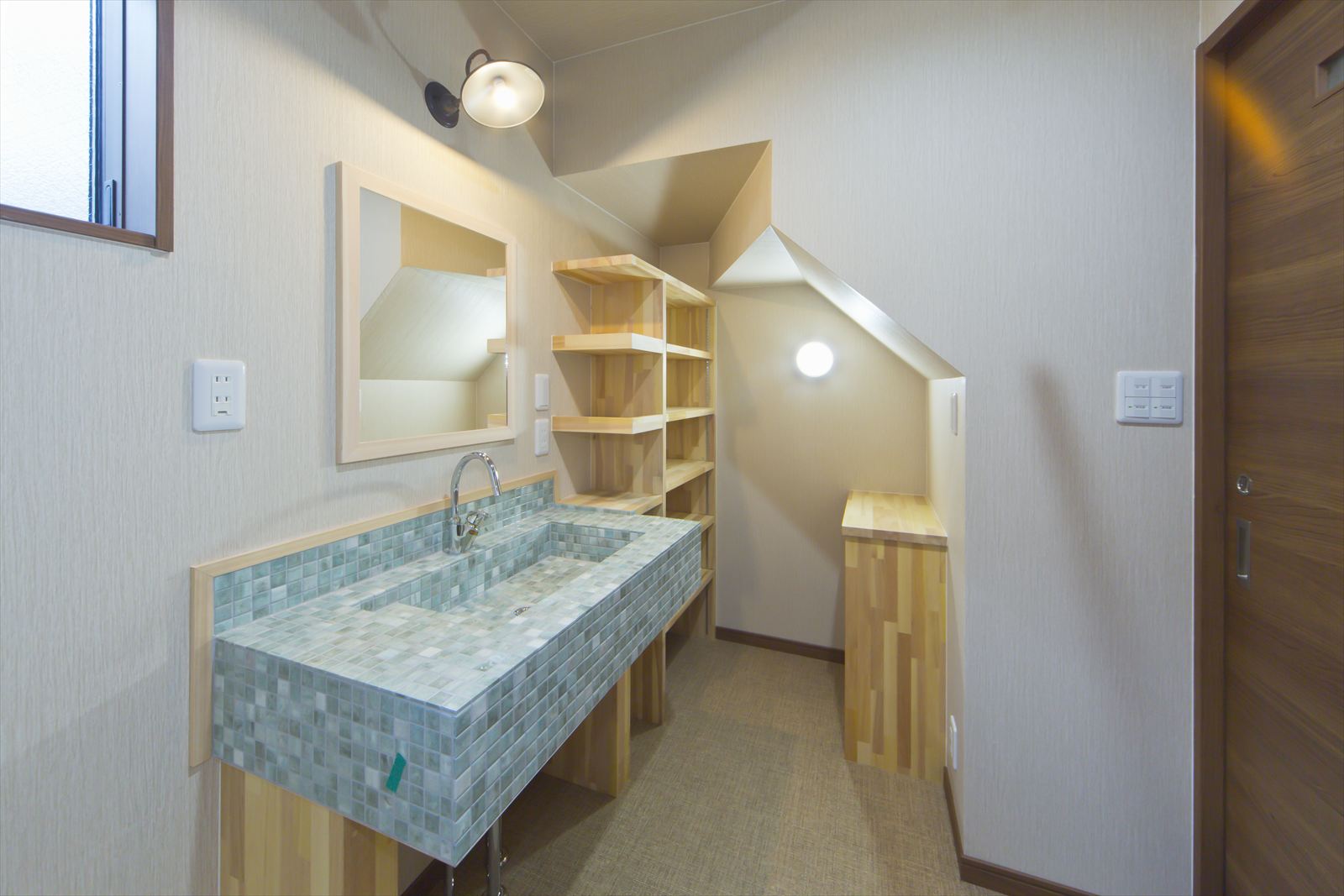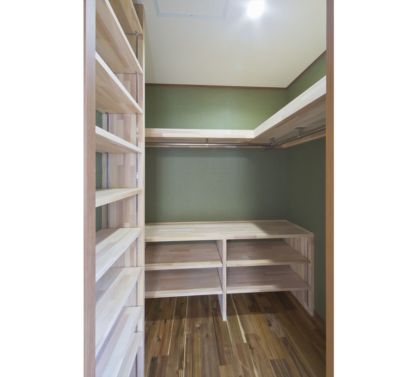 表情が豊で奥深い「アカシア」の無垢フローリングが、印象的なN様邸。玄関ホールからLDKへつながる扉を開くとリビング階段があり、その奥にキッチン・リビングダイニングが広がる設計となっています。システムキッチンの手元には、スペースをフルに利用したコンセント付きのニッチ棚があるので、調味料を置いたり充電をしたりと多様な活用が可能です。そのシステムキッチンの背面には手作り収納棚が、前面にはカウンター付きの手作り収納棚があり、生活習慣や家族構成などに合わせたオリジナルの造作家具が出来上がりました。リビングには、コンセントや配線コード用の穴が開けられたテレビ台造作家具も備え付けました。