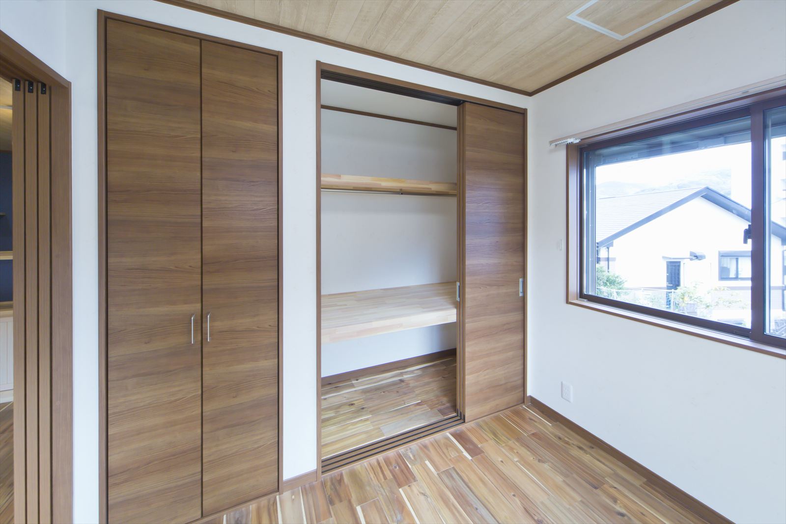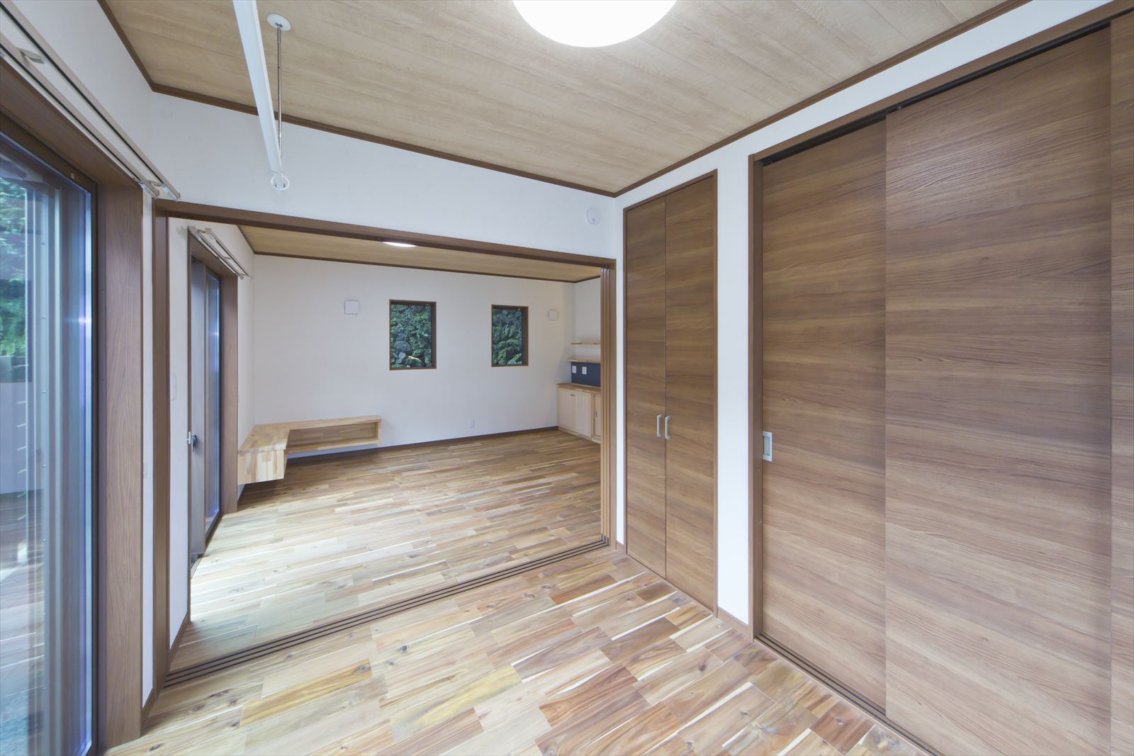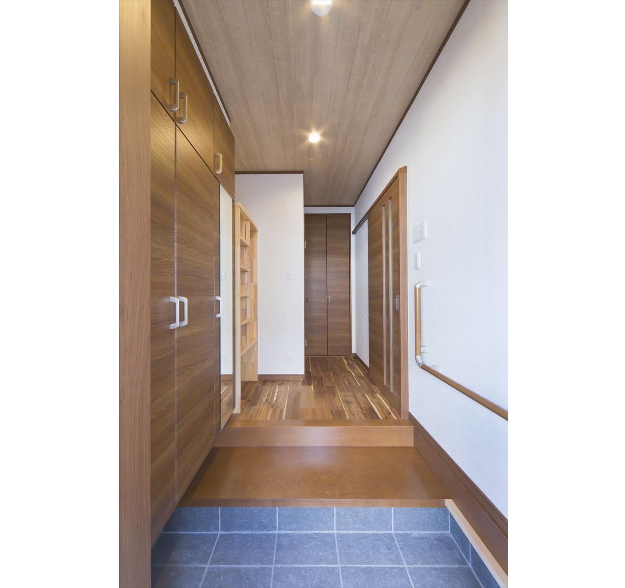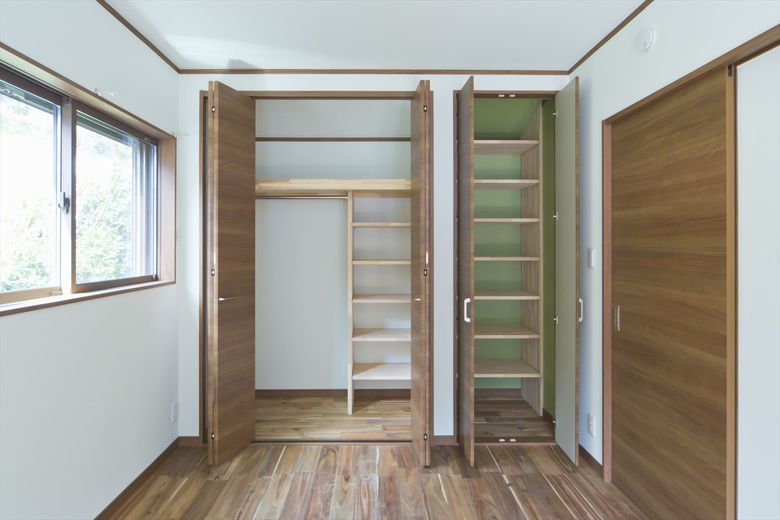 表情が豊で奥深い「アカシア」の無垢フローリングが、印象的なN様邸。玄関ホールからLDKへつながる扉を開くとリビング階段があり、その奥にキッチン・リビングダイニングが広がる設計となっています。システムキッチンの手元には、スペースをフルに利用したコンセント付きのニッチ棚があるので、調味料を置いたり充電をしたりと多様な活用が可能です。そのシステムキッチンの背面には手作り収納棚が、前面にはカウンター付きの手作り収納棚があり、生活習慣や家族構成などに合わせたオリジナルの造作家具が出来上がりました。リビングには、コンセントや配線コード用の穴が開けられたテレビ台造作家具も備え付けました。