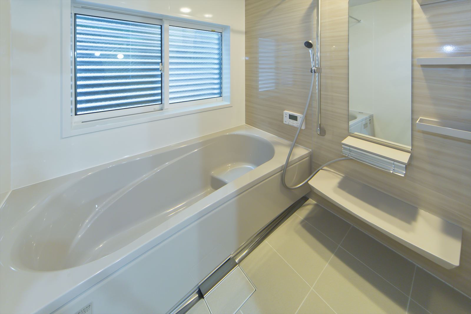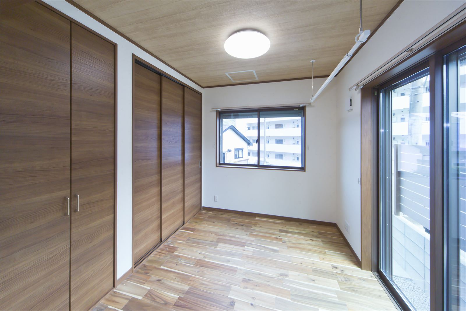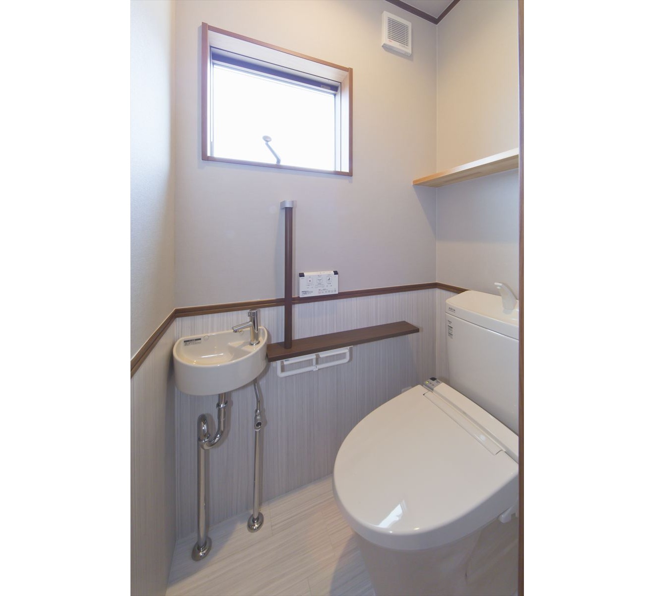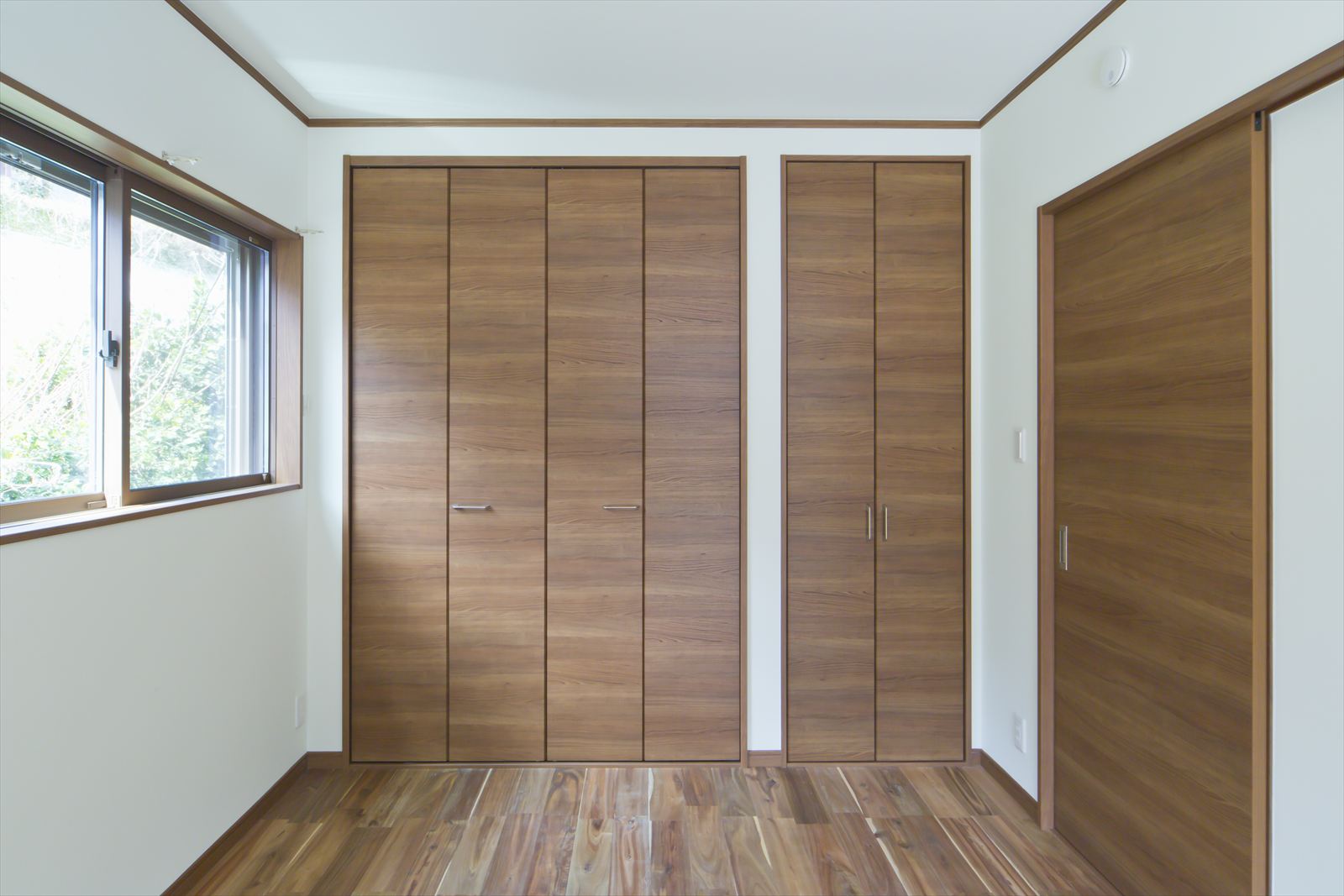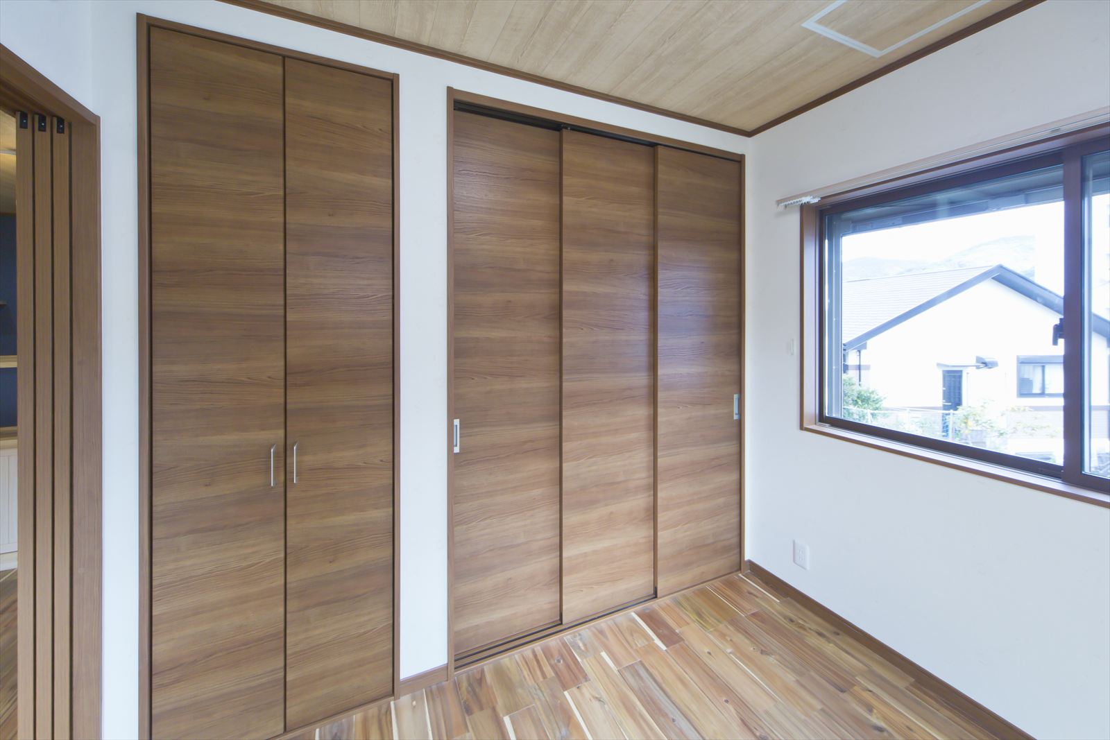 表情が豊で奥深い「アカシア」の無垢フローリングが、印象的なN様邸。玄関ホールからLDKへつながる扉を開くとリビング階段があり、その奥にキッチン・リビングダイニングが広がる設計となっています。システムキッチンの手元には、スペースをフルに利用したコンセント付きのニッチ棚があるので、調味料を置いたり充電をしたりと多様な活用が可能です。そのシステムキッチンの背面には手作り収納棚が、前面にはカウンター付きの手作り収納棚があり、生活習慣や家族構成などに合わせたオリジナルの造作家具が出来上がりました。リビングには、コンセントや配線コード用の穴が開けられたテレビ台造作家具も備え付けました。
