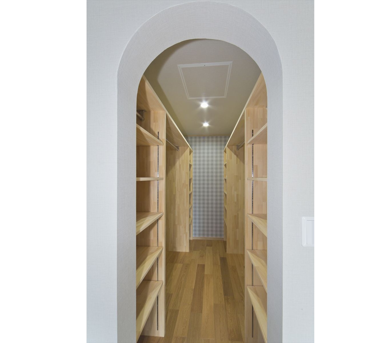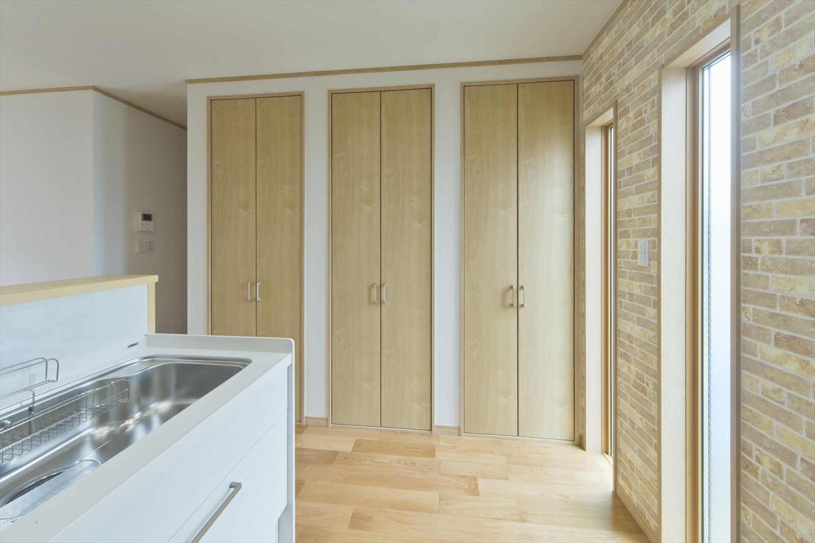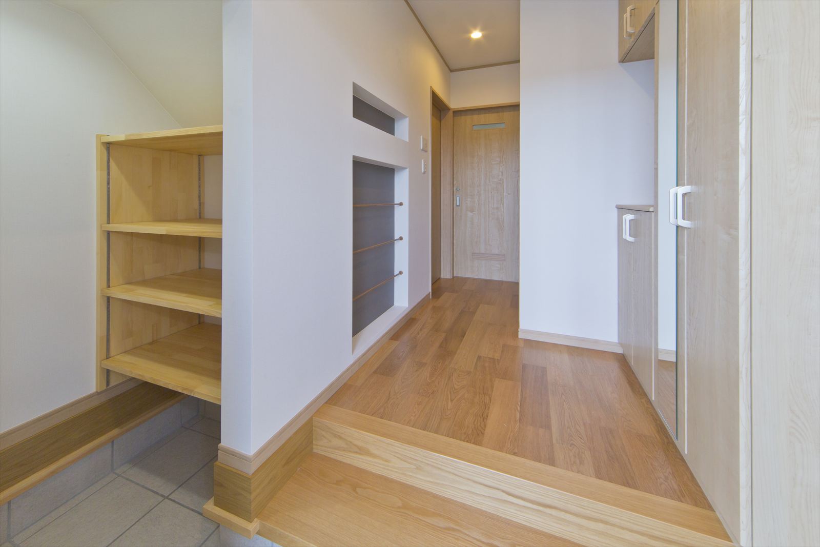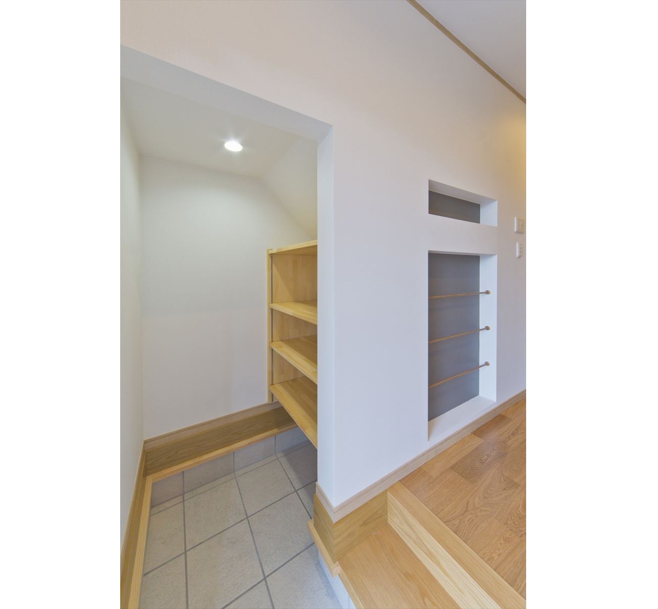 住宅が密集した地域で、敷地面積約34坪という条件の中、駐車場を十分に確保し建てられたY様邸ですが、建物内部も無駄なく効率よく設計されています。まず、玄関には階段下スペースを利用した建具のないオープンタイプの収納スペースがあり、玄関ホールには壁の厚みを利用したスリッパラックが作られています。また、キッチン横には、両開き戸の物入が3か所もありカテゴリーごとの収納が可能になりました。他にも各所に作ったニッチやアール開口のウォークインクローゼットなども快適な暮らしを応援してくれることでしょう。
