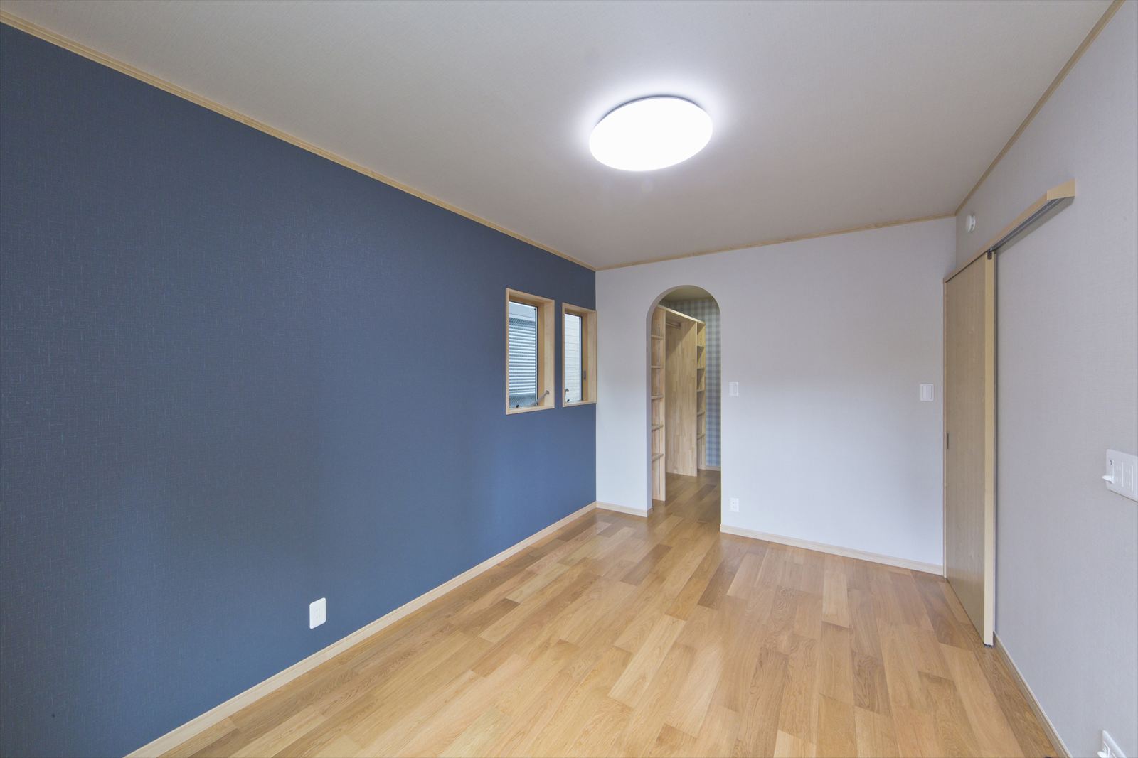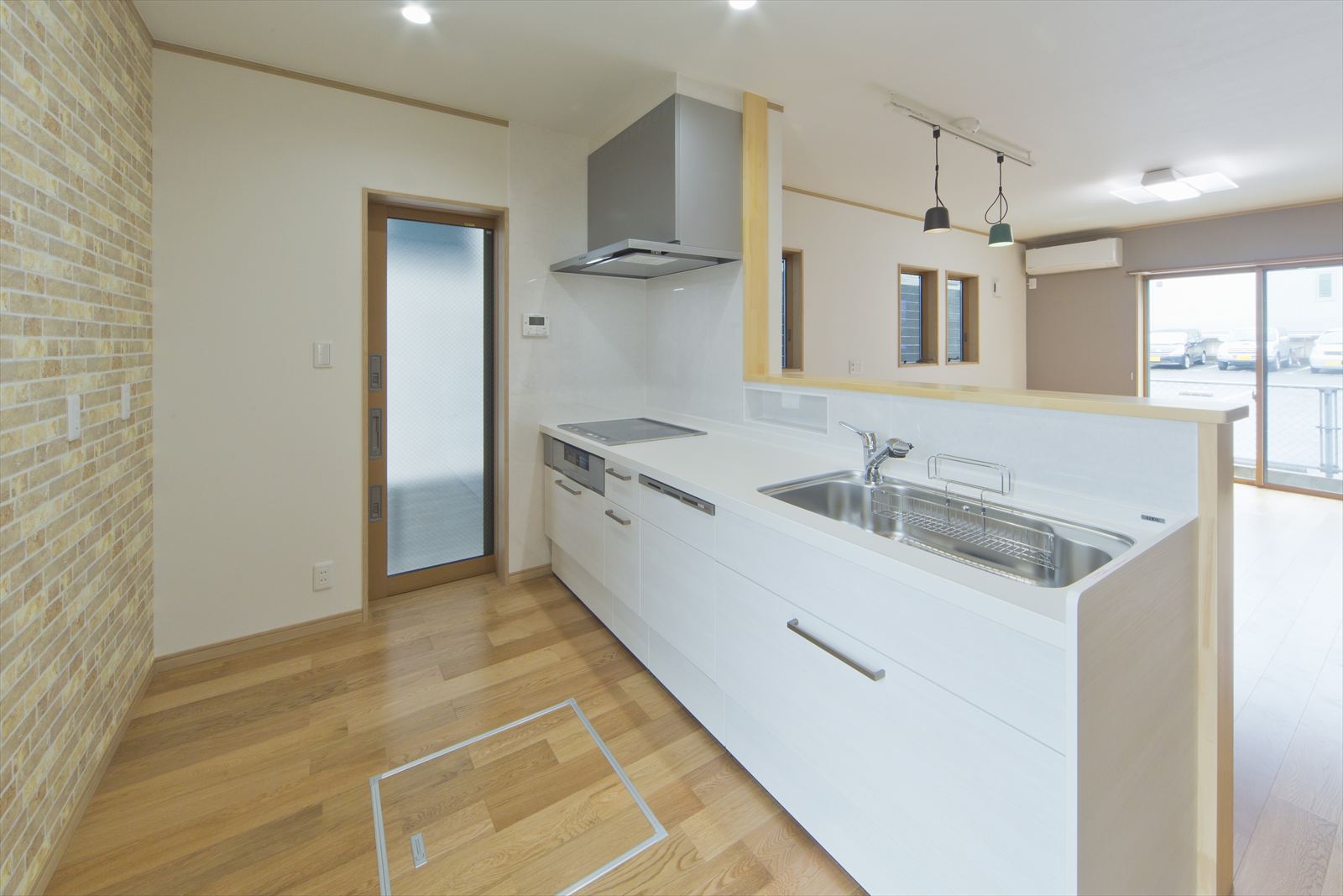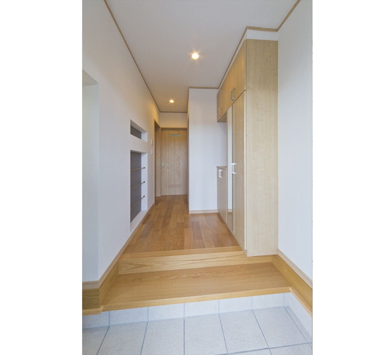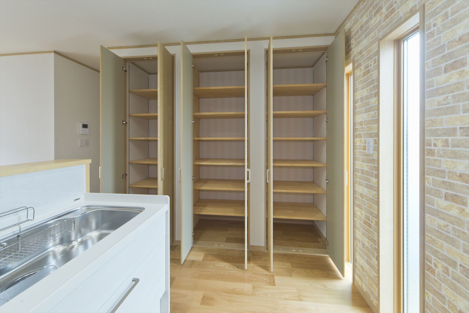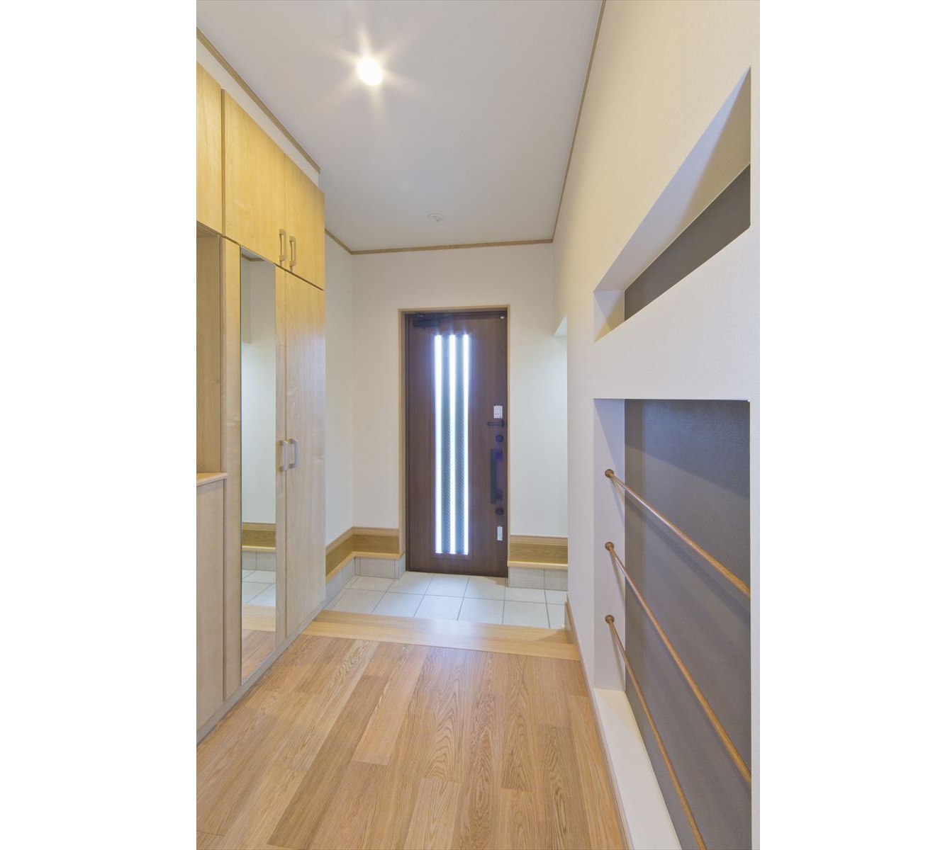 住宅が密集した地域で、敷地面積約34坪という条件の中、駐車場を十分に確保し建てられたY様邸ですが、建物内部も無駄なく効率よく設計されています。まず、玄関には階段下スペースを利用した建具のないオープンタイプの収納スペースがあり、玄関ホールには壁の厚みを利用したスリッパラックが作られています。また、キッチン横には、両開き戸の物入が3か所もありカテゴリーごとの収納が可能になりました。他にも各所に作ったニッチやアール開口のウォークインクローゼットなども快適な暮らしを応援してくれることでしょう。