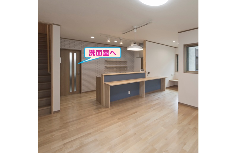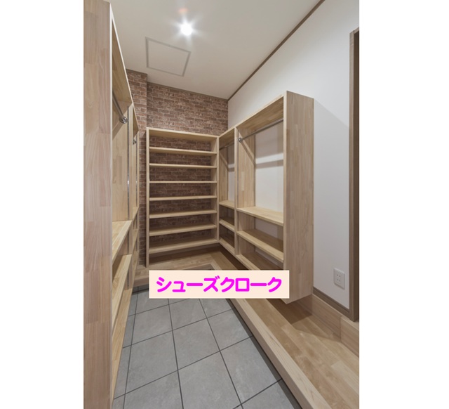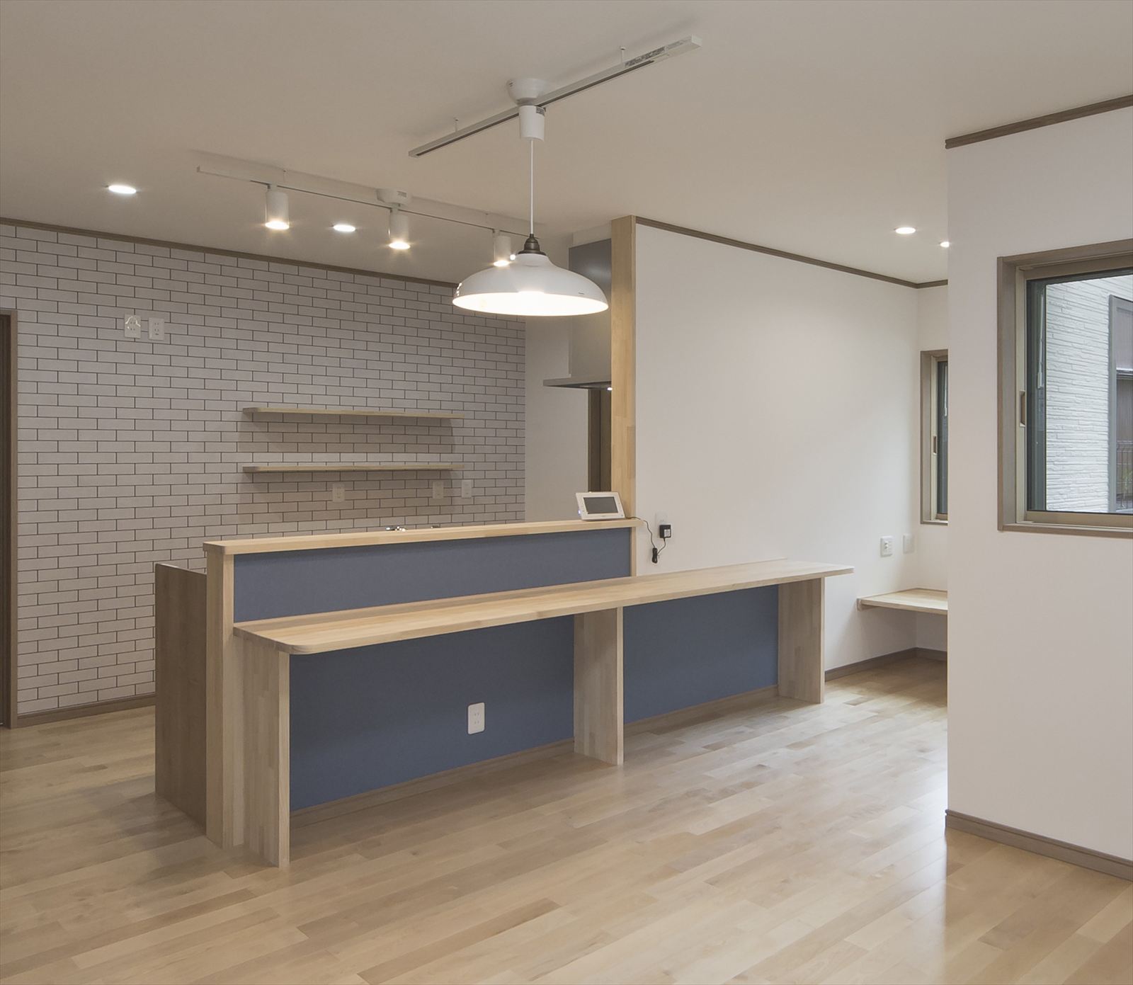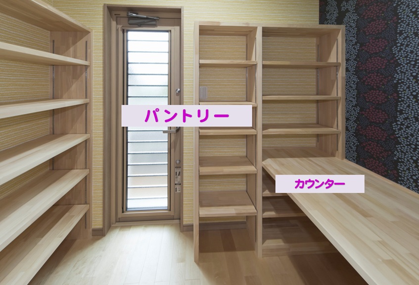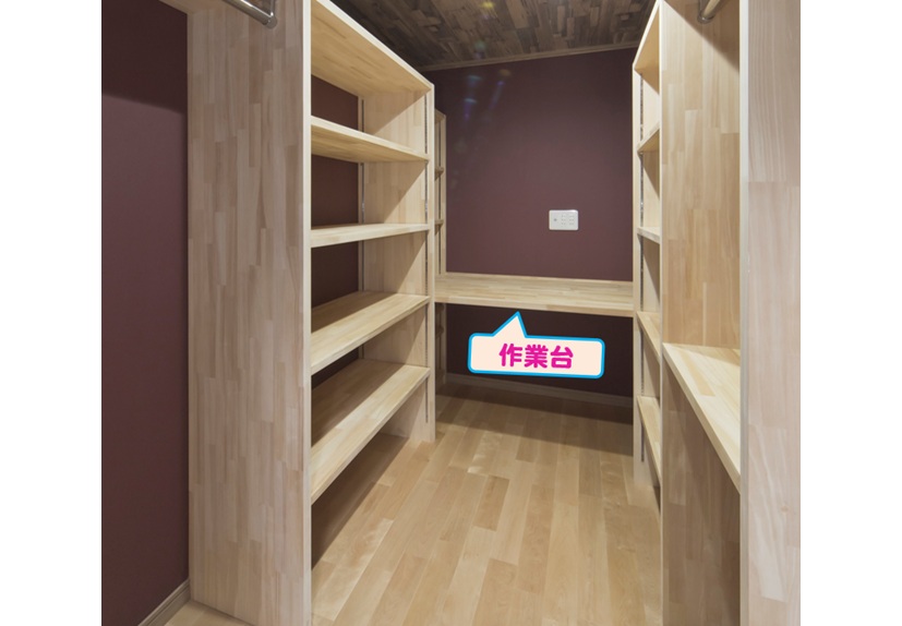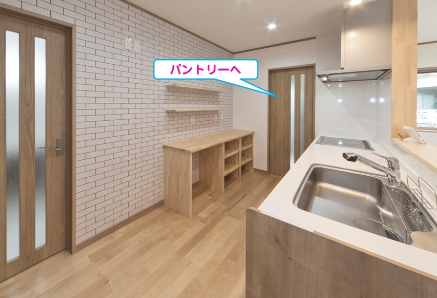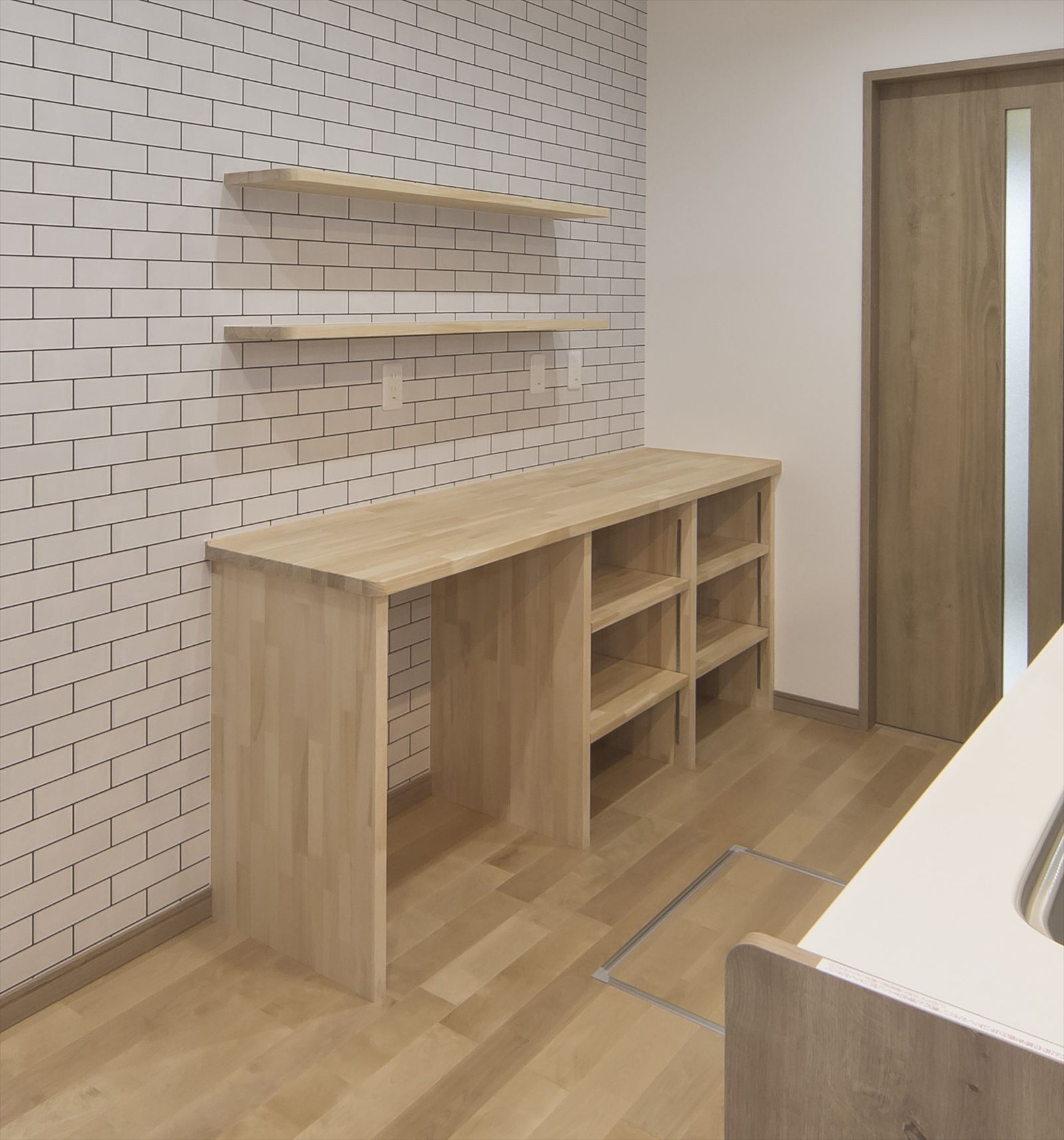 毎日の暮らしの中で繰り返される作業の効率を考えて、さまざまなアイディアで造作家具を備え付けたK様邸です。玄関横のシューズクロークには、収納棚とハンガーパープがコの字型の壁全面に造作されているので帰宅後には、靴だけでなくコートや遊具などをすぐに片付けることができます。また、キッチン奥のドアを開くとパントリーがあり、この中には収納棚と一緒に広いカウンターが備え付けられ作業台やワークスペースとしても利用可能となっています。他にもスタディーコーナーとしても活用できる広いキッチンカウンターや作業台があるウォークインクローゼットなど工夫がいっぱい。プライベートルームの扉に取り付けられたペットドアも家族の一員であるネコの事を考えた大切なポイントですね。