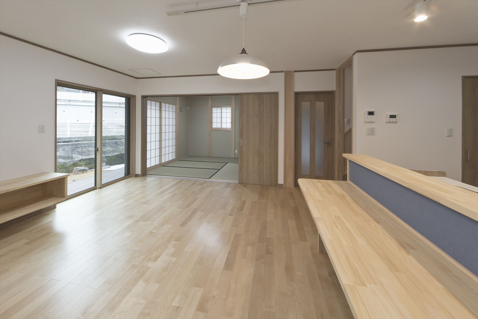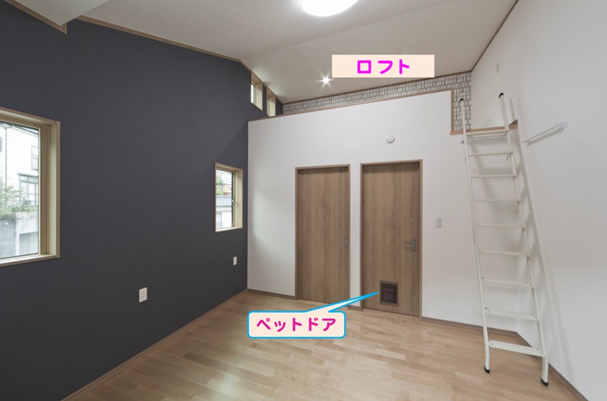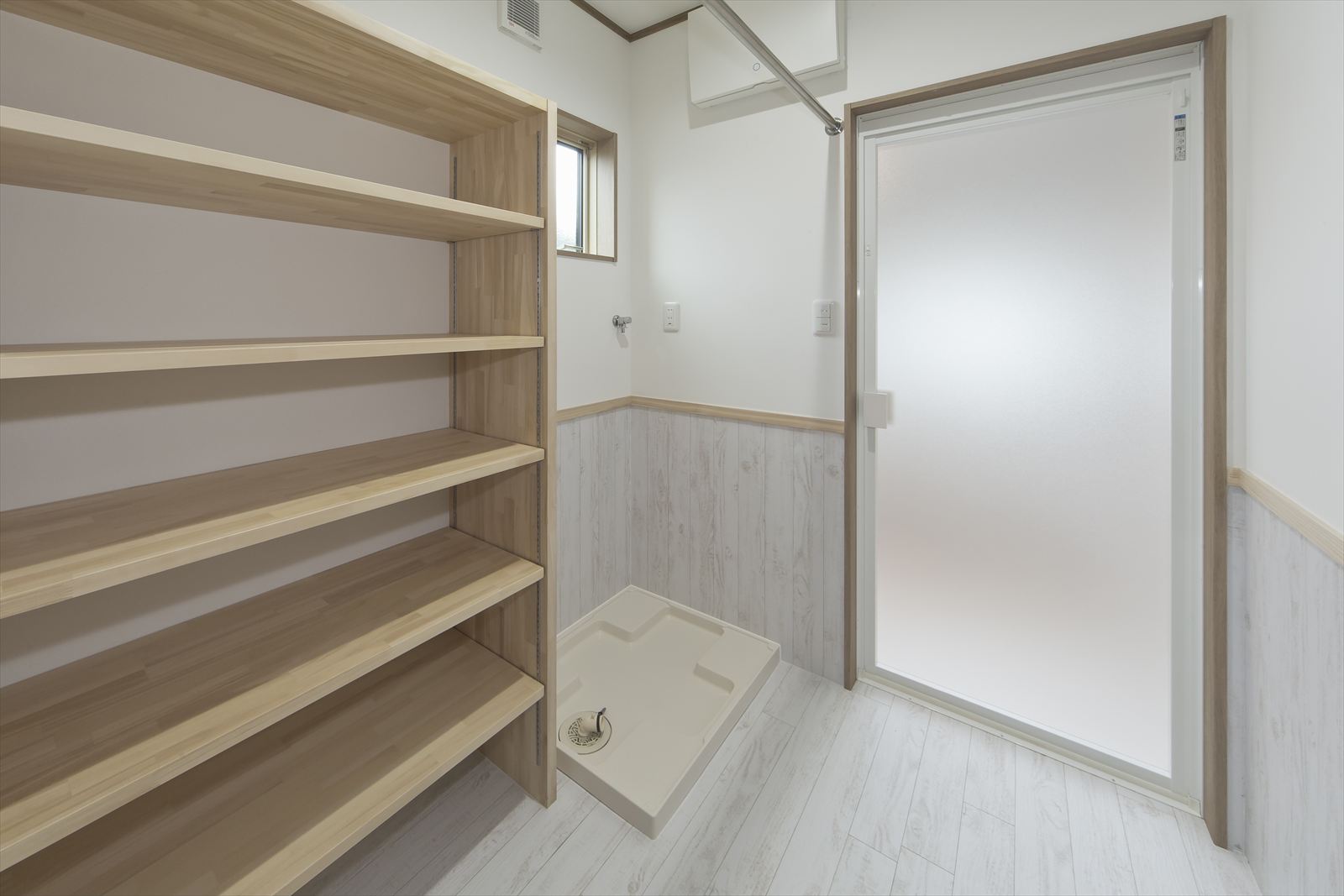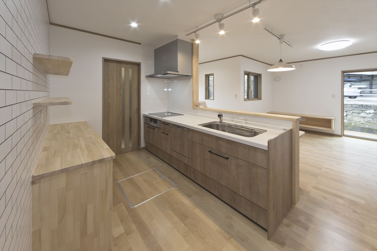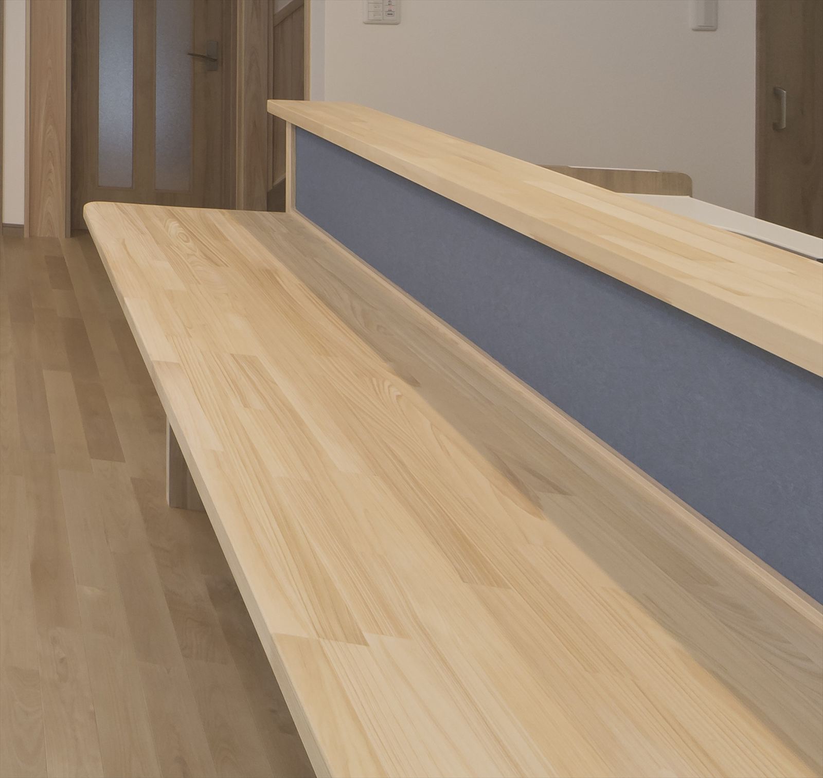 毎日の暮らしの中で繰り返される作業の効率を考えて、さまざまなアイディアで造作家具を備え付けたK様邸です。玄関横のシューズクロークには、収納棚とハンガーパープがコの字型の壁全面に造作されているので帰宅後には、靴だけでなくコートや遊具などをすぐに片付けることができます。また、キッチン奥のドアを開くとパントリーがあり、この中には収納棚と一緒に広いカウンターが備え付けられ作業台やワークスペースとしても利用可能となっています。他にもスタディーコーナーとしても活用できる広いキッチンカウンターや作業台があるウォークインクローゼットなど工夫がいっぱい。プライベートルームの扉に取り付けられたペットドアも家族の一員であるネコの事を考えた大切なポイントですね。
