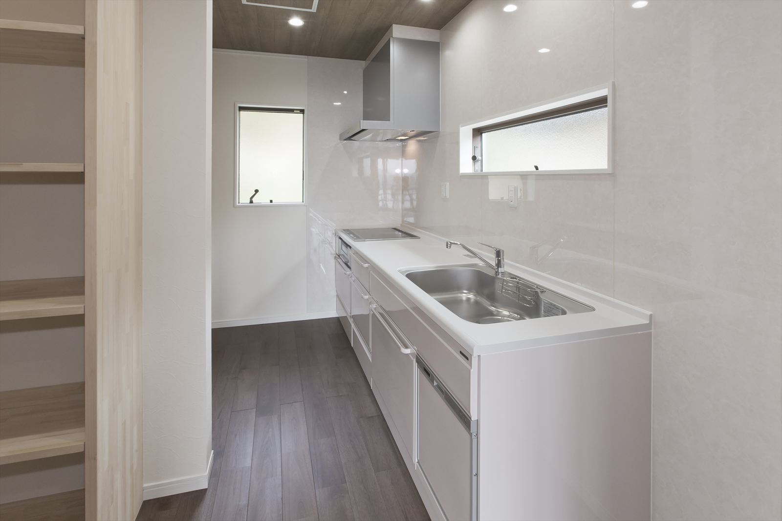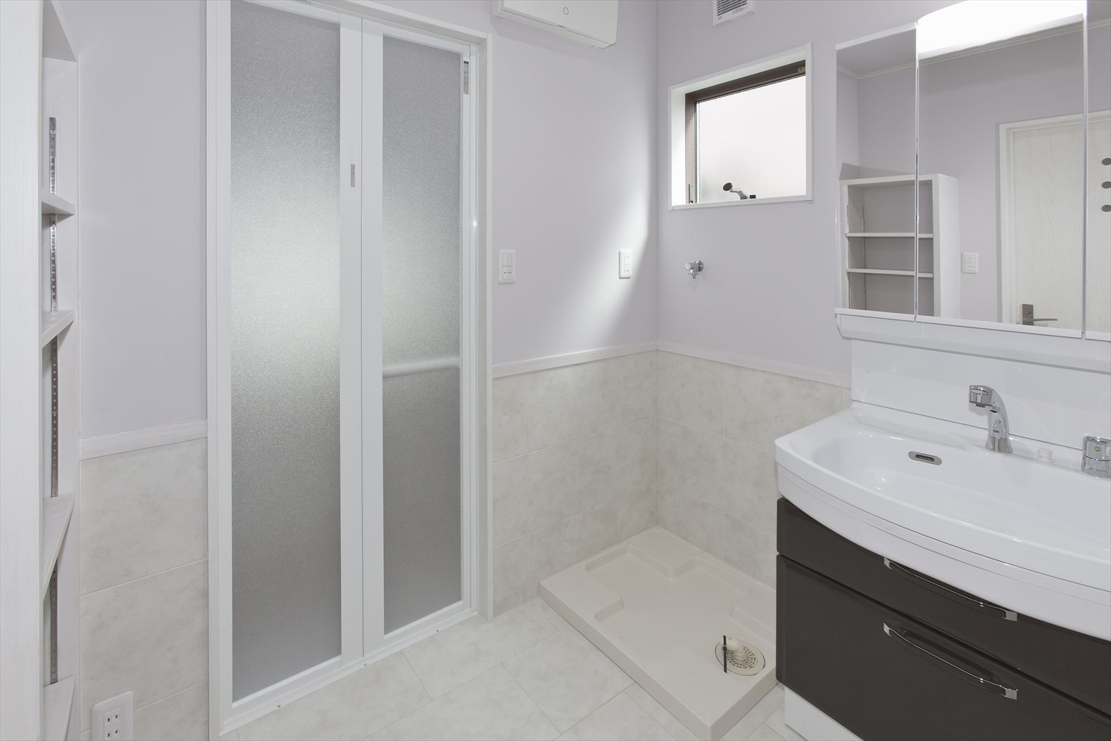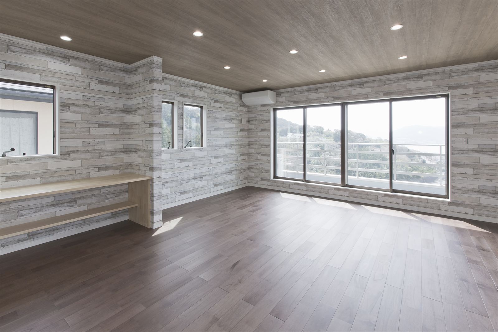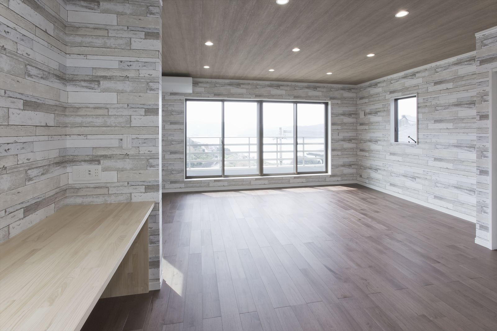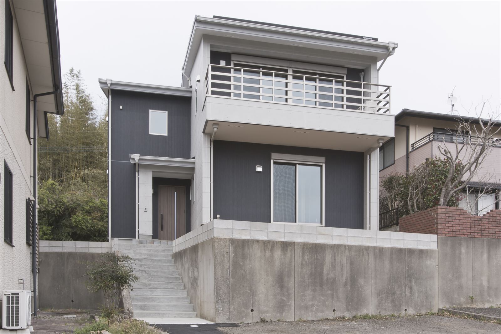見晴らしのいい高台に建つK様邸。建築当初からこの眺めを活かした家づくりを望まれて、2階にリビングを配置しました。リビングの南側には大きな開口があり、四季折々に移り変わる海や山の眺望が暮らしをより豊かにしてくれることでしょう。1階には、プライベートルームや浴室・洗面室などを配置しており洗面室の隣には、ランドリールームを兼ねた家事室があります。