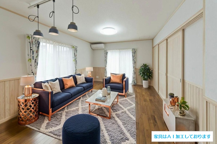S様邸の外観は、グリーンの屋根瓦と玄関廻りに敷き詰められた深みのある自然石が印象的。玄関ドアを開くと温かみのある無垢材の腰壁がホールの奥まで続いており自然と正面の飾り棚へと視線が運ばれていきます。その先にあるリビングまでの廊下には、開き戸が並んでいて生活スタイルに合わせて作られた収納棚が備え付けられております。明るいリビングに入ると、こちらにも腰壁があり和室との間仕切りである無垢材で作ったスライド建具との調和もバツグンです。