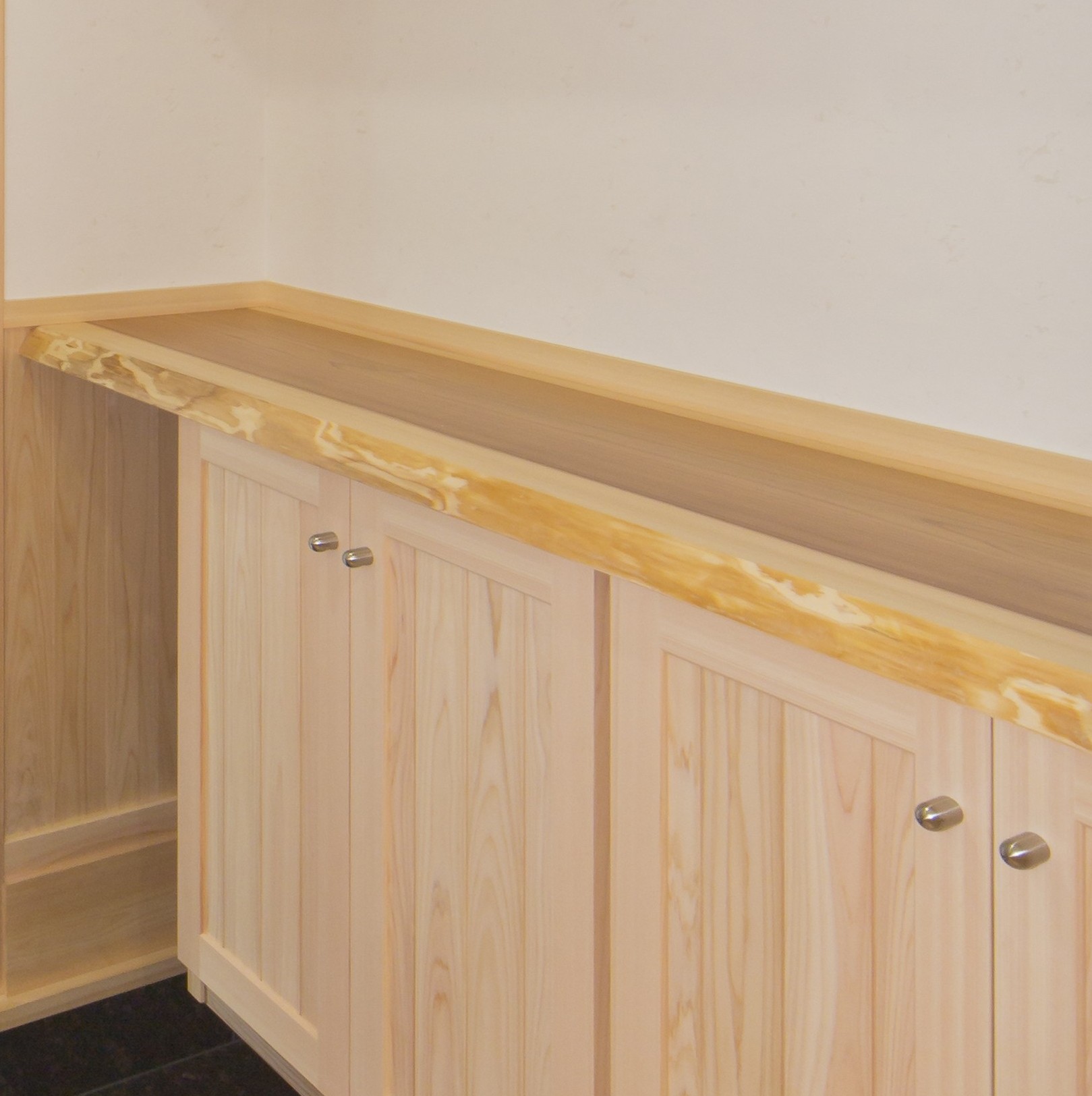 玄関までのアプローチは、将来の事を考えて階段とスロープを備えた平屋の住宅。リビングを中心に和室・プライベートルーム・収納が配置され無駄のないコンパクトなご自宅が完成いたしました。いたるところに桧や杉を使用しており、その中でも玄関の扉を開けて最初に目に入るのが、職人さん手作りの下駄箱。厚みのある杉板の天板は、年月を重ねるほど深みを増していくことでしょう。