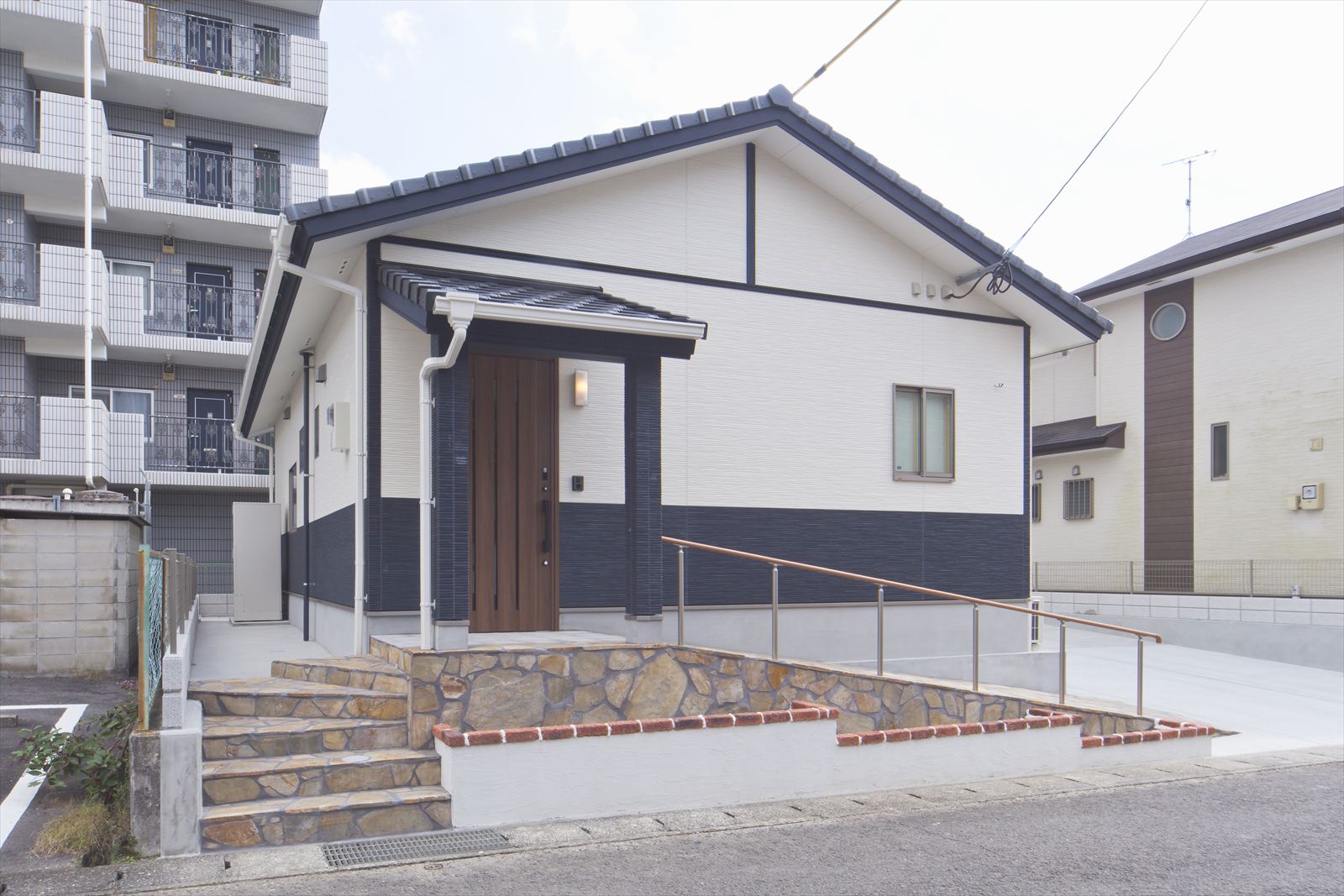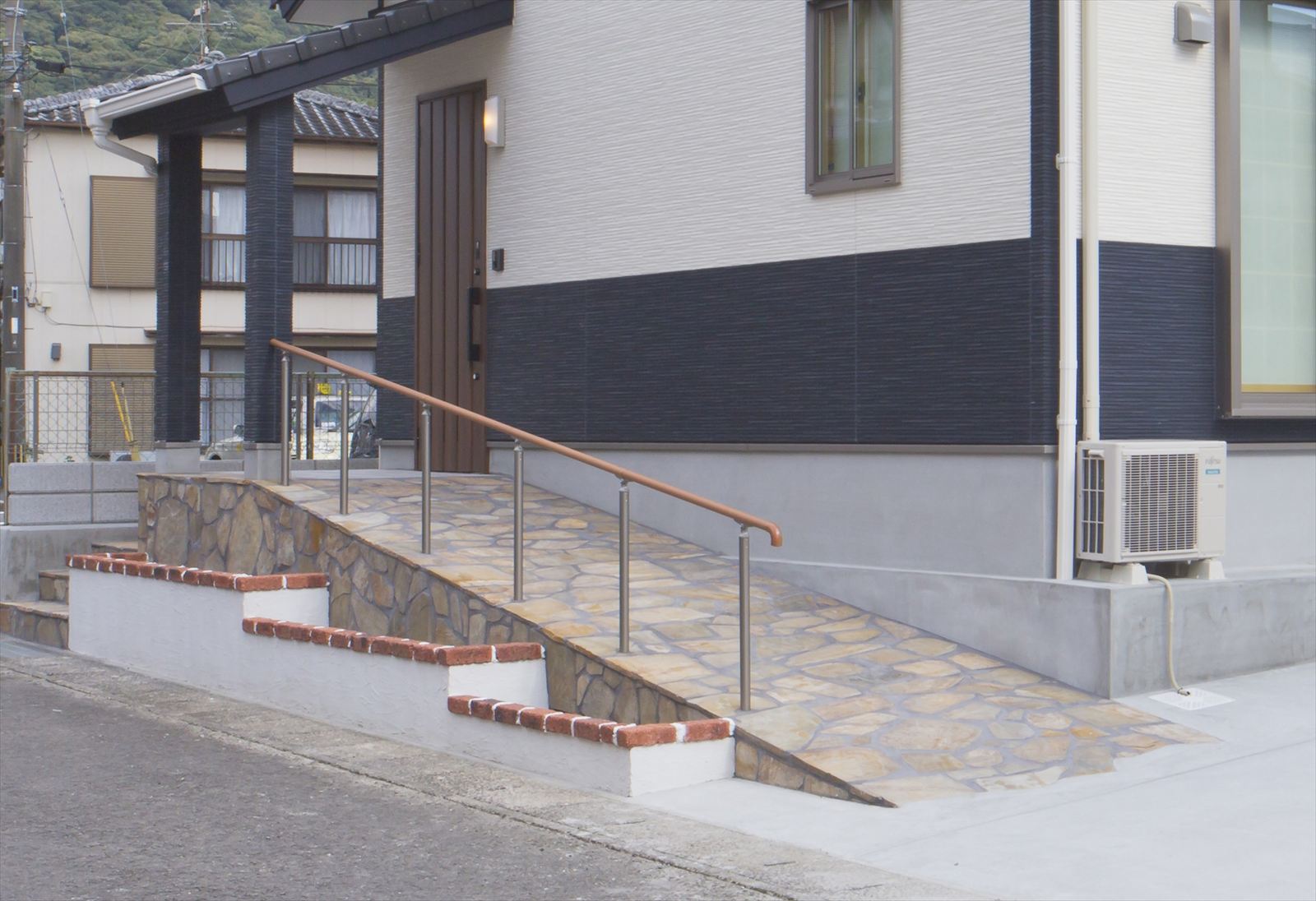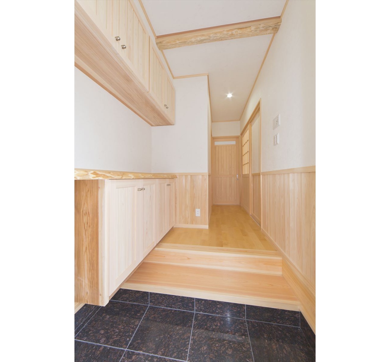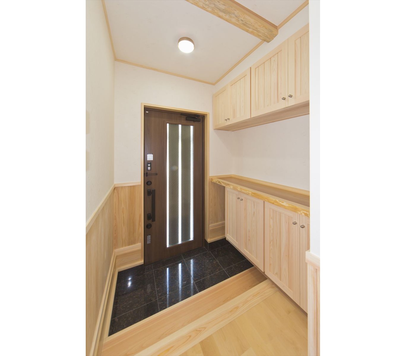 玄関までのアプローチは、将来の事を考えて階段とスロープを備えた平屋の住宅。リビングを中心に和室・プライベートルーム・収納が配置され無駄のないコンパクトなご自宅が完成いたしました。いたるところに桧や杉を使用しており、その中でも玄関の扉を開けて最初に目に入るのが、職人さん手作りの下駄箱。厚みのある杉板の天板は、年月を重ねるほど深みを増していくことでしょう。
