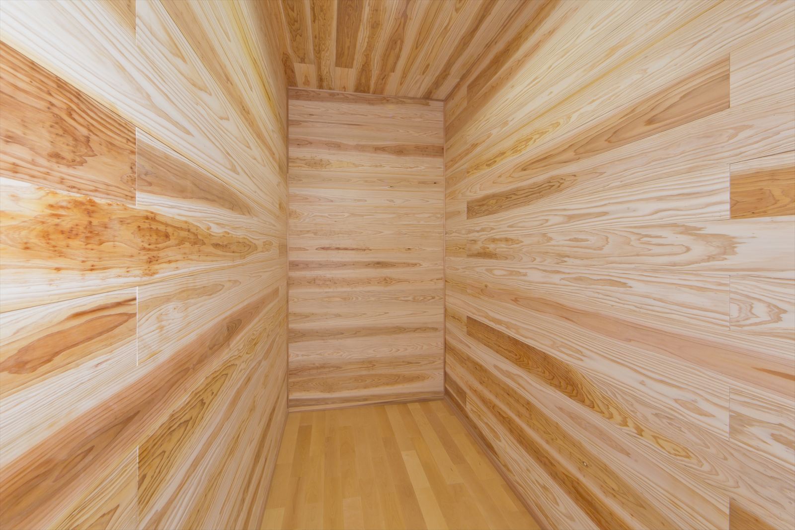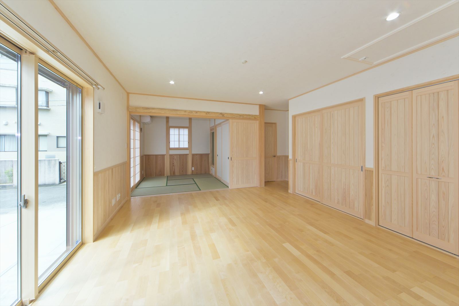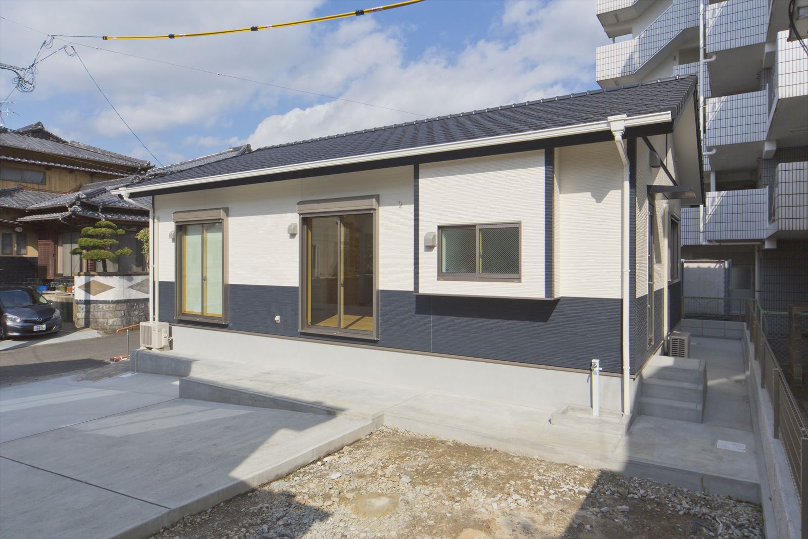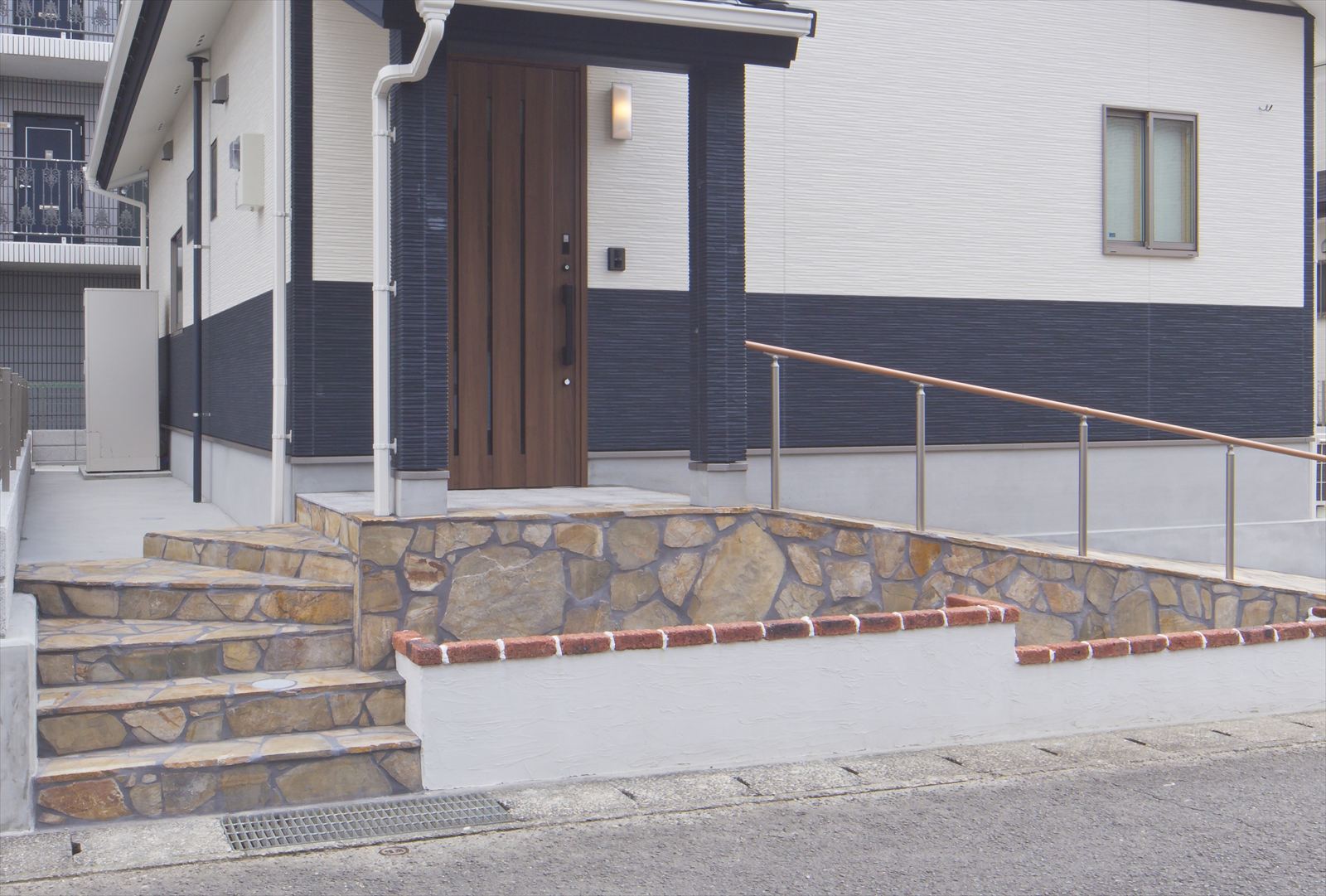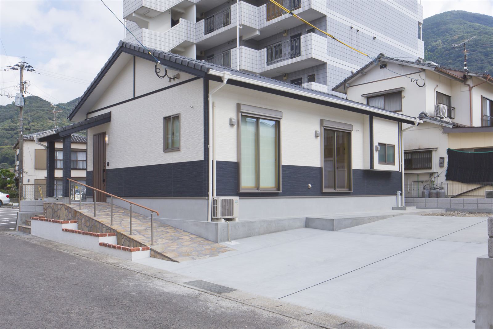 玄関までのアプローチは、将来の事を考えて階段とスロープを備えた平屋の住宅。リビングを中心に和室・プライベートルーム・収納が配置され無駄のないコンパクトなご自宅が完成いたしました。いたるところに桧や杉を使用しており、その中でも玄関の扉を開けて最初に目に入るのが、職人さん手作りの下駄箱。厚みのある杉板の天板は、年月を重ねるほど深みを増していくことでしょう。
